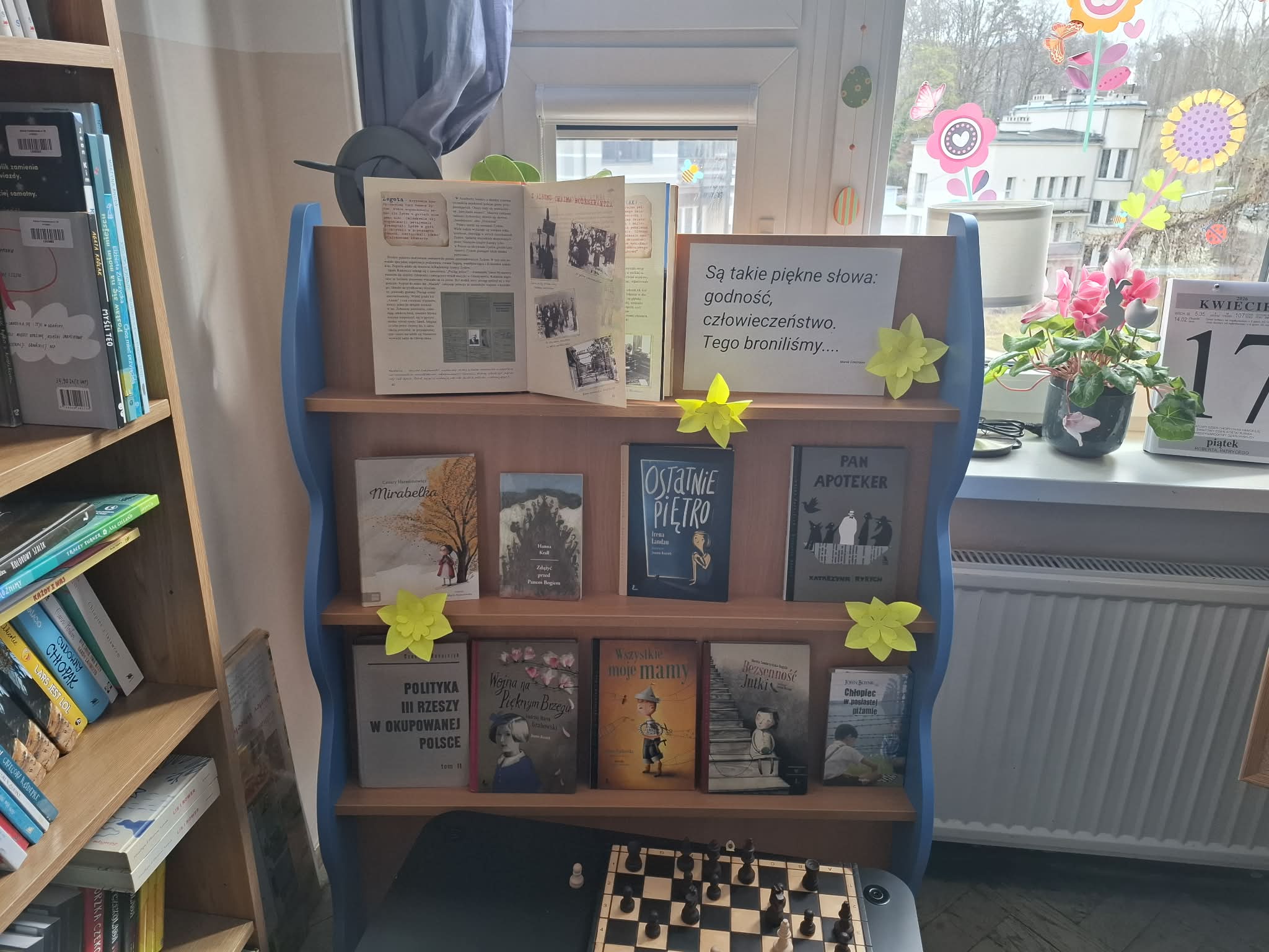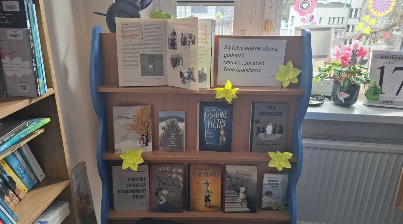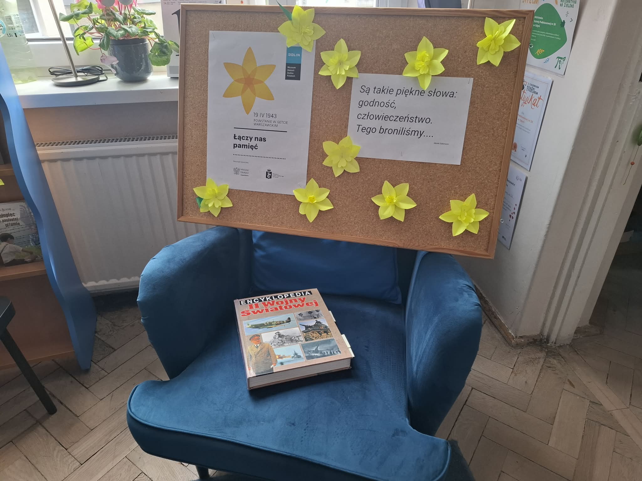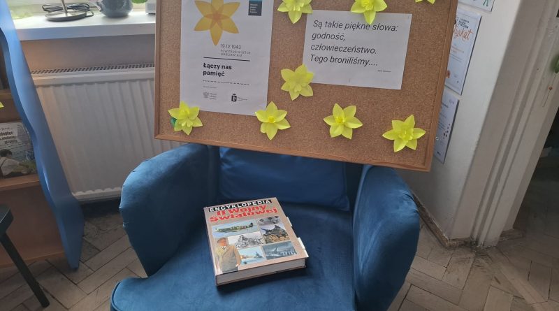Zapraszamy też zainteresowanych uczniów do biblioteki, gdzie przygotowano: wystawkę literacką w postaci zbioru książek historycznych oraz poruszającej beletrystyki związanej z tematyką Holokaustu i powstania oraz gazetkę nawiązującą do rocznicy.Każdy odwiedzający będzie mógł zobaczyć (lub samodzielnie wykonać) papierowe przypinki, które są znakiem naszej pamięci i szacunku.