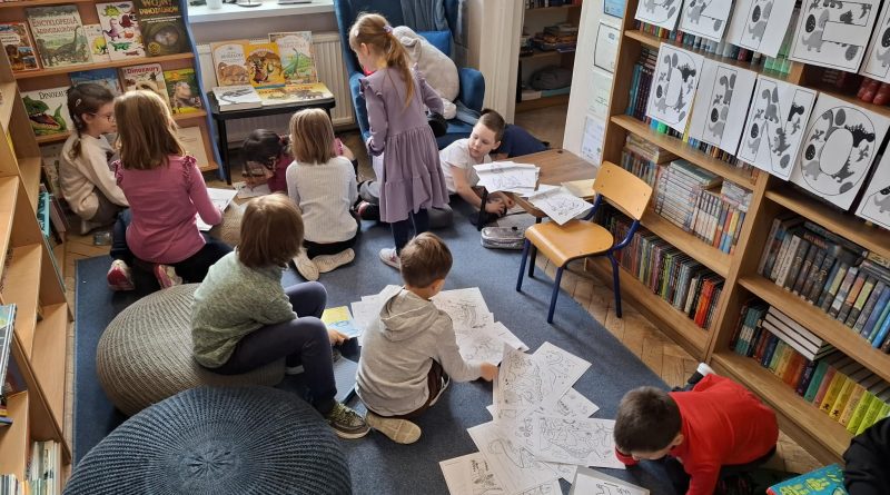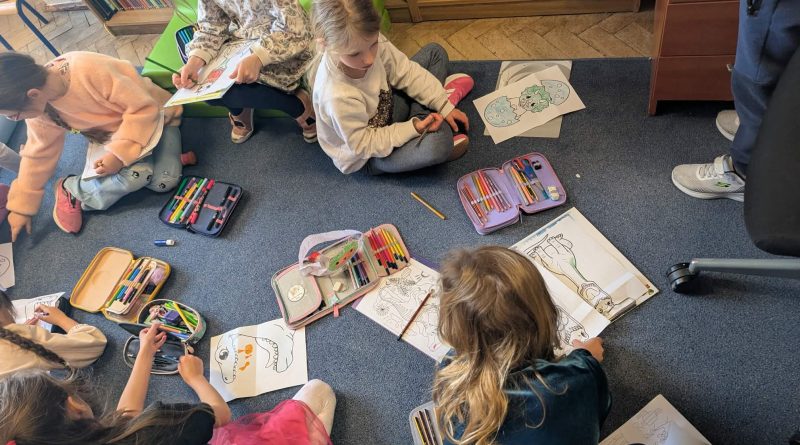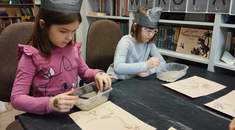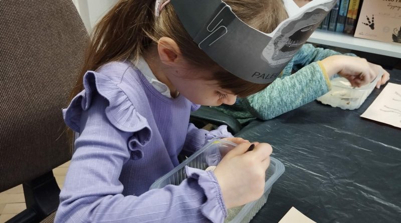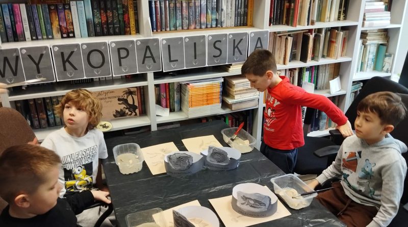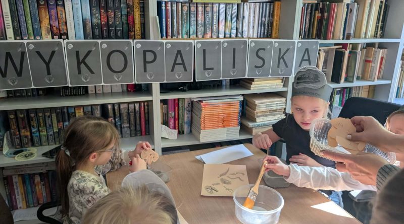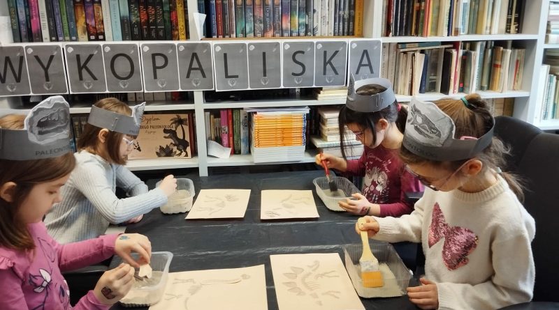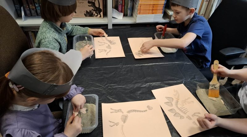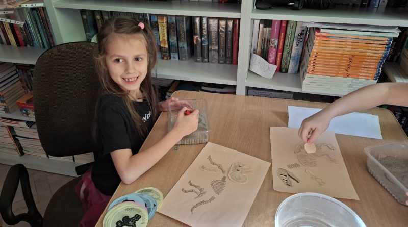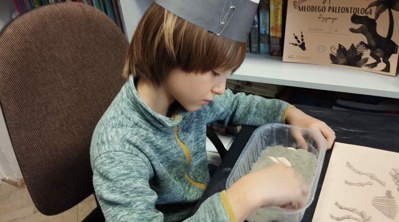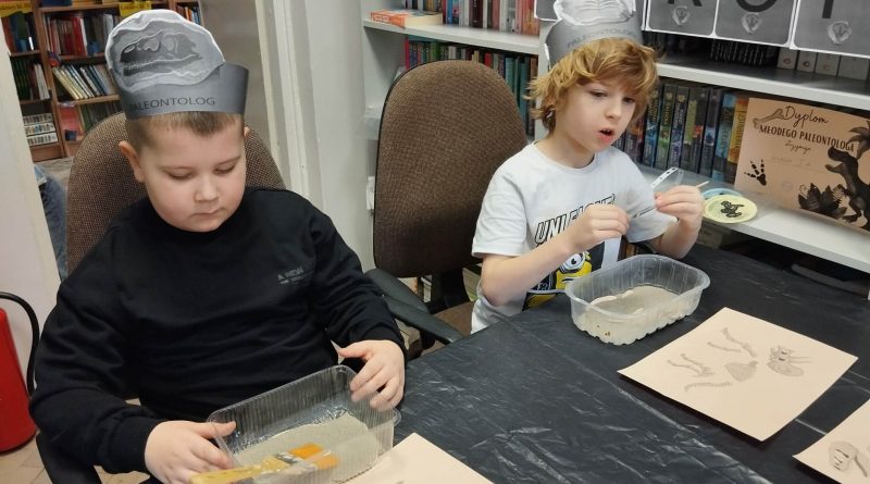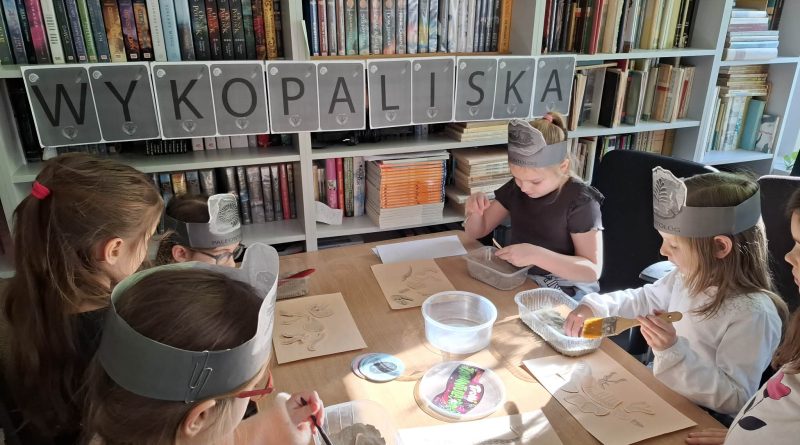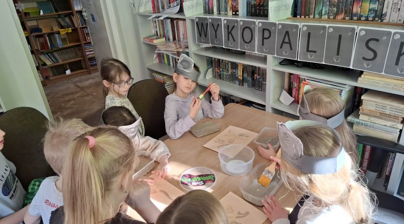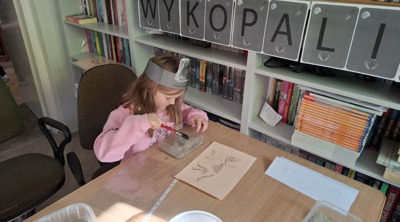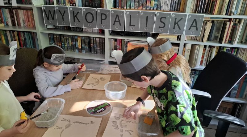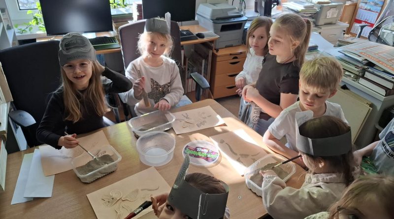Po części czytelniczej nadszedł czas na twórczą zabawę. Na dzieci czekały rozkładane „dinozaurowe” kolorowanki, a także wyjątkowe zajęcia w roli młodych paleontologów. Uczniowie, korzystając z pędzelków, odkopywali z piasku fragmenty szkieletów dinozaurów, a następnie składali je w całość, jak prawdziwi naukowcy.