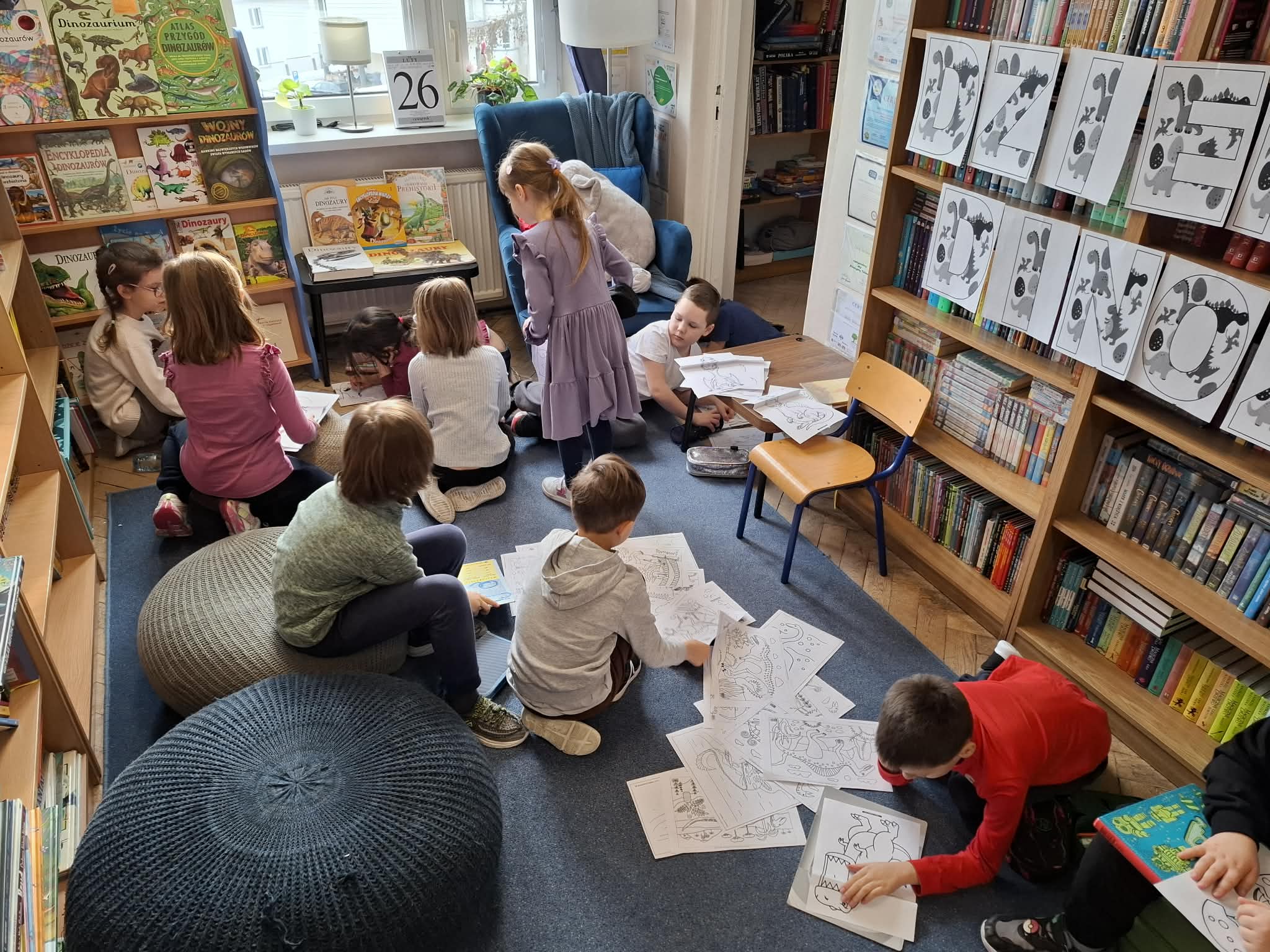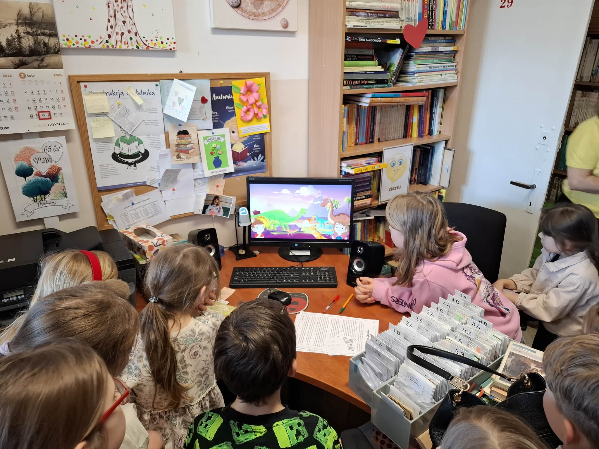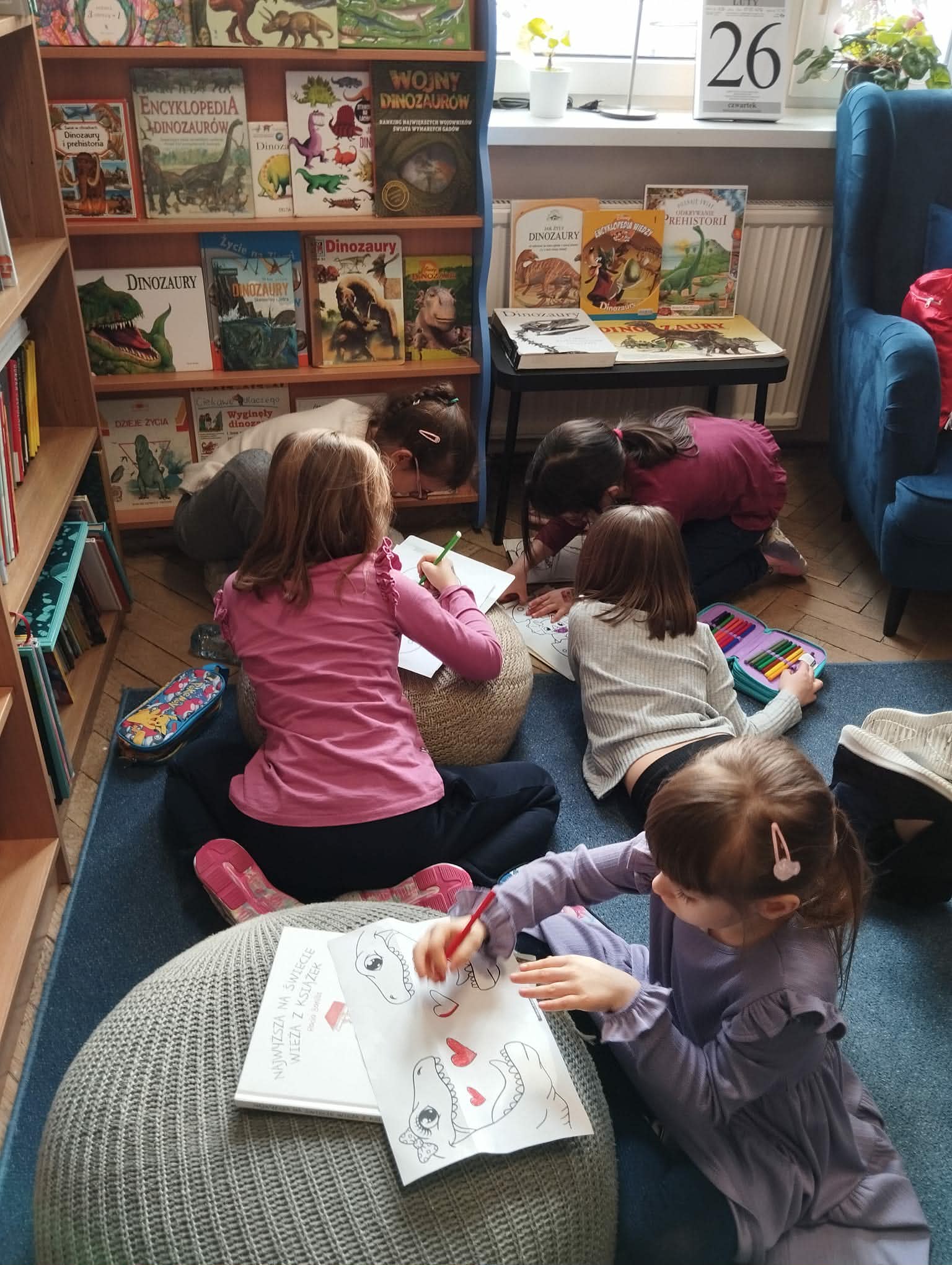 W szkolnej bibliotece klasy 1a i 1b świętowały Dzień Dinozaura, biorąc udział w pełnych wrażeń i ciekawostek zajęciach tematycznych. Na początku uczniowie obejrzeli wystawkę książek o dinozaurach oraz kolorowe ilustracje przedstawiające różne gatunki prehistorycznych stworzeń, wraz z podziałem na dinozaury roślinożerne i mięsożerne. Następnie dzieci obejrzały krótki film edukacyjny, z którego dowiedziały się, jakie były możliwe przyczyny wyginięcia dinozaurów.