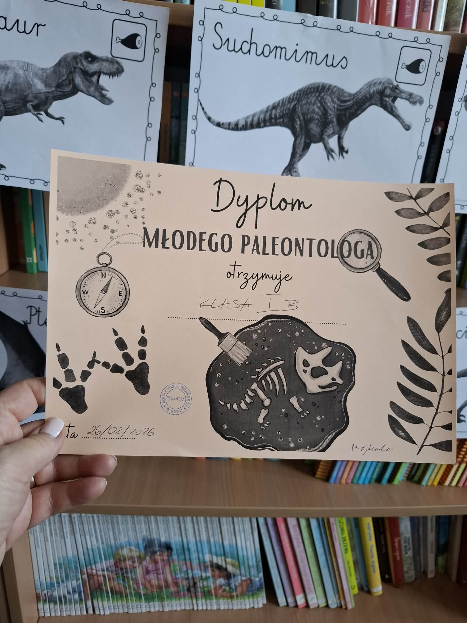 Na zakończenie każdy uczestnik otrzymał kolorową odznakę Małego Paleontologa, a dla obu klas przygotowano okolicznościowe dyplomy, które będą miłą pamiątką po pełnym emocji i świetnej zabawy dniu.