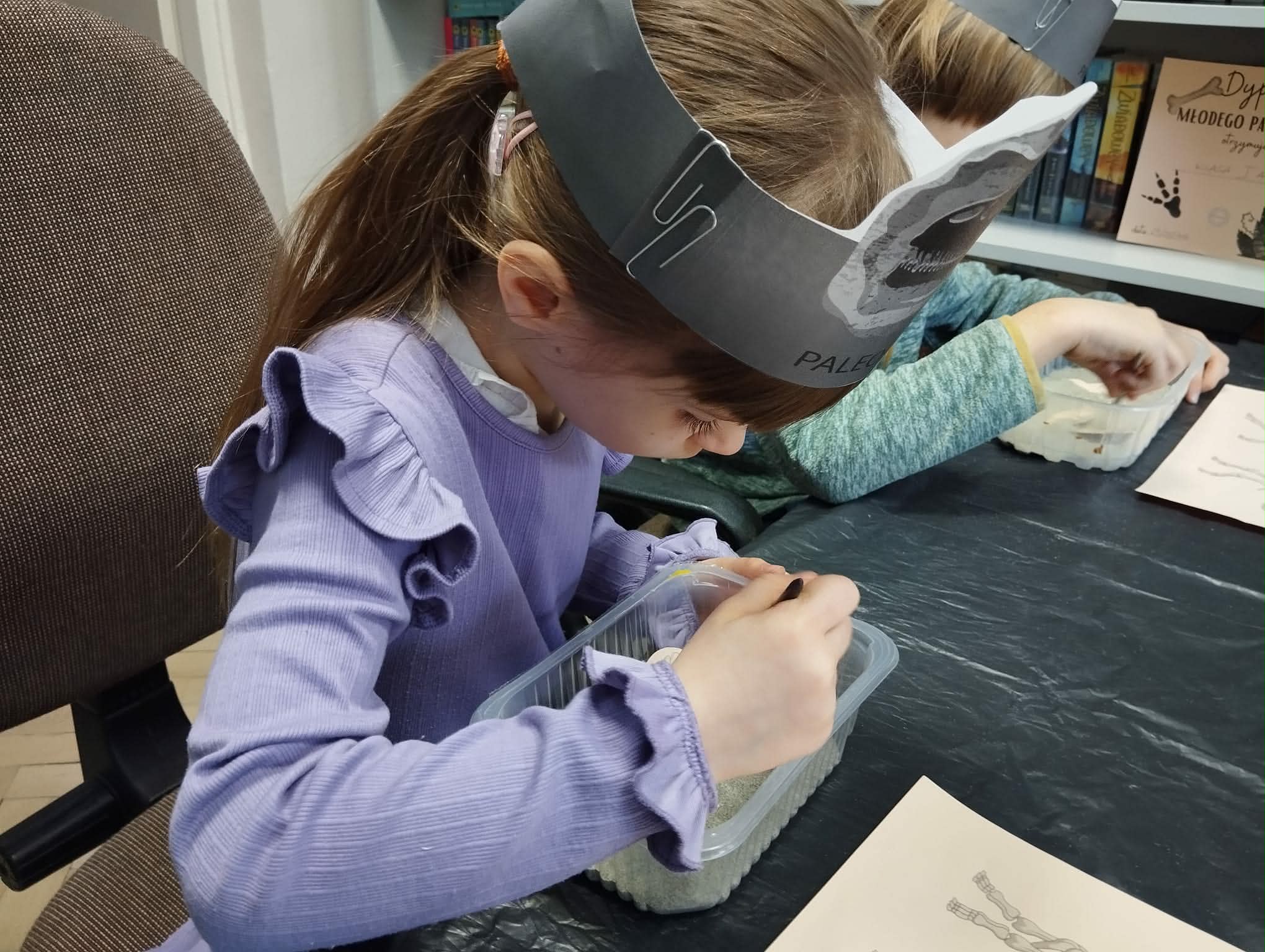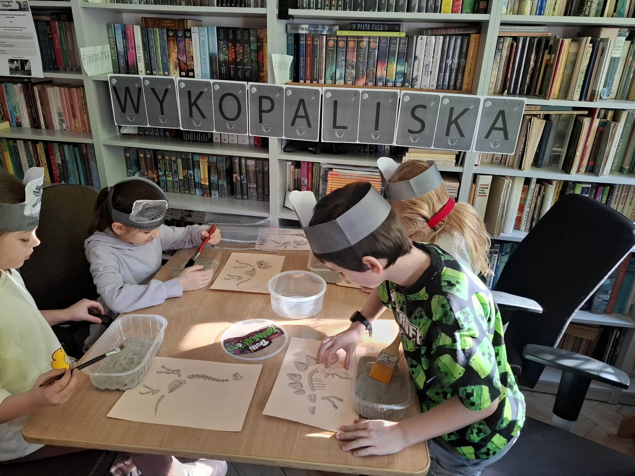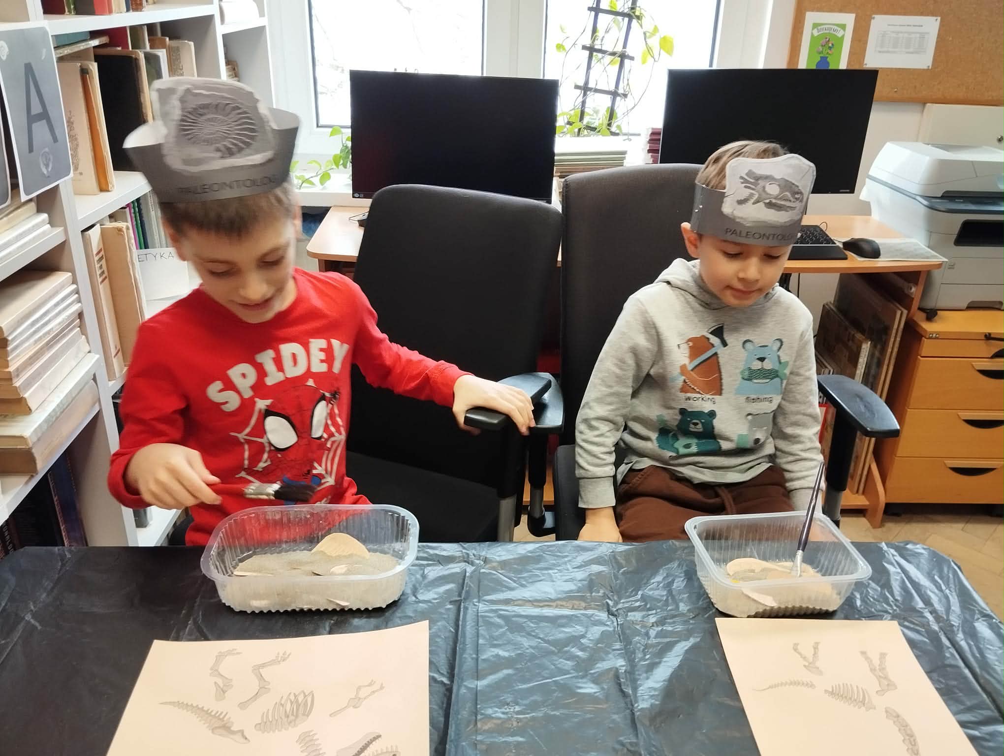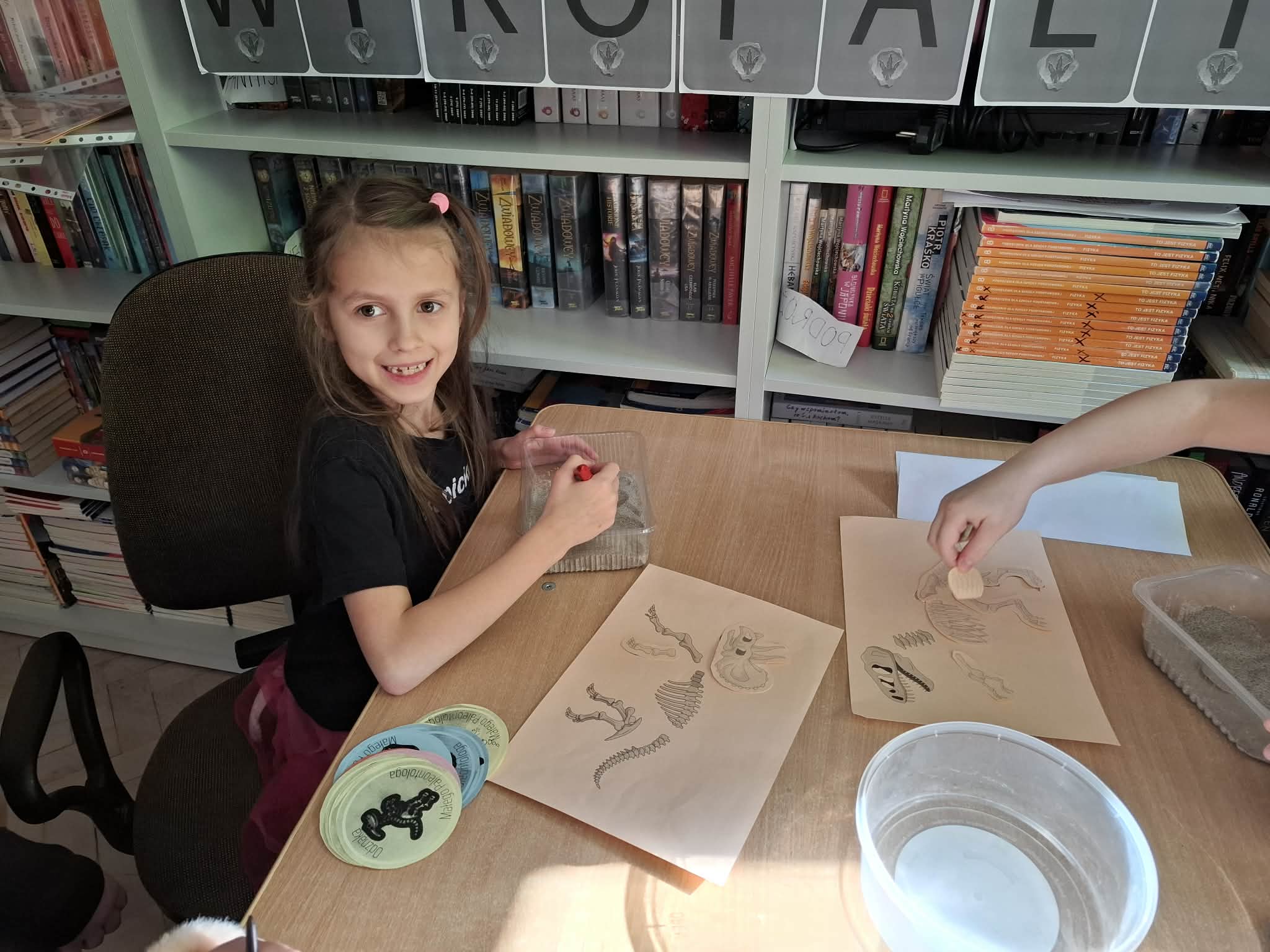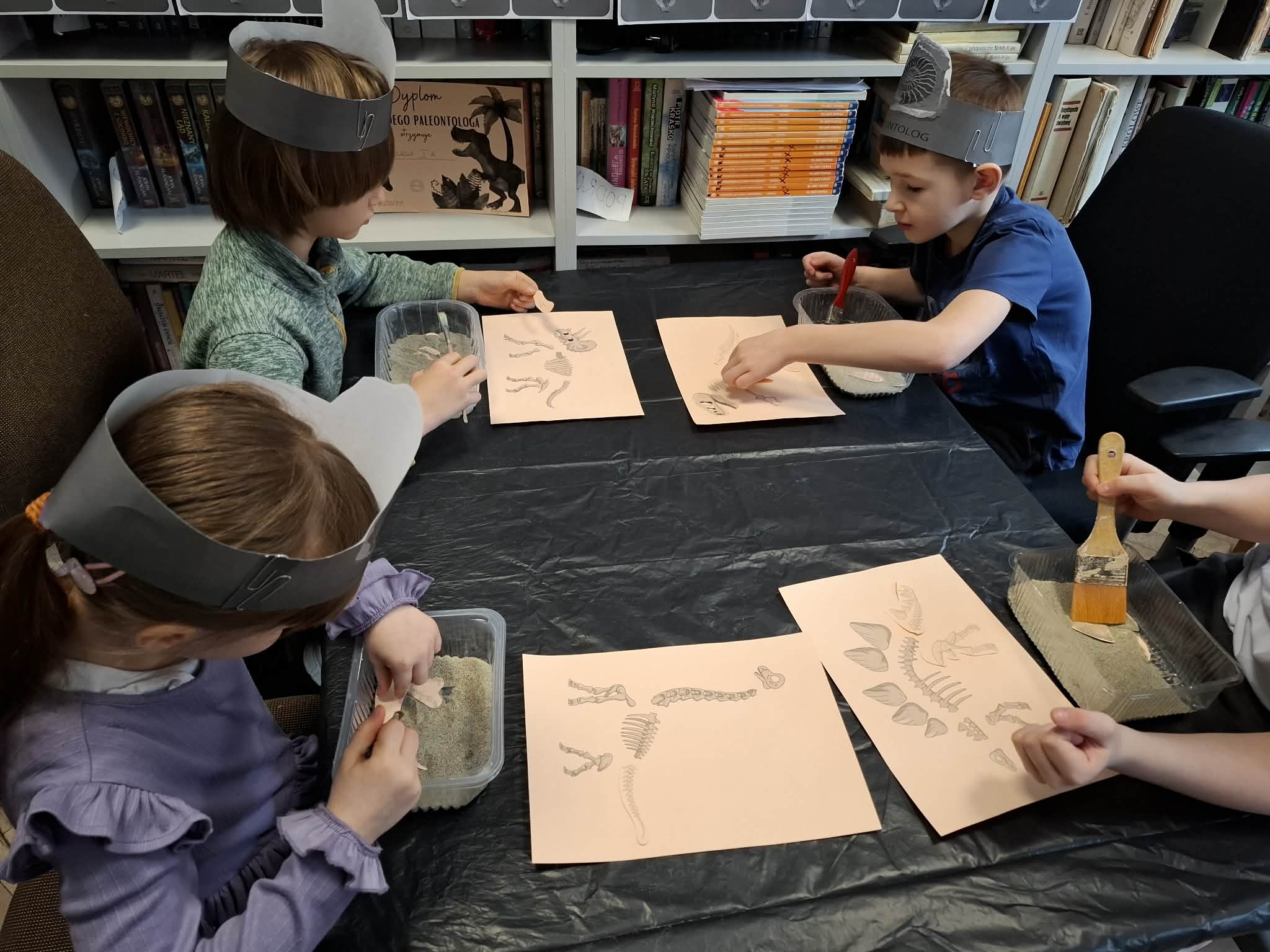 Po części czytelniczej nadszedł czas na twórczą zabawę. Na dzieci czekały rozkładane „dinozaurowe” kolorowanki, a także wyjątkowe zajęcia w roli młodych paleontologów. Uczniowie, korzystając z pędzelków, odkopywali z piasku fragmenty szkieletów dinozaurów, a następnie składali je w całość, jak prawdziwi naukowcy.