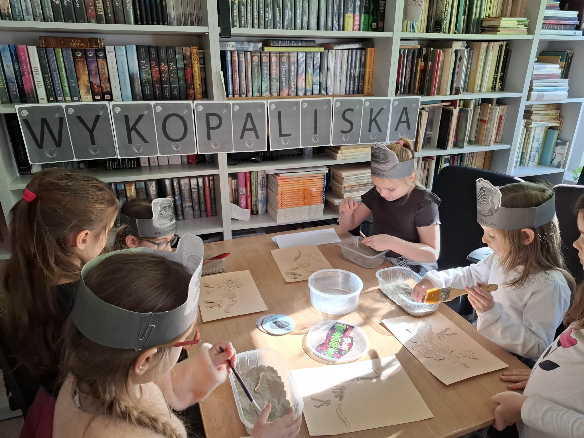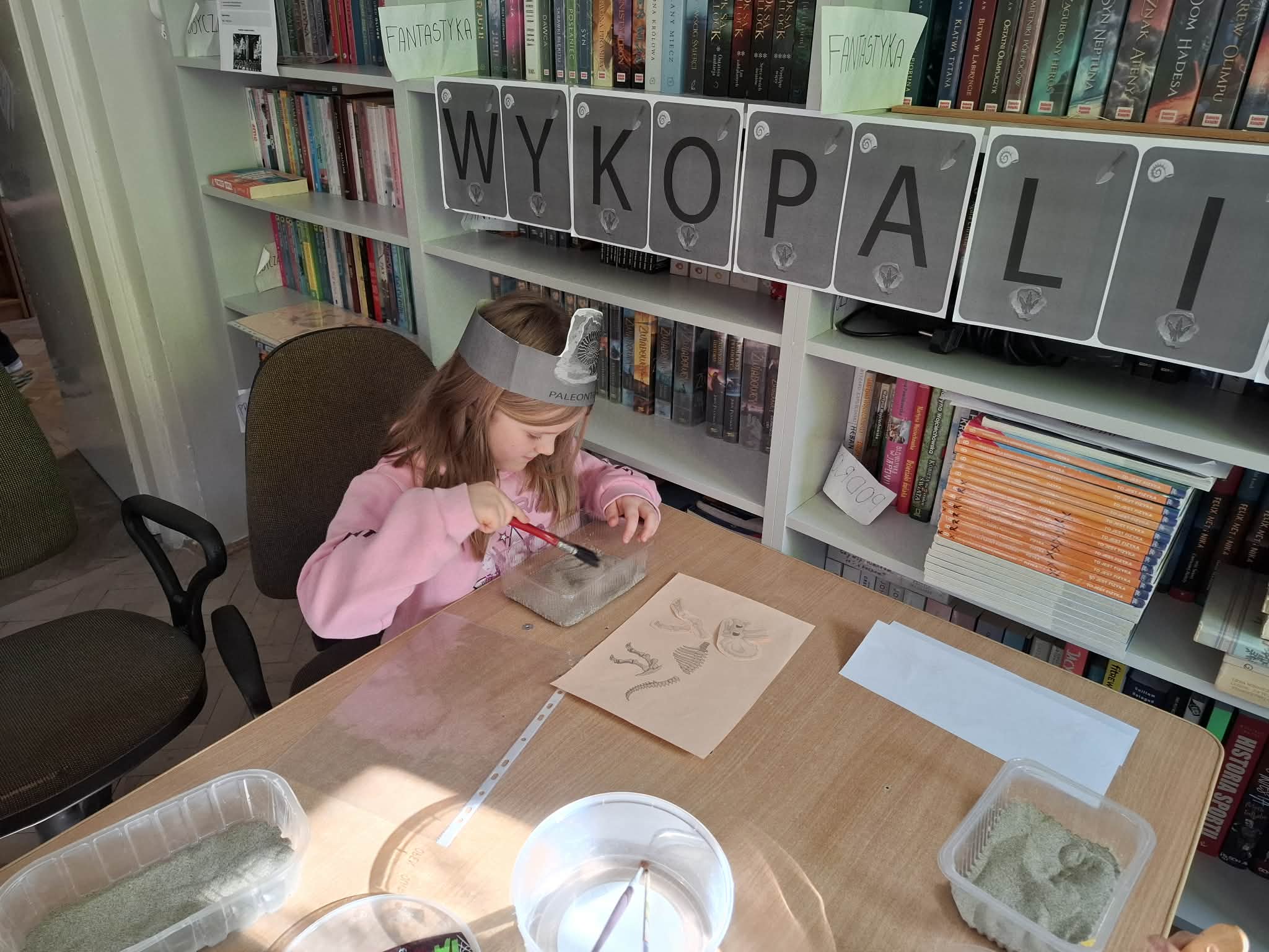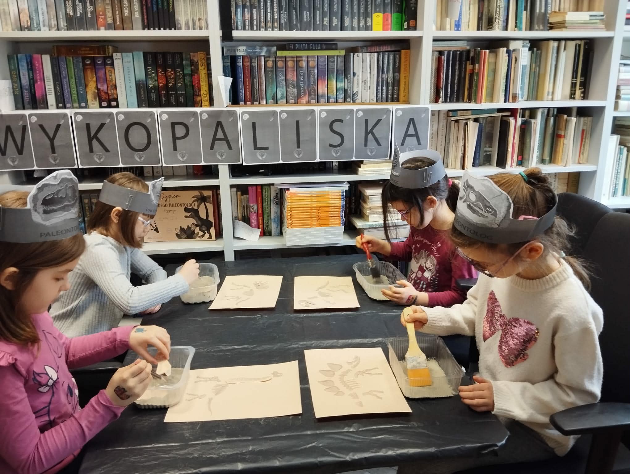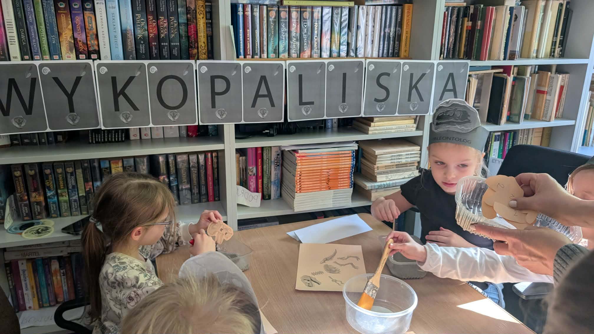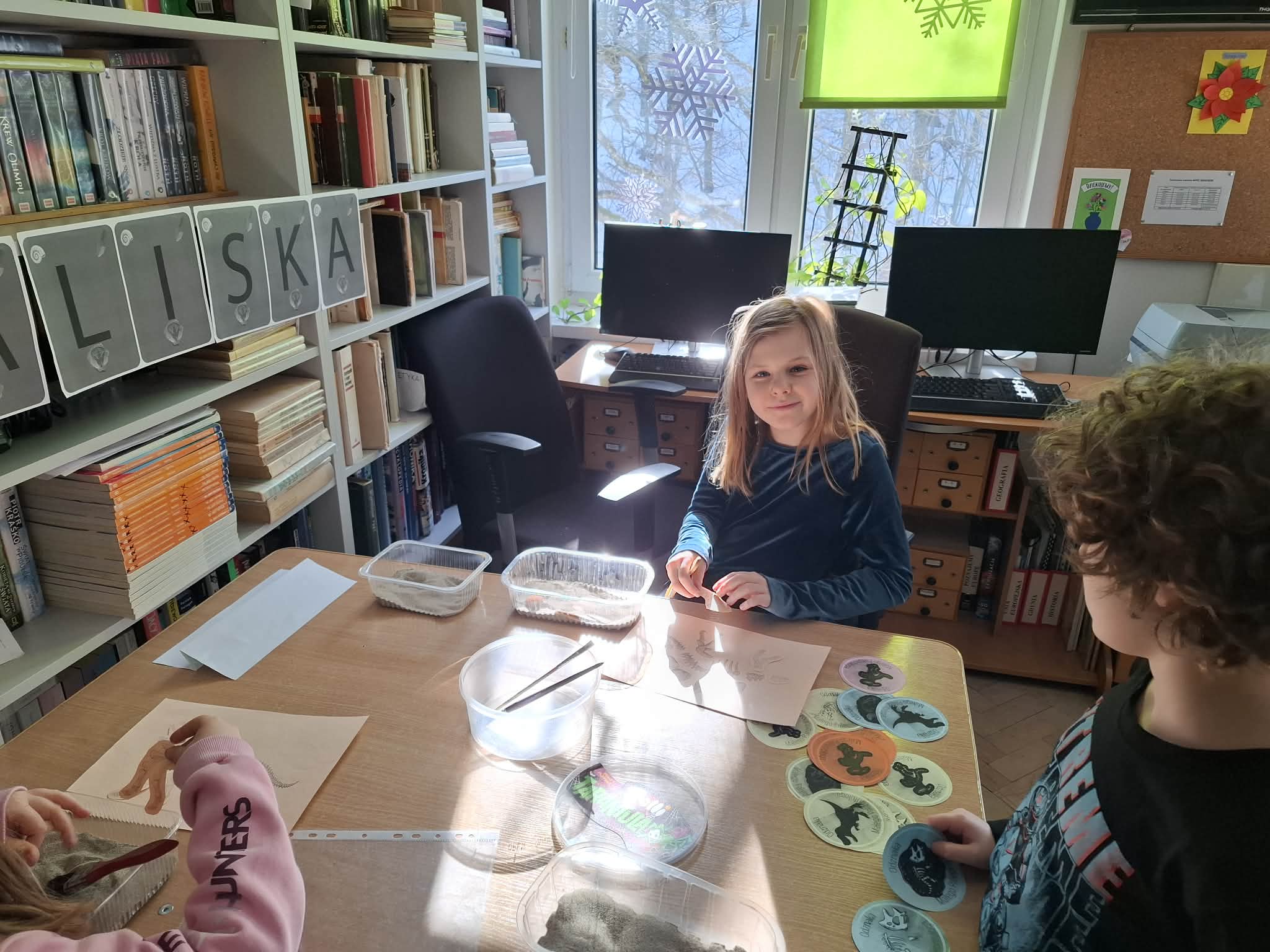 Po części czytelniczej nadszedł czas na twórczą zabawę. Na dzieci czekały rozkładane „dinozaurowe” kolorowanki, a także wyjątkowe zajęcia w roli młodych paleontologów. Uczniowie, korzystając z pędzelków, odkopywali z piasku fragmenty szkieletów dinozaurów, a następnie składali je w całość, jak prawdziwi naukowcy.
