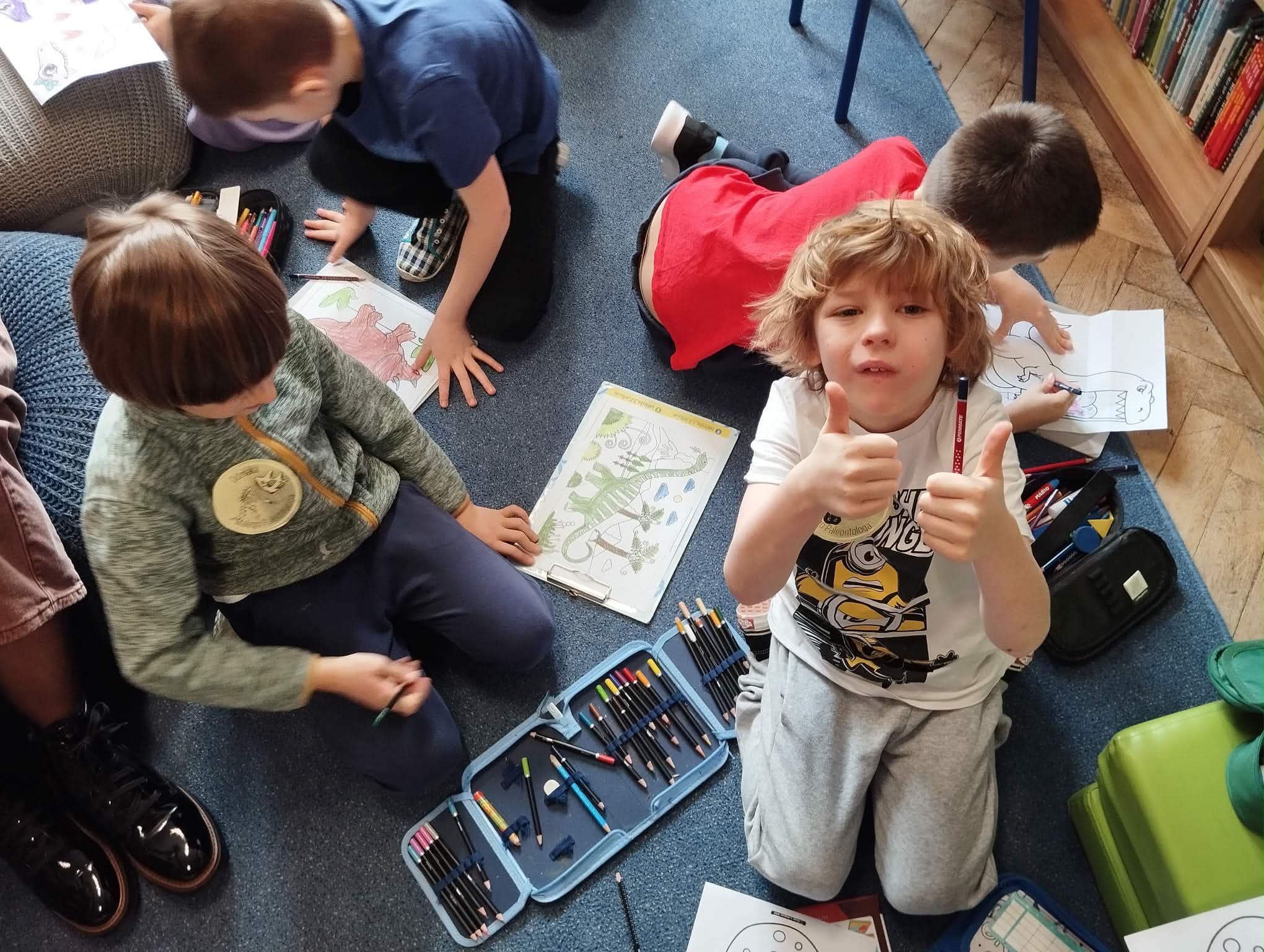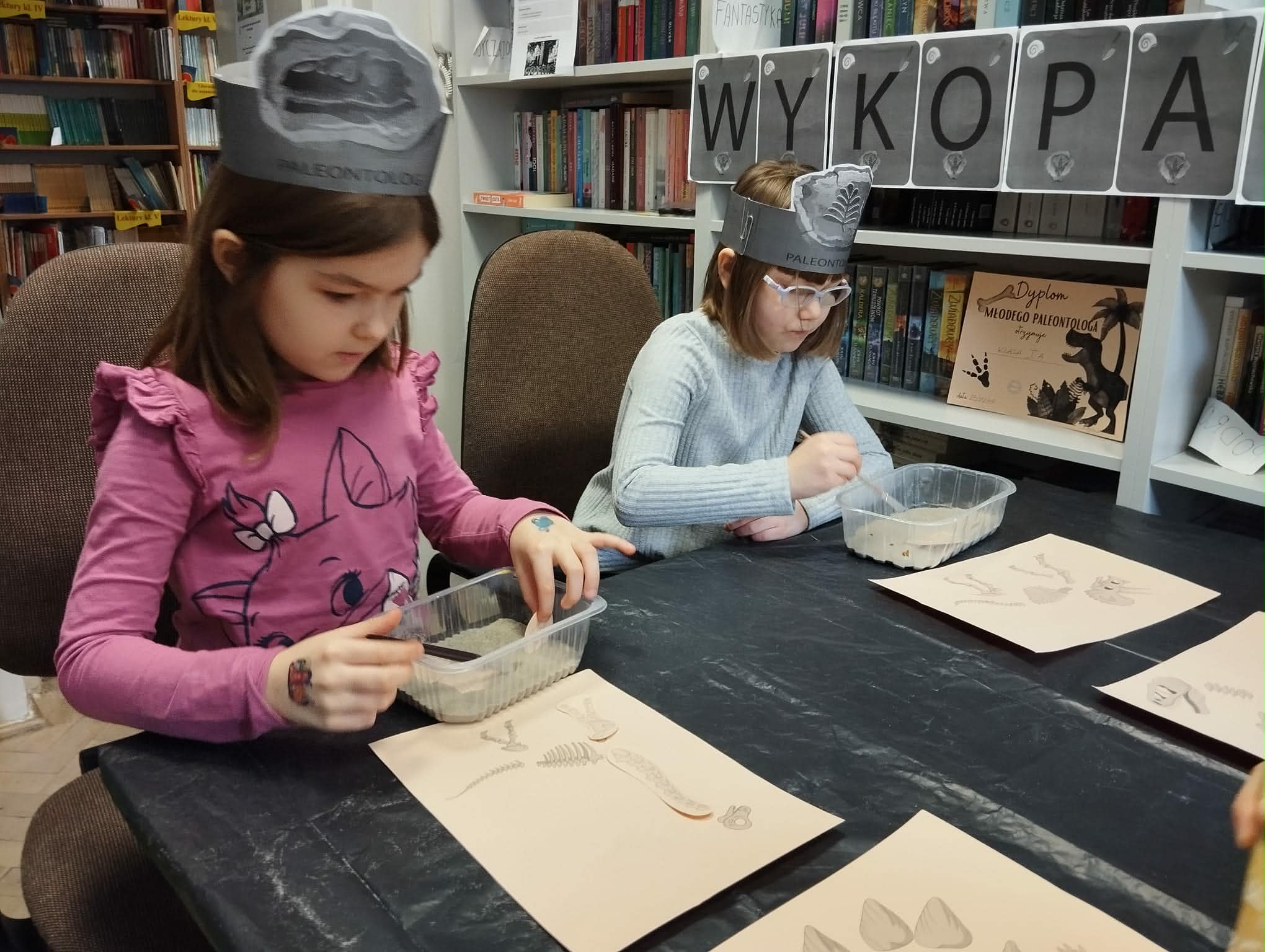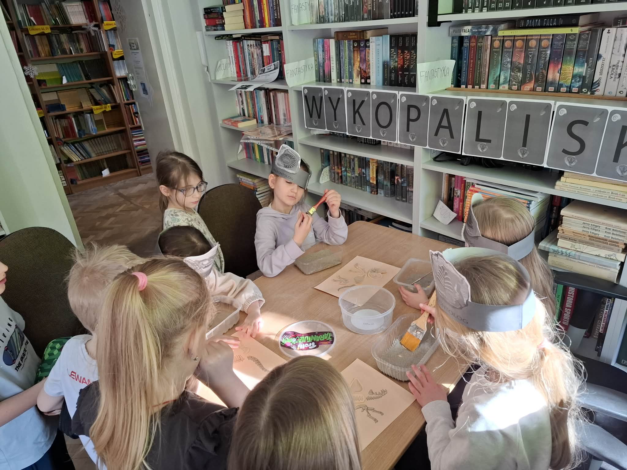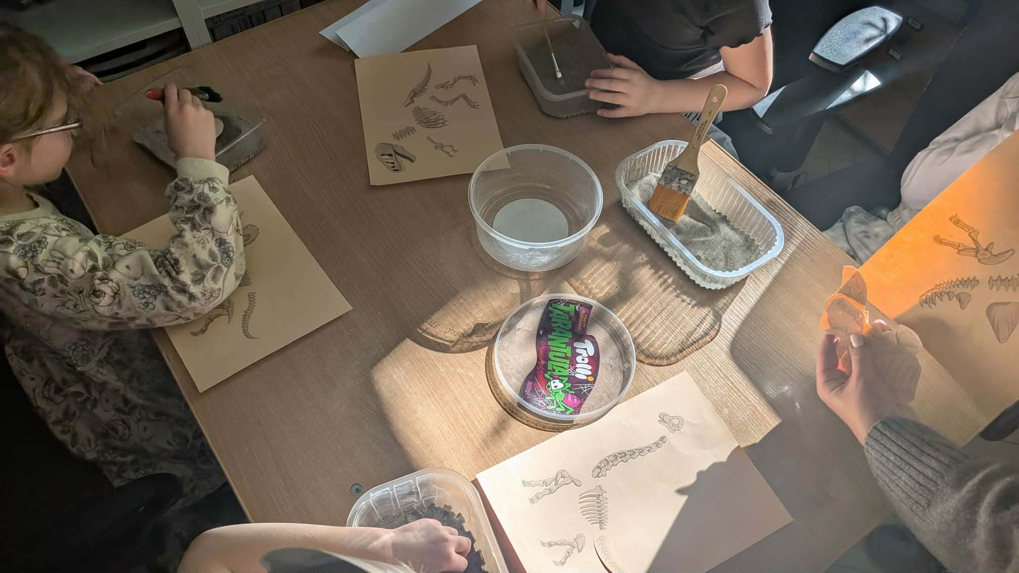 Po części czytelniczej nadszedł czas na twórczą zabawę. Na dzieci czekały rozkładane „dinozaurowe” kolorowanki, a także wyjątkowe zajęcia w roli młodych paleontologów. Uczniowie, korzystając z pędzelków, odkopywali z piasku fragmenty szkieletów dinozaurów, a następnie składali je w całość, jak prawdziwi naukowcy.