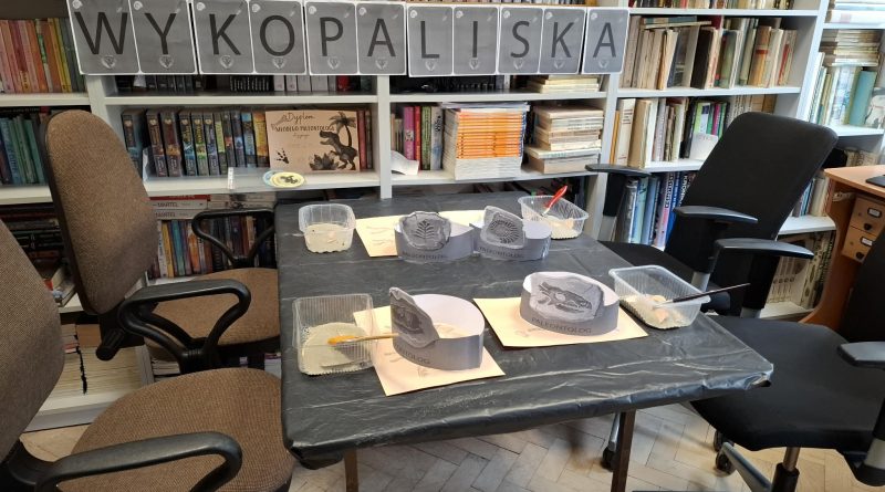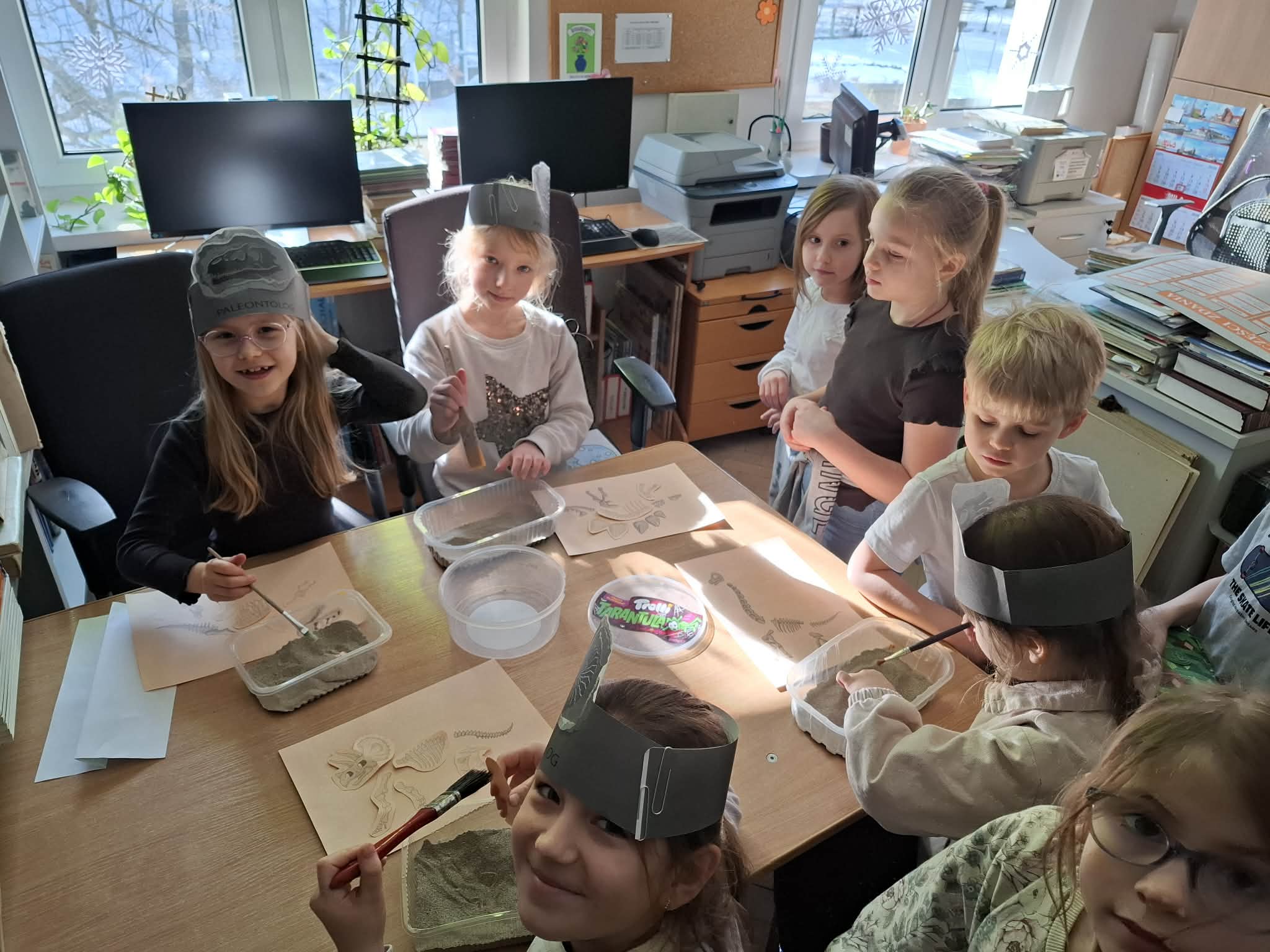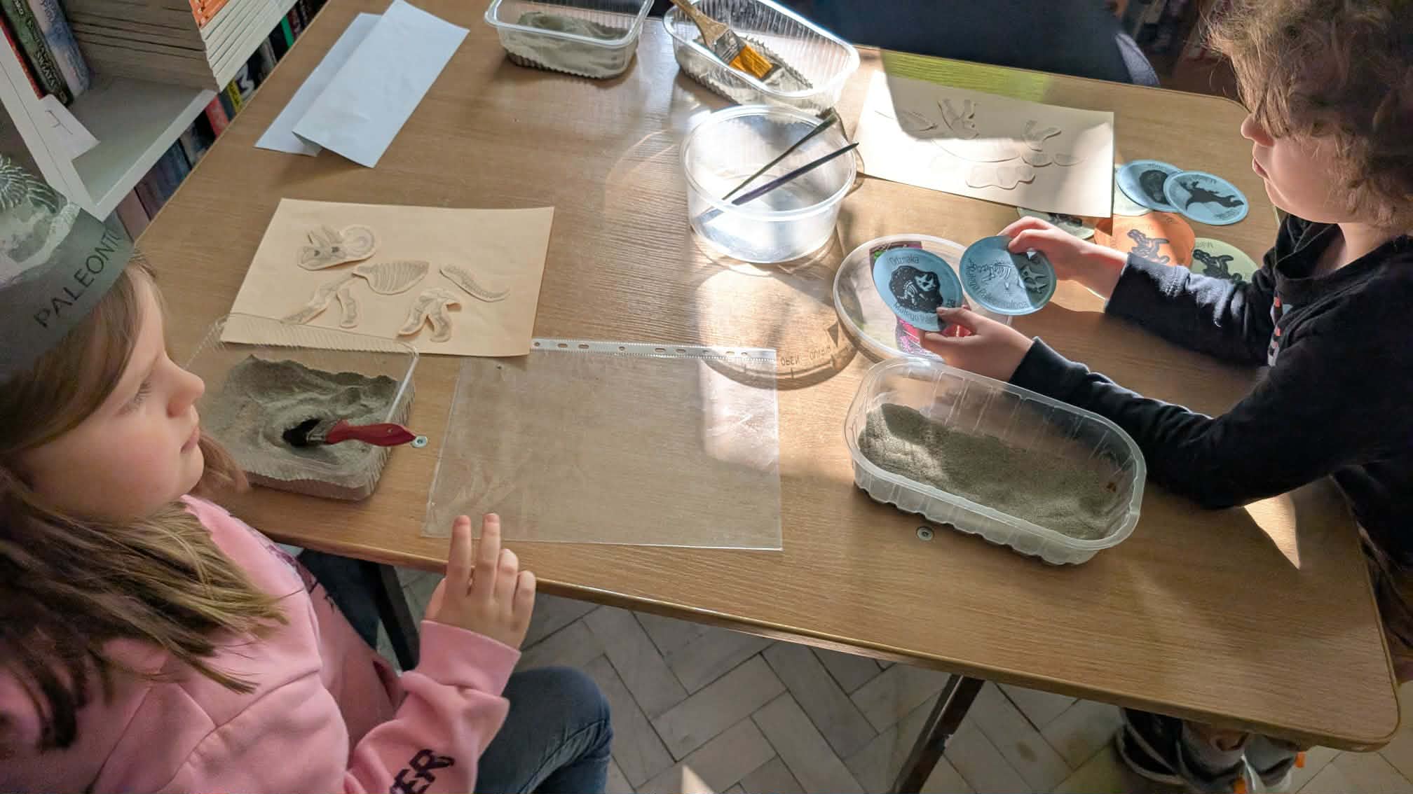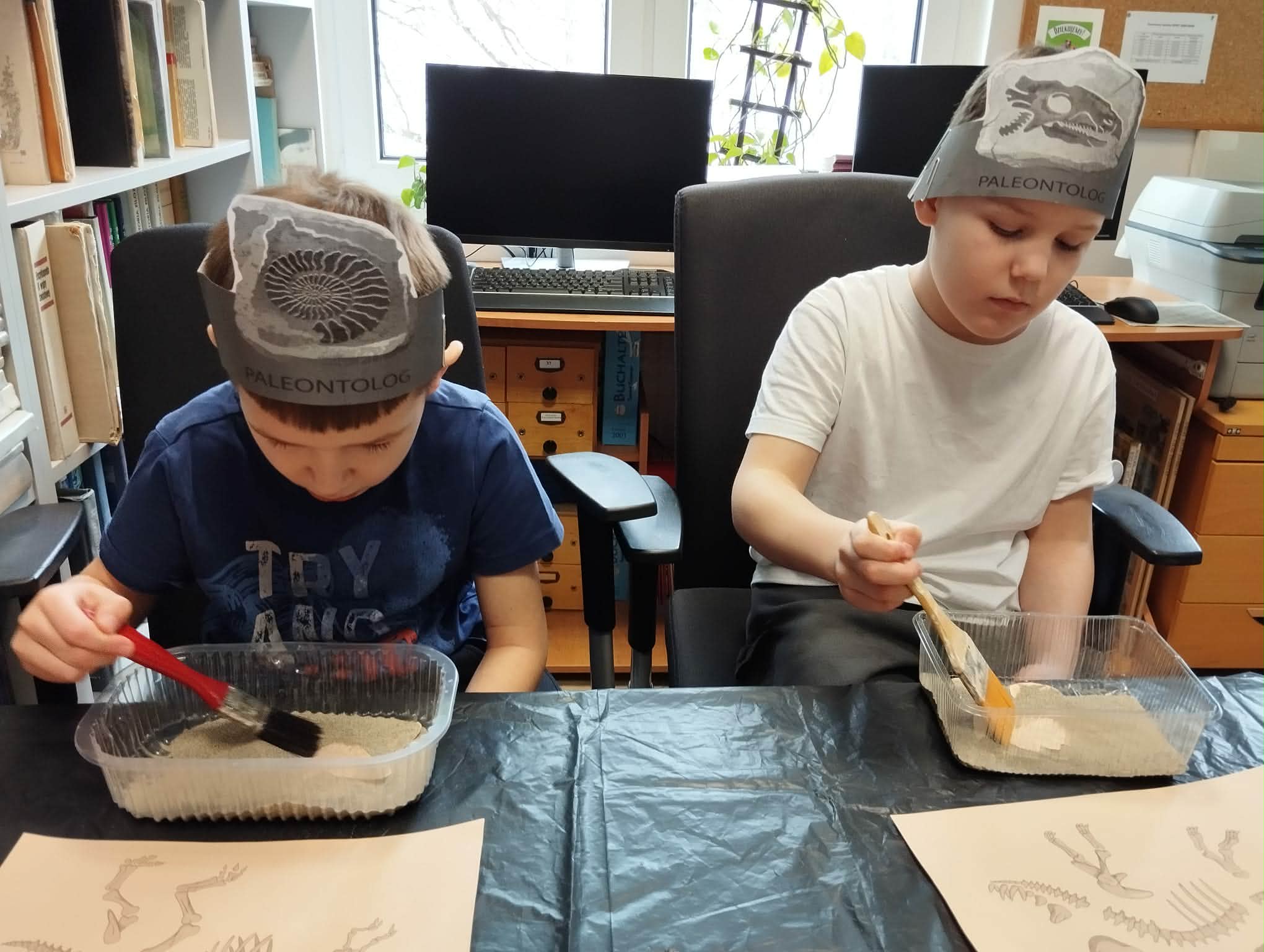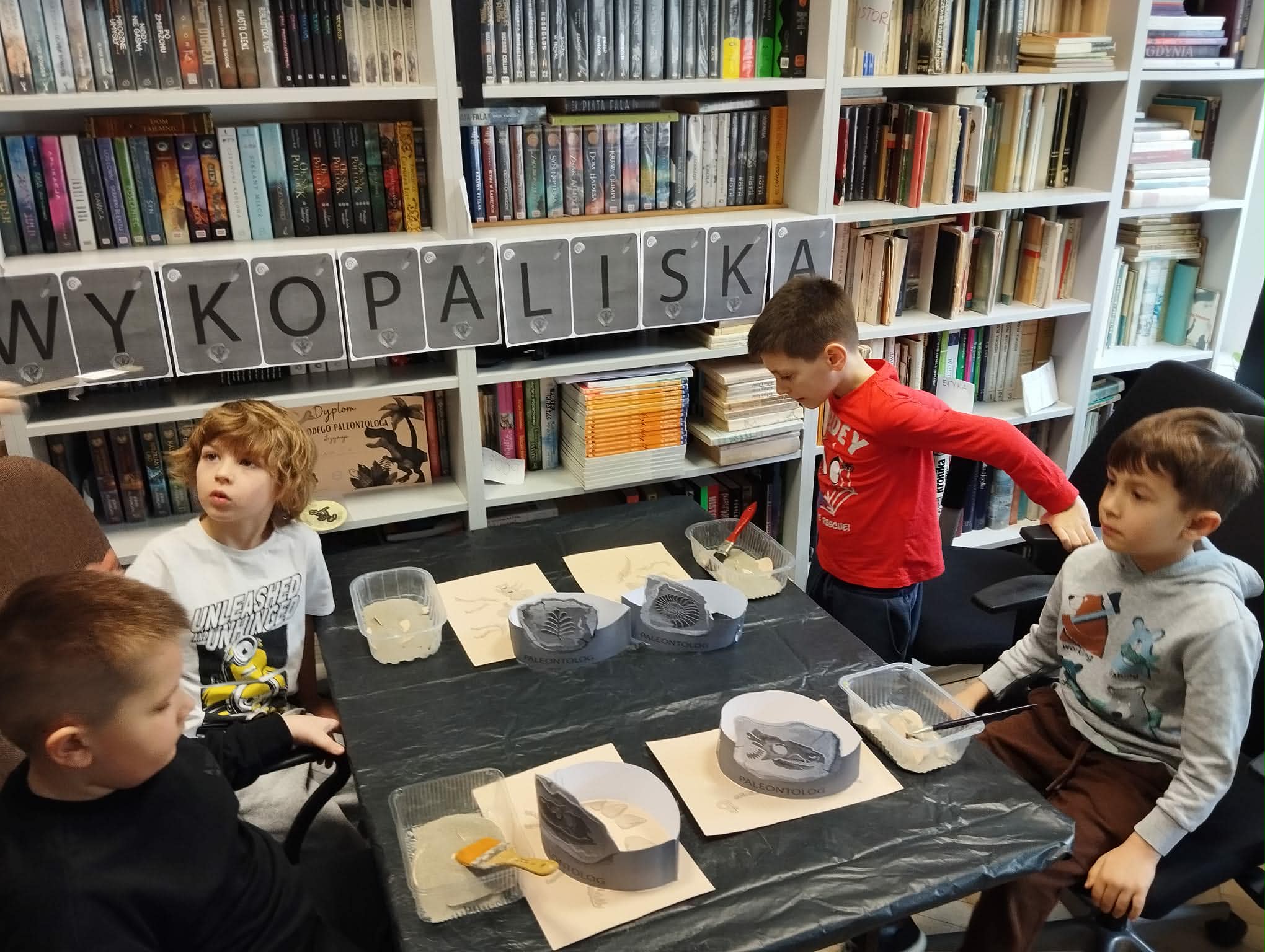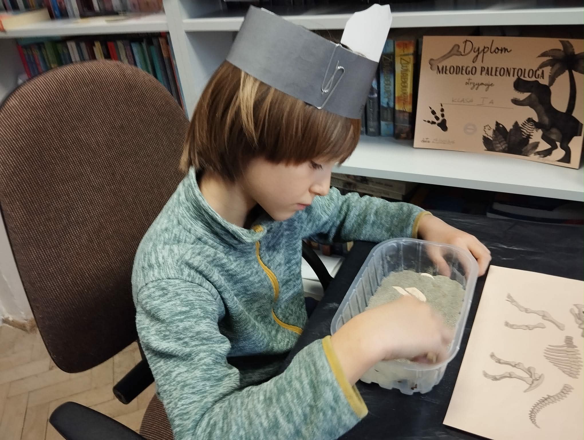 Po części czytelniczej nadszedł czas na twórczą zabawę. Na dzieci czekały rozkładane „dinozaurowe” kolorowanki, a także wyjątkowe zajęcia w roli młodych paleontologów. Uczniowie, korzystając z pędzelków, odkopywali z piasku fragmenty szkieletów dinozaurów, a następnie składali je w całość, jak prawdziwi naukowcy.