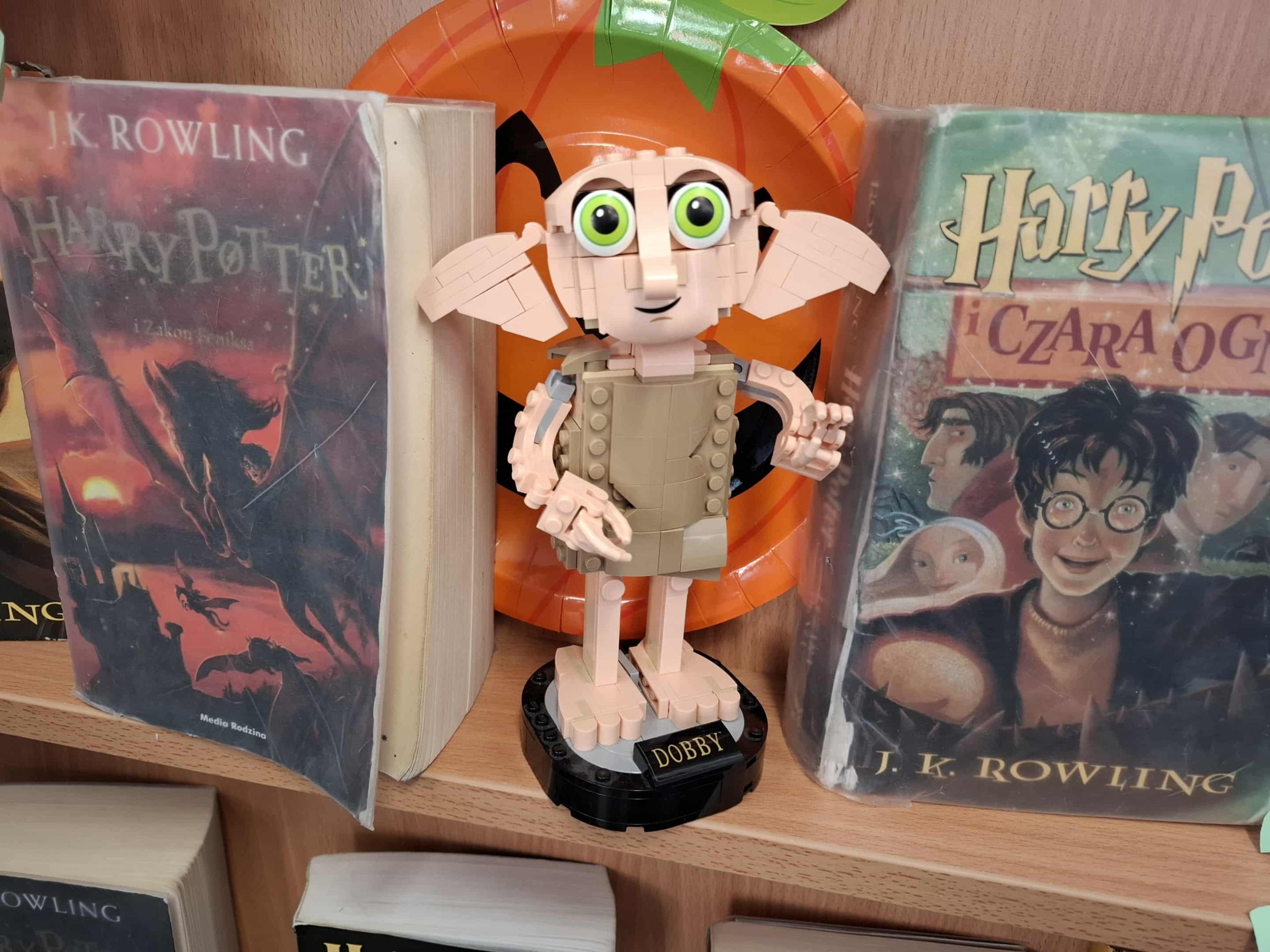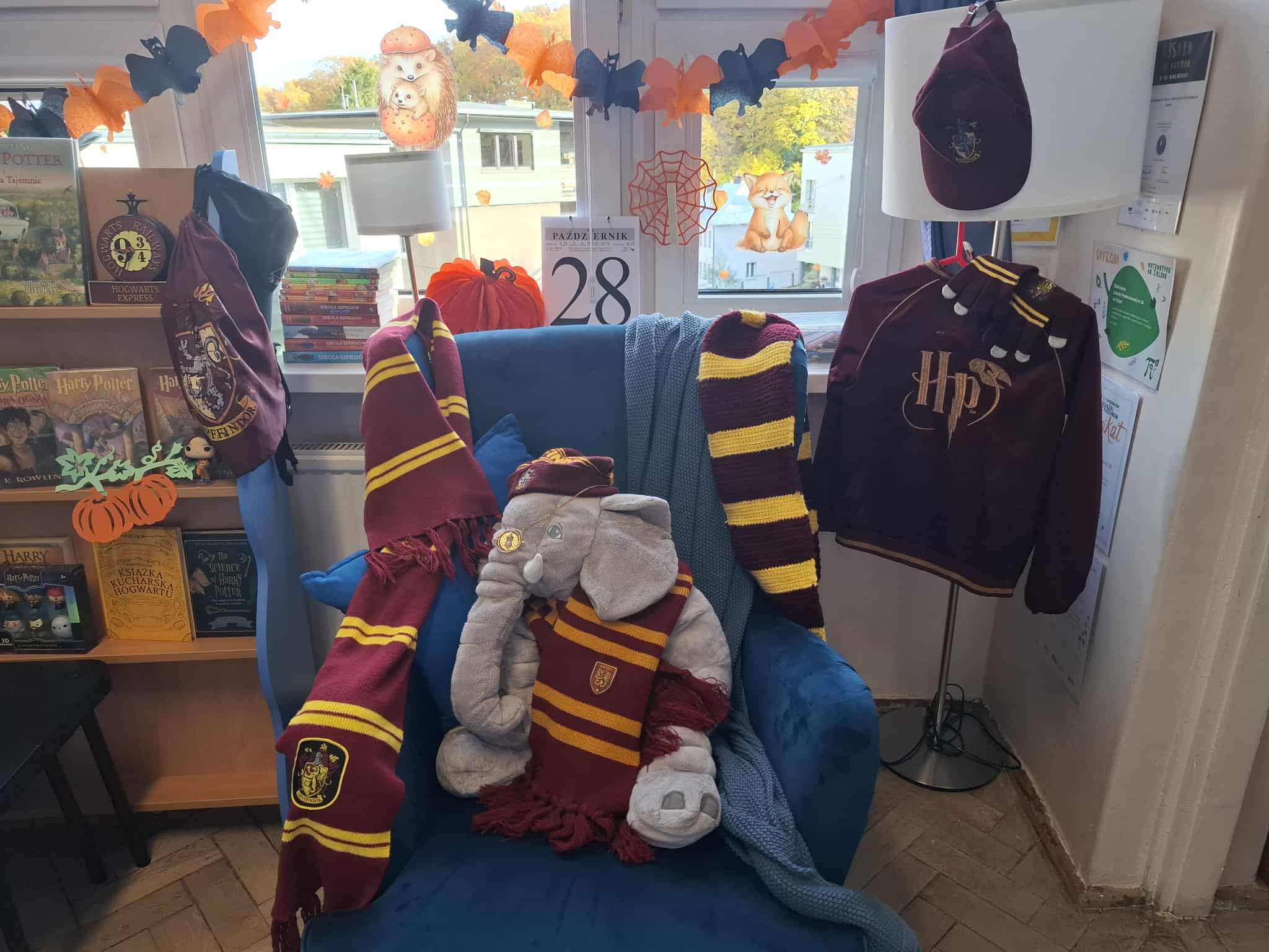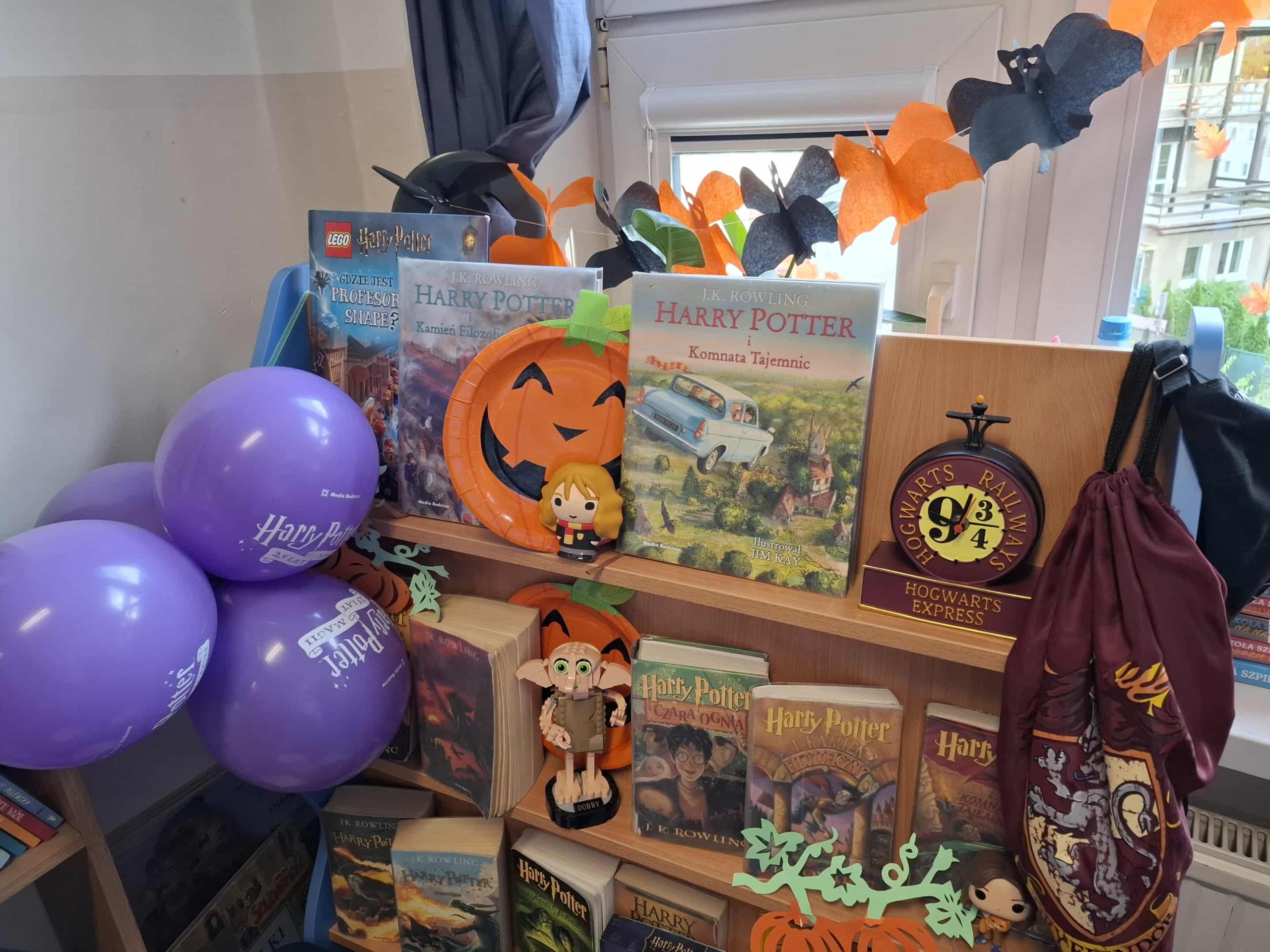 Biblioteka została udekorowana tematycznymi ozdobami, które wprowadzały w klimat magicznego świata. Na specjalnie przygotowanej wystawce można było podziwiać książki z serii o Harrym Potterze oraz liczne gadżety wypożyczone nam przez uczniów – maskotki, figurki z klocków LEGO, różdżki, elementy ubioru i inne zabawki związane z serią.
