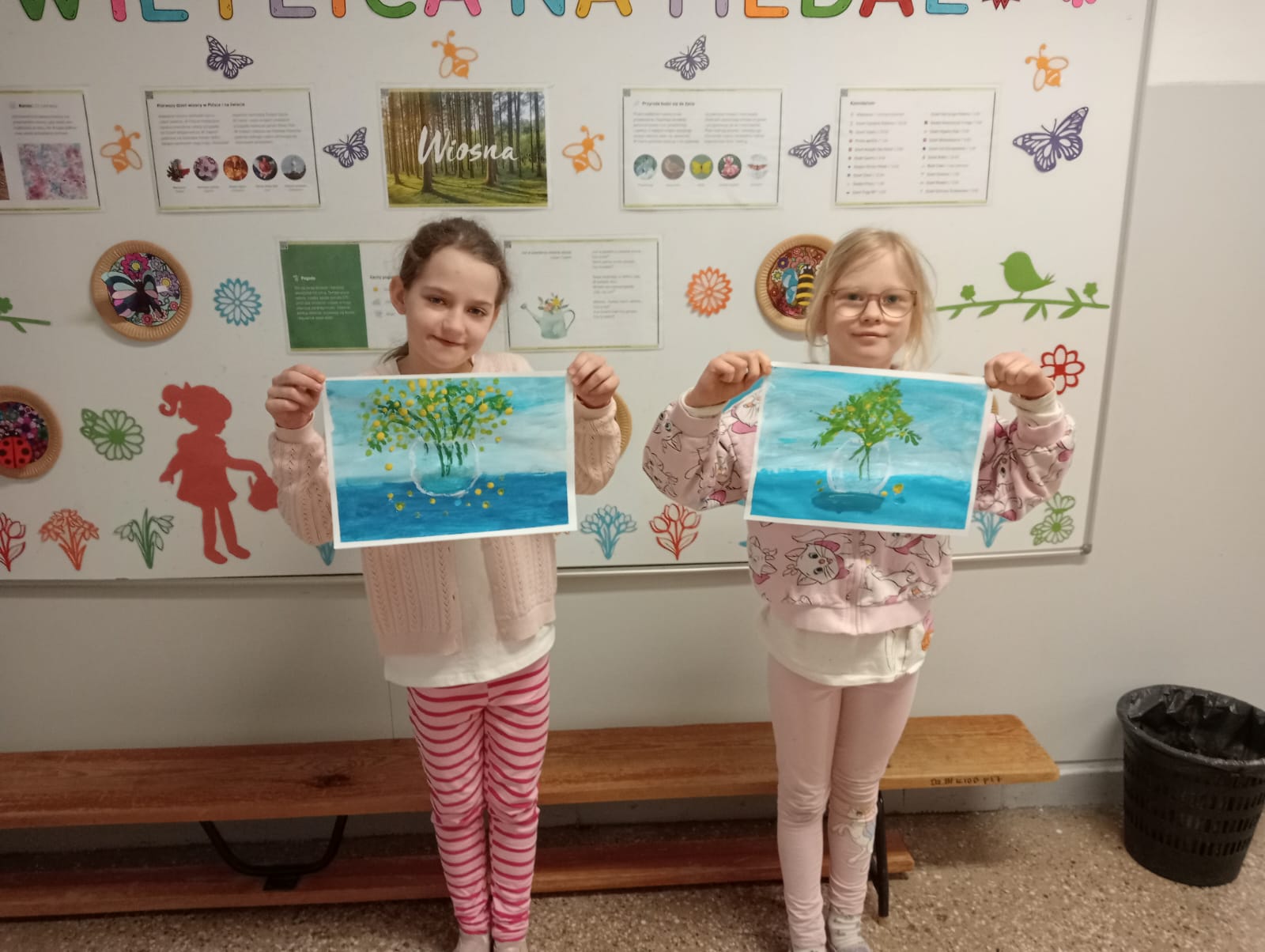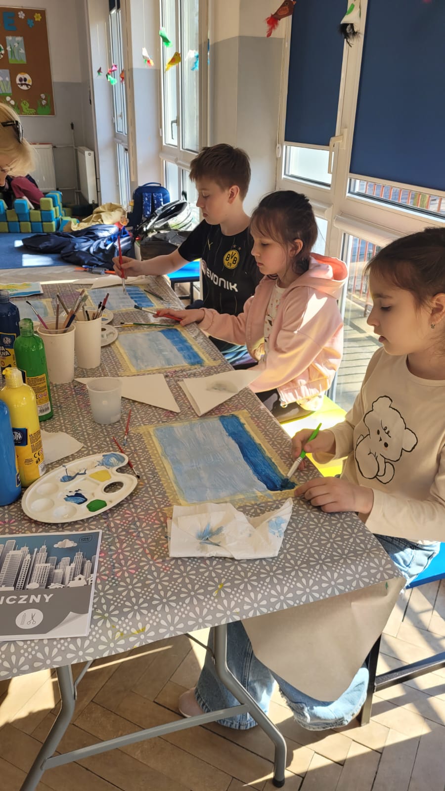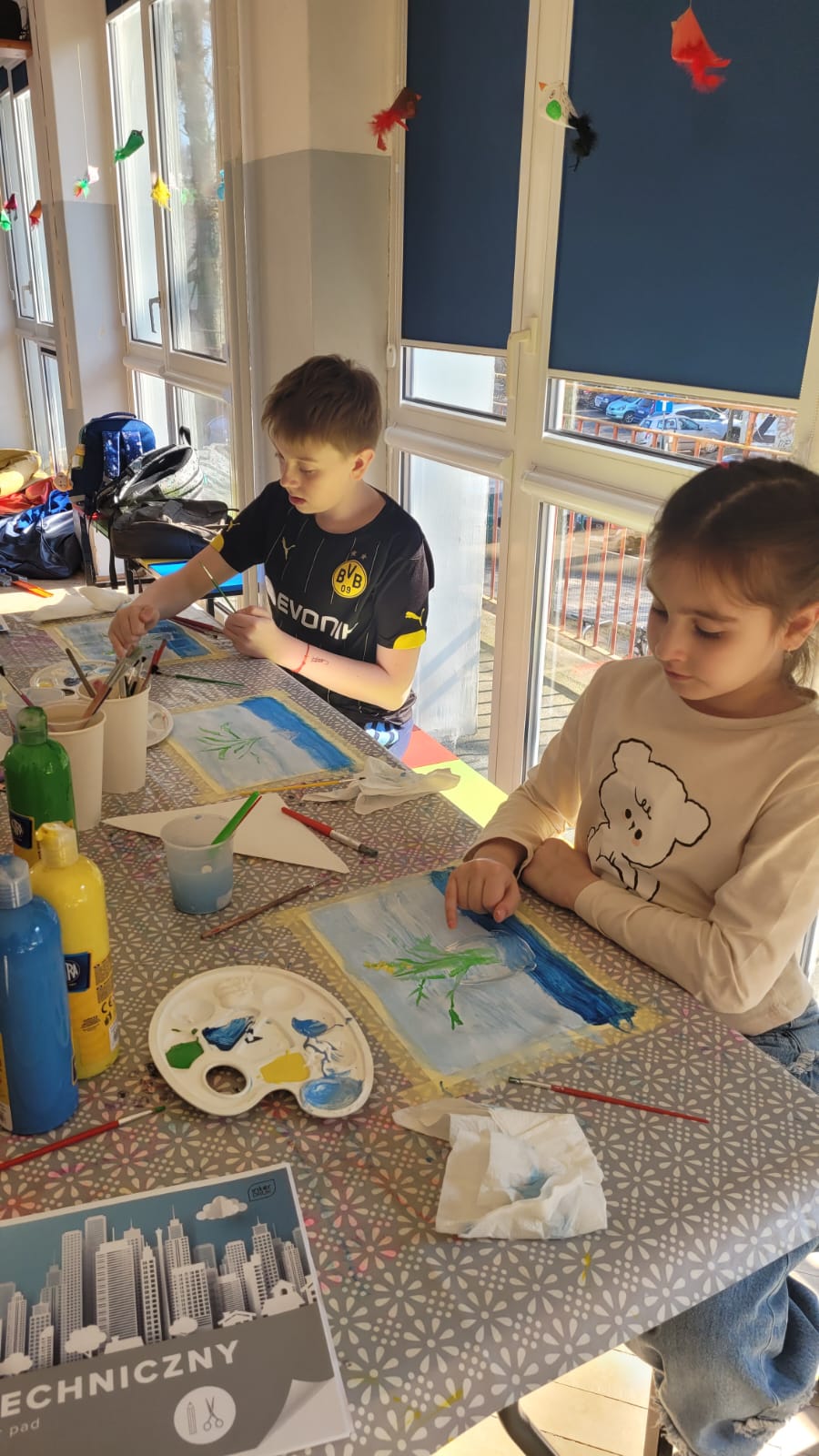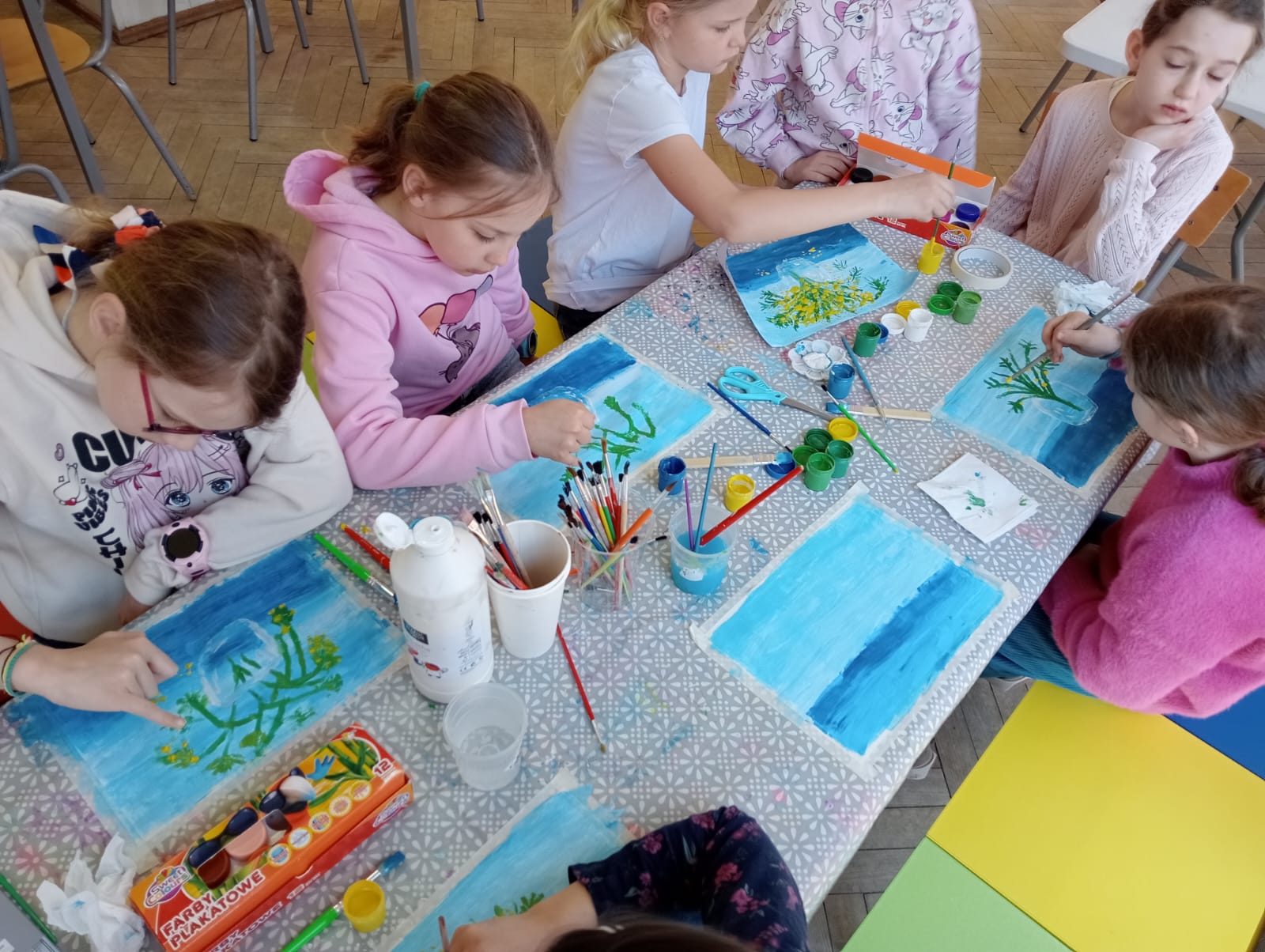 Podczas ostatnich zajęć plastycznych w świetlicy uczniowie stworzyli piękne obrazy inspirowane budzącą się do życia naturą. Dzieci uczyły się, jak stopniowo przenosić kompozycję na płaszczyznę, zachowując proporcje, realizując jednocześnie własną wizję przestrzenną i kształtując indywidualny styl w malarstwie.