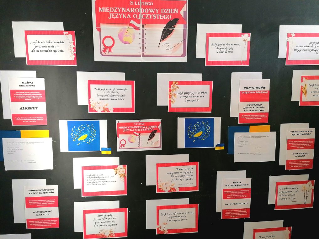 Dodatkowo Uczniowie przygotowali tego dnia plakietki ze swoim ulubionym słowem języka ojczystego. W każdej klasie z tych słów stworzono klasowy słownik. Podopieczni Pani Iwony Podhajskiej wykonali piękną gazetkę tematyczną, a uczniowie z Ukrainy dali poznać swoim kolegom i nauczycielom w polskiej szkole, jak brzmi ich język i jakich poetów sobie cenią. Do działań włączyli się wszyscy, ze świetlicą włącznie.