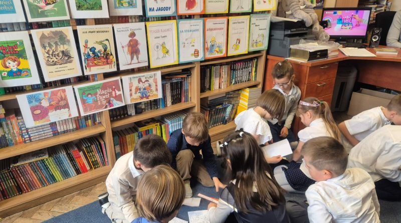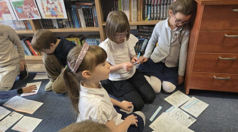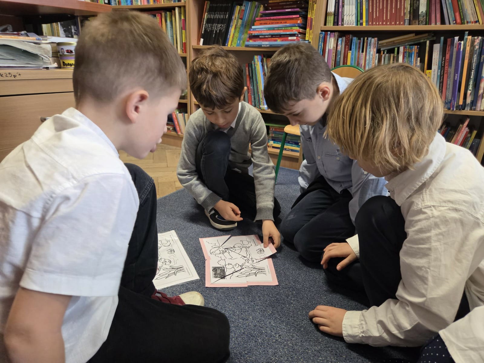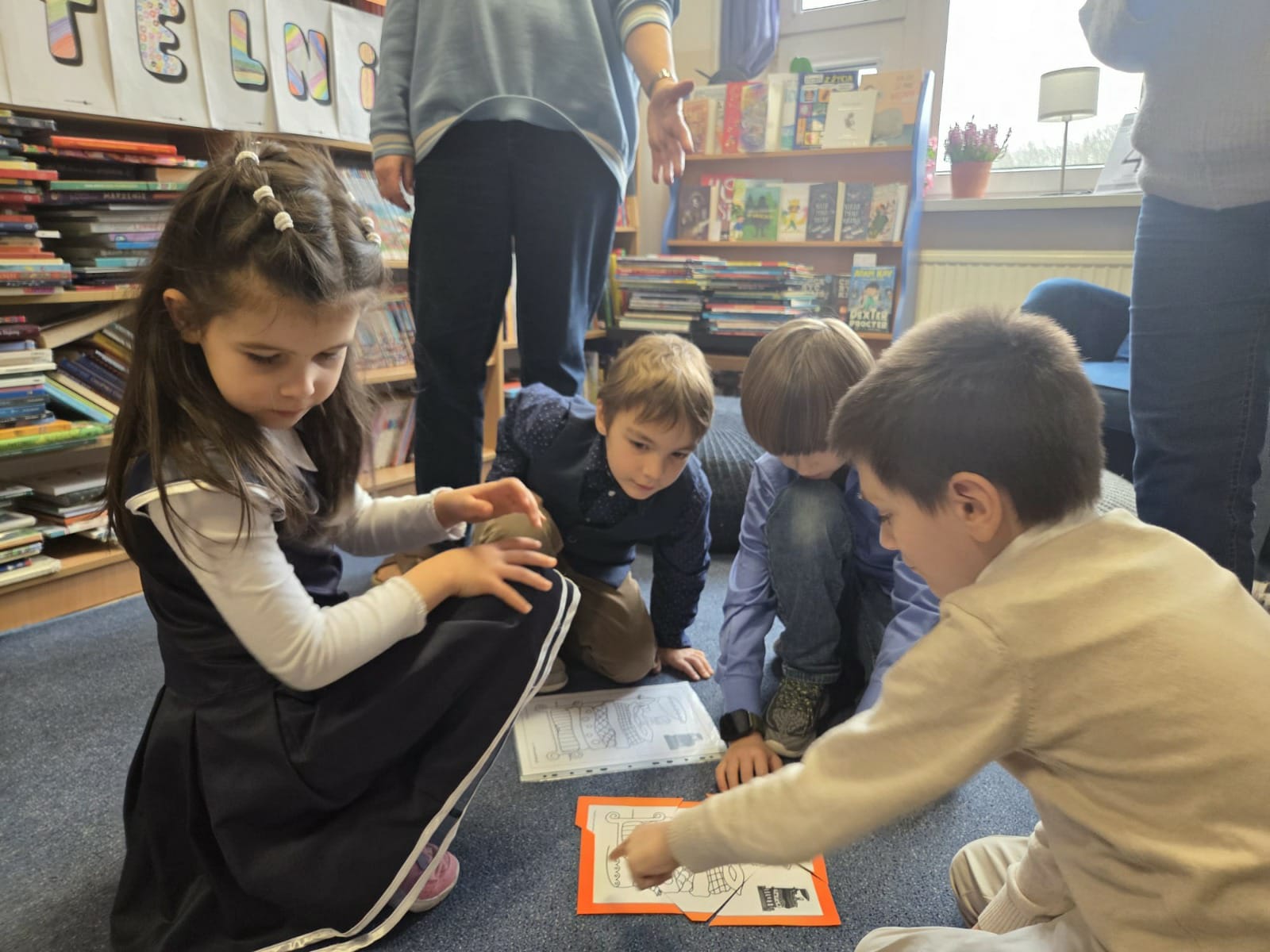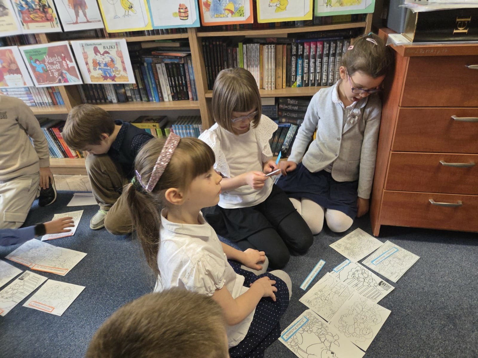 Spotkanie rozpoczęło się od zwiedzania biblioteki oraz krótkiej pogadanki o zasadach właściwego zachowania w jej pomieszczeniach i korzystania z księgozbioru. Następnie nasi najmłodsi uczniowie wzięli udział w bajkowych zadaniach, które rozwiązywali w grupach, zdobywając punkty w postaci medali z krasnalami.