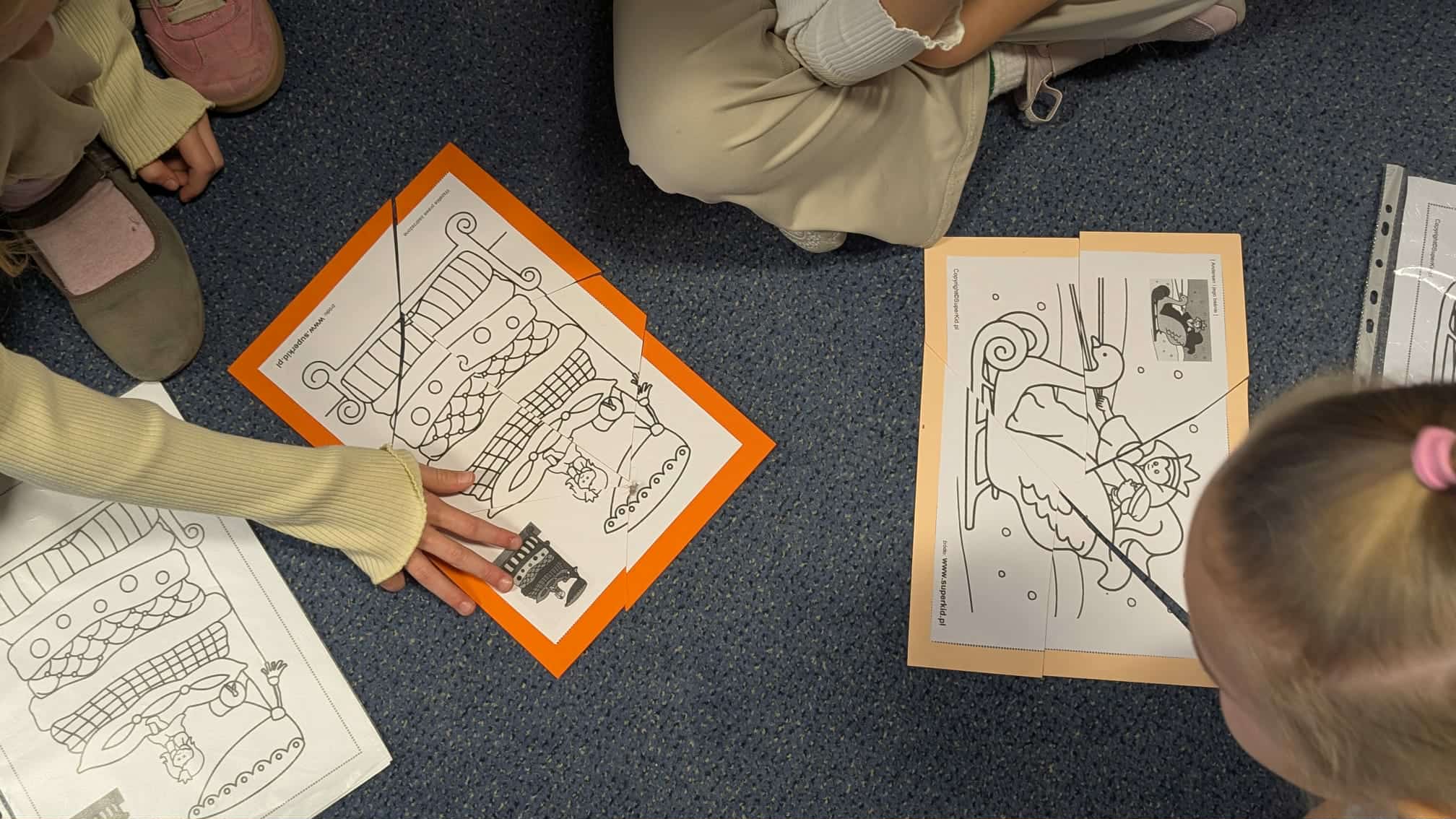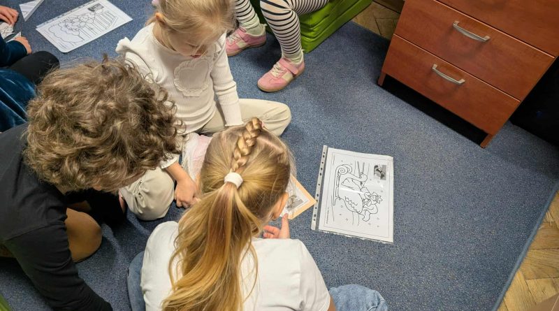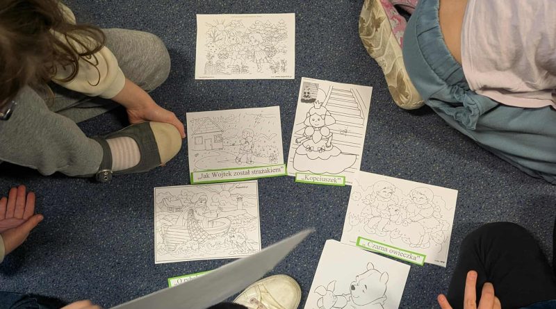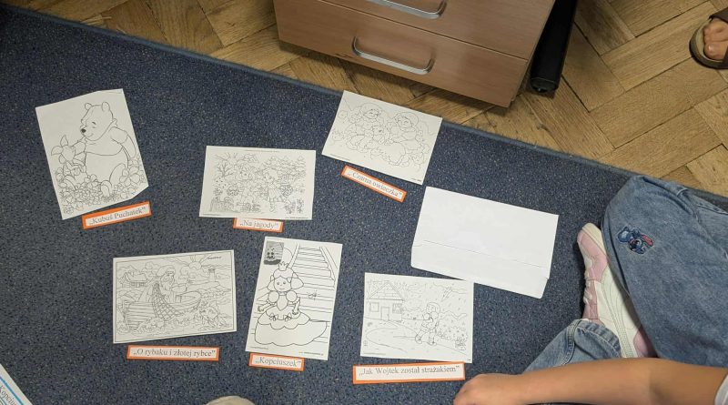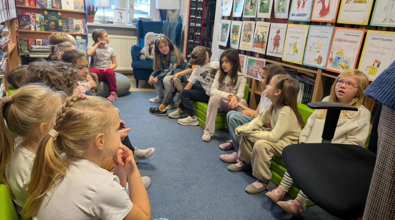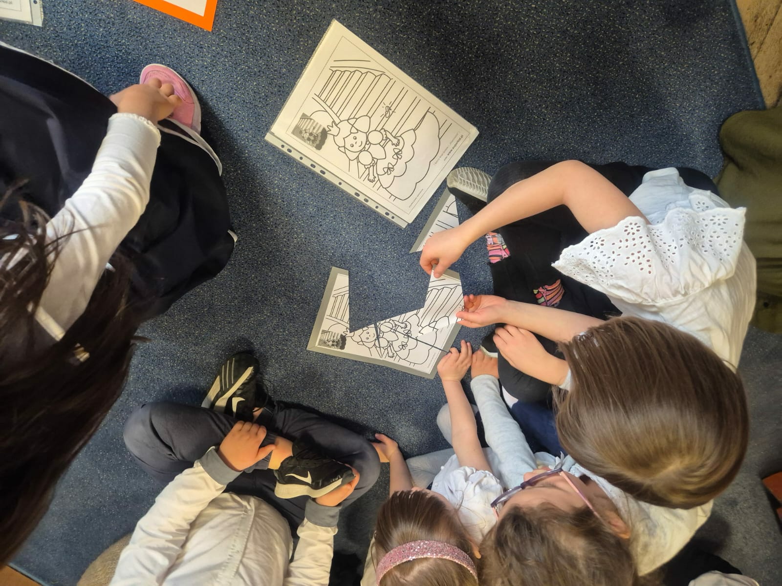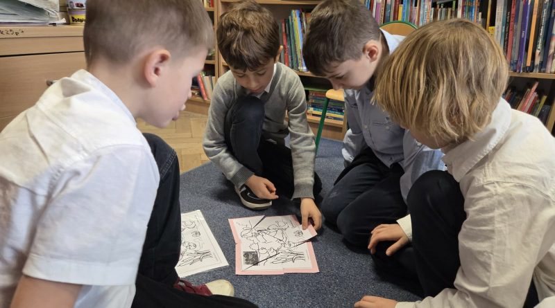 Spotkanie rozpoczęło się od zwiedzania biblioteki oraz krótkiej pogadanki o zasadach właściwego zachowania w jej pomieszczeniach i korzystania z księgozbioru. Następnie nasi najmłodsi uczniowie wzięli udział w bajkowych zadaniach, które rozwiązywali w grupach, zdobywając punkty w postaci medali z krasnalami.