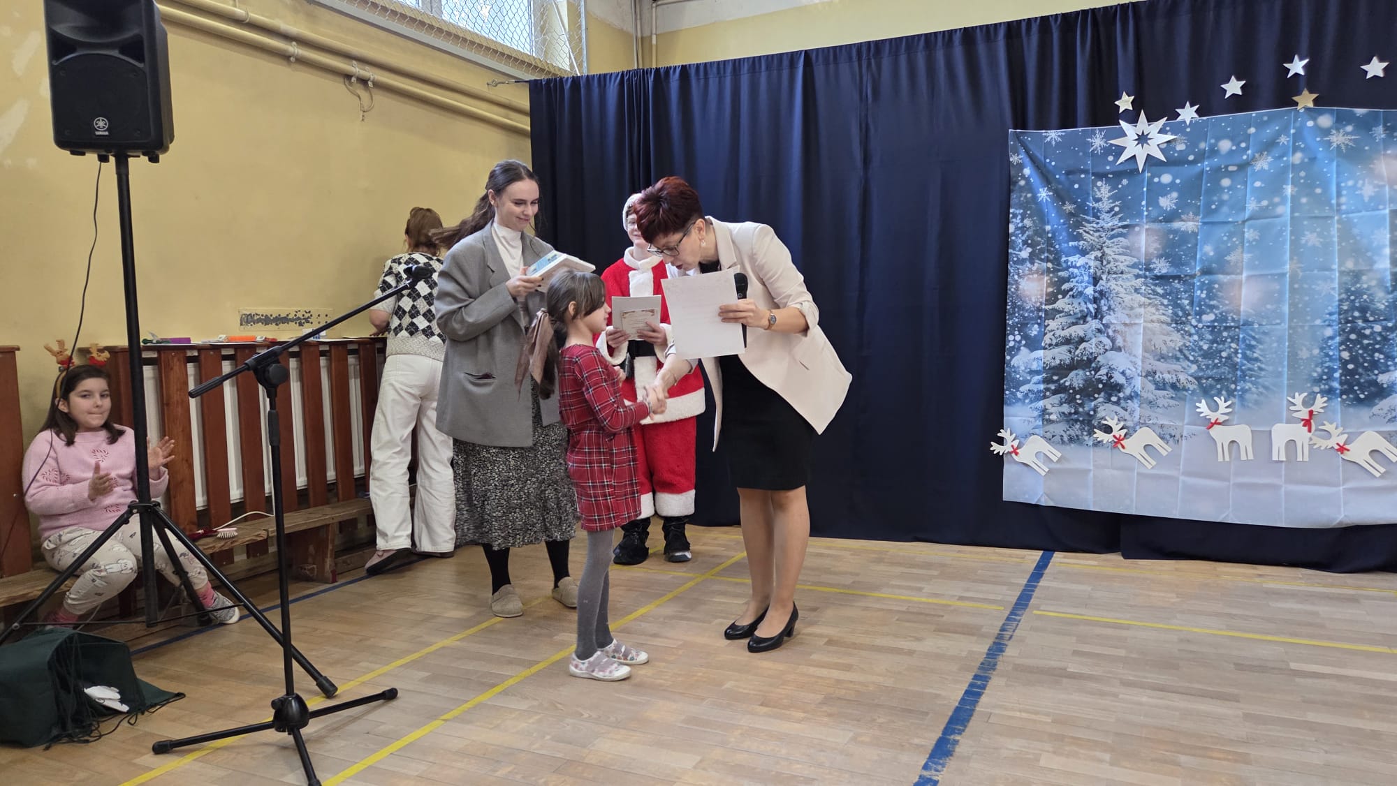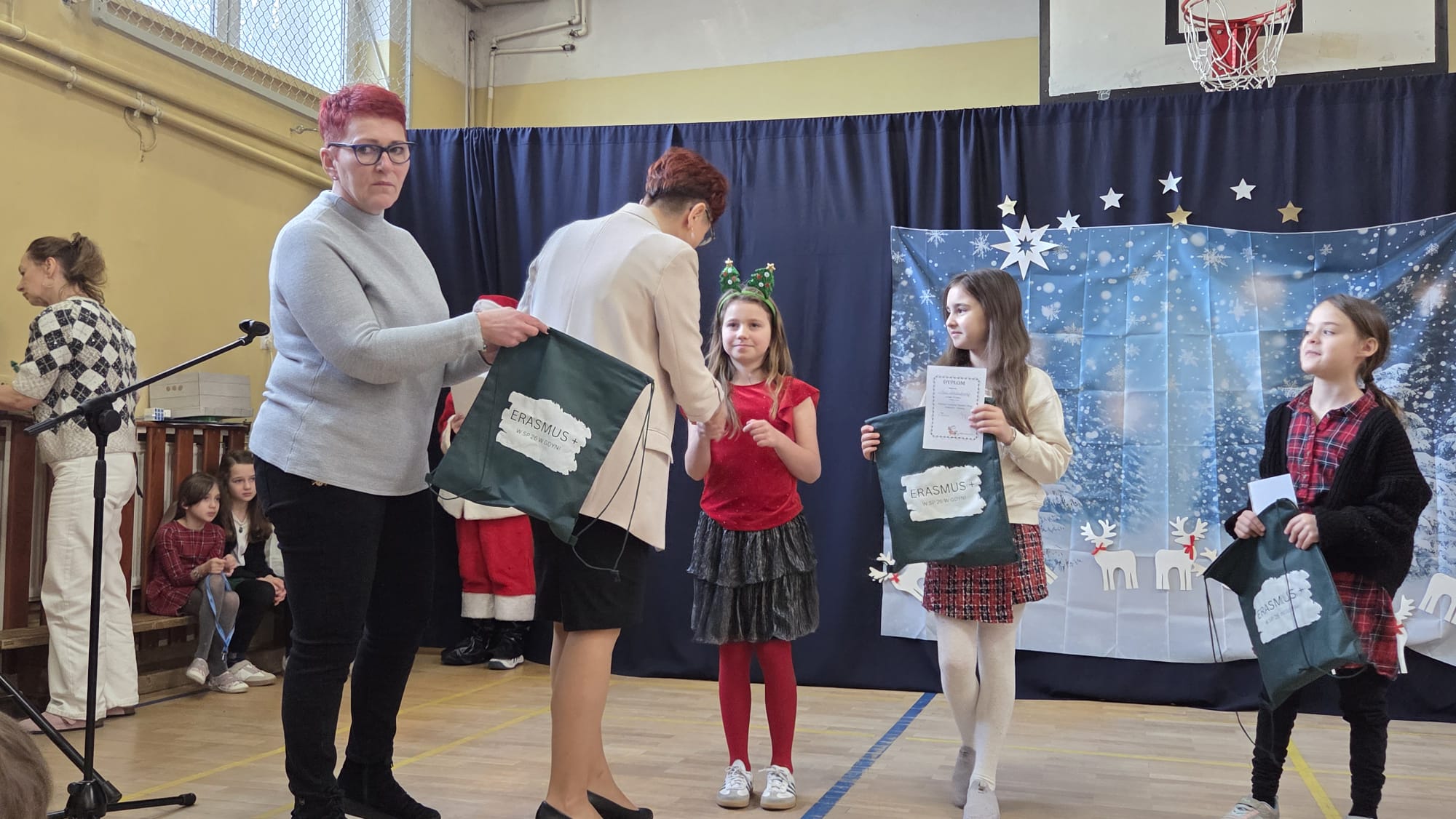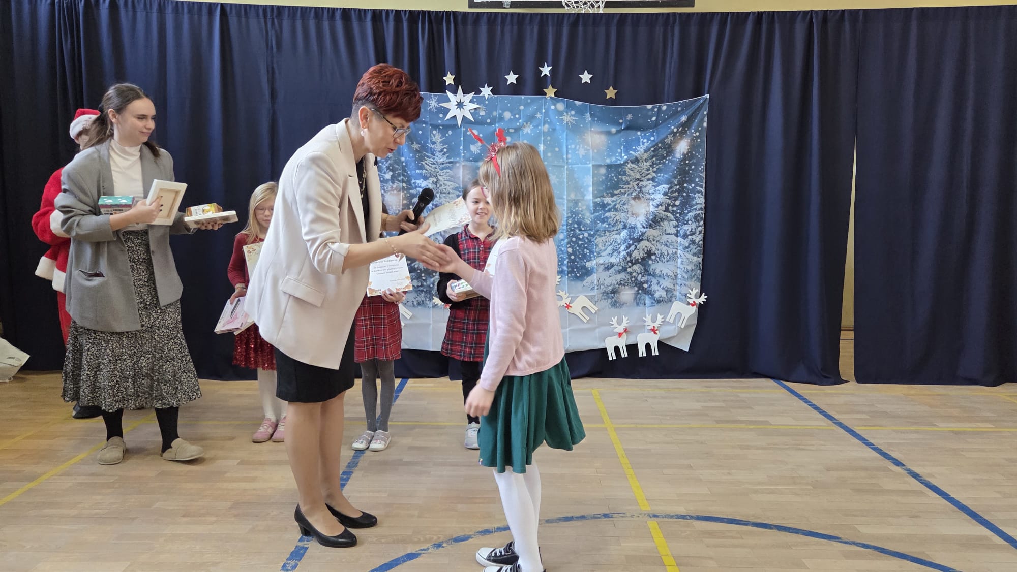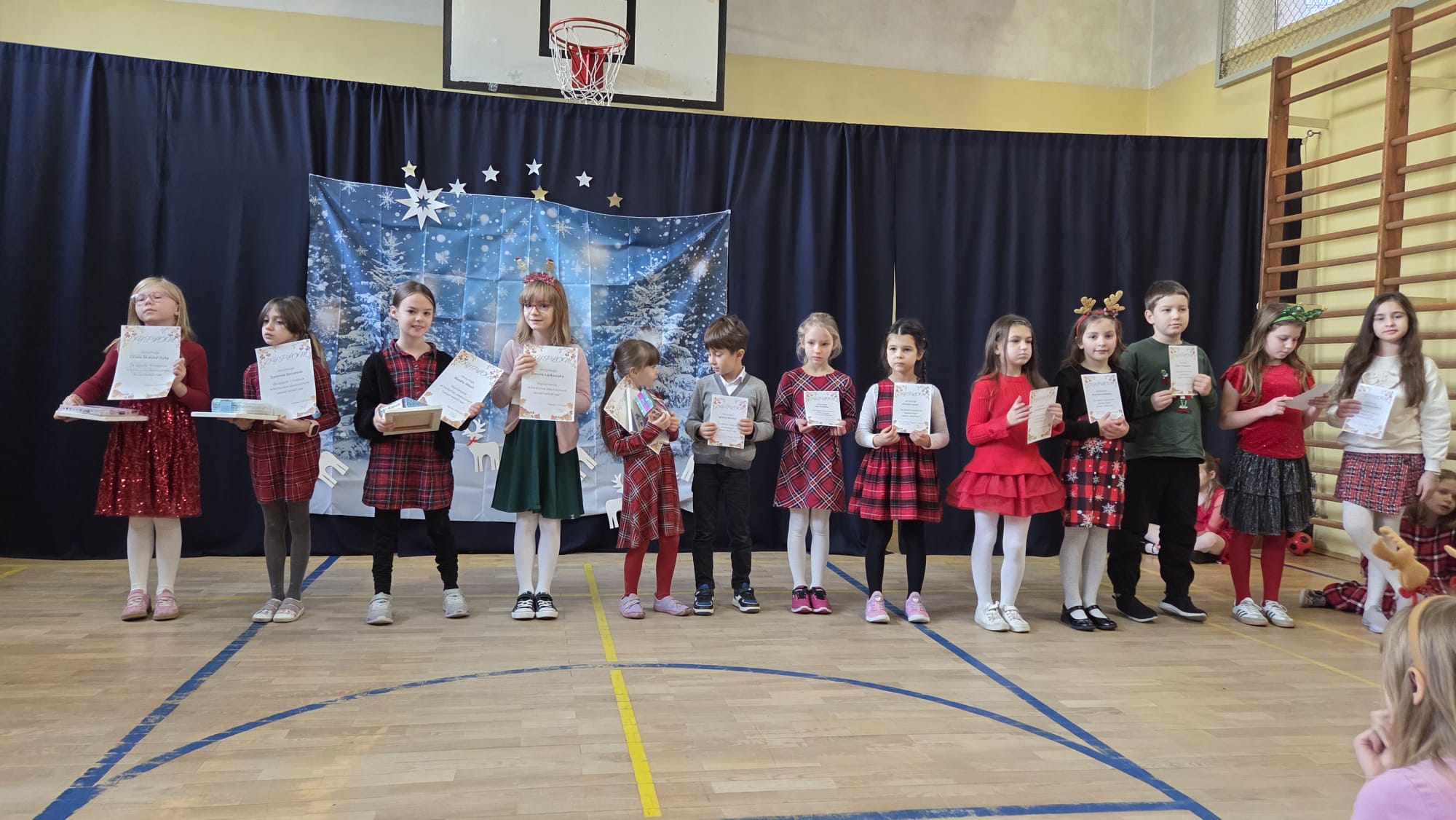 W piątek na sali gimnastycznej odbyło się uroczyste spotkanie świąteczne. Wręczono nagrody laureatom konkursów, a Pani Dyrektor złożyła wszystkim serdeczne życzenia świąteczne.