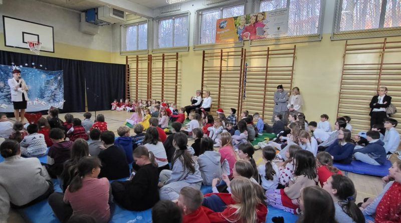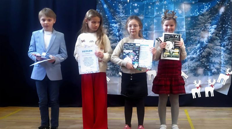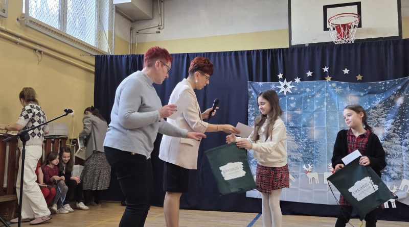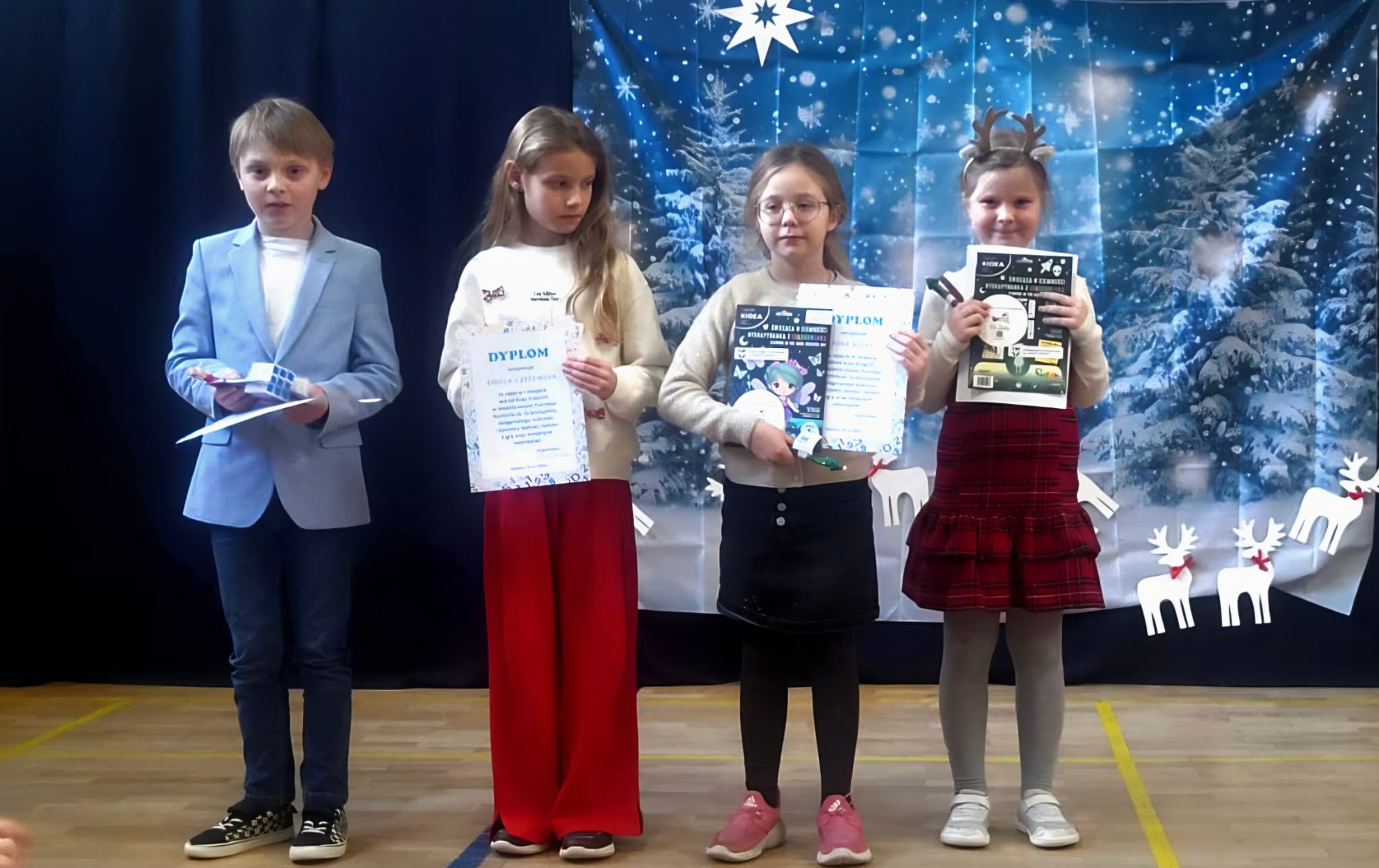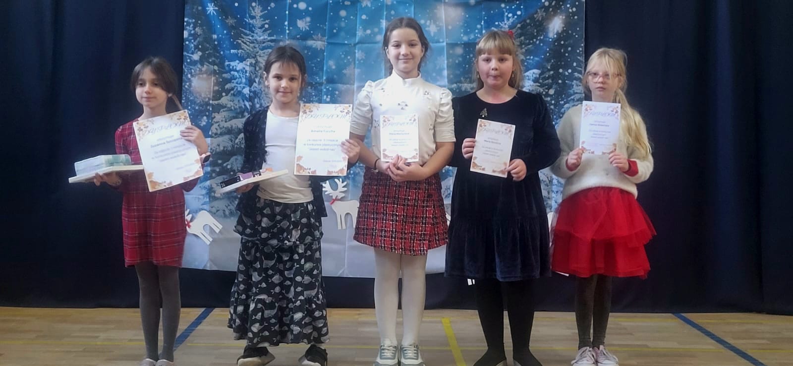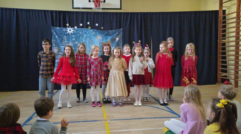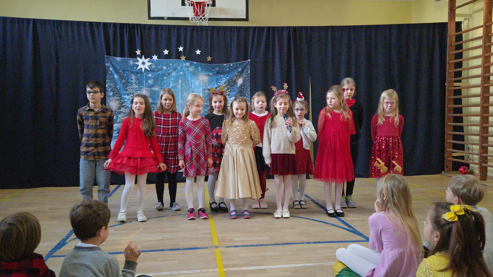 Na scenie zaprezentowały się dzieci, które brały udział w Międzyszkolnym Konkursie Piosenki i Poezji Świąteczno-Zimowej.