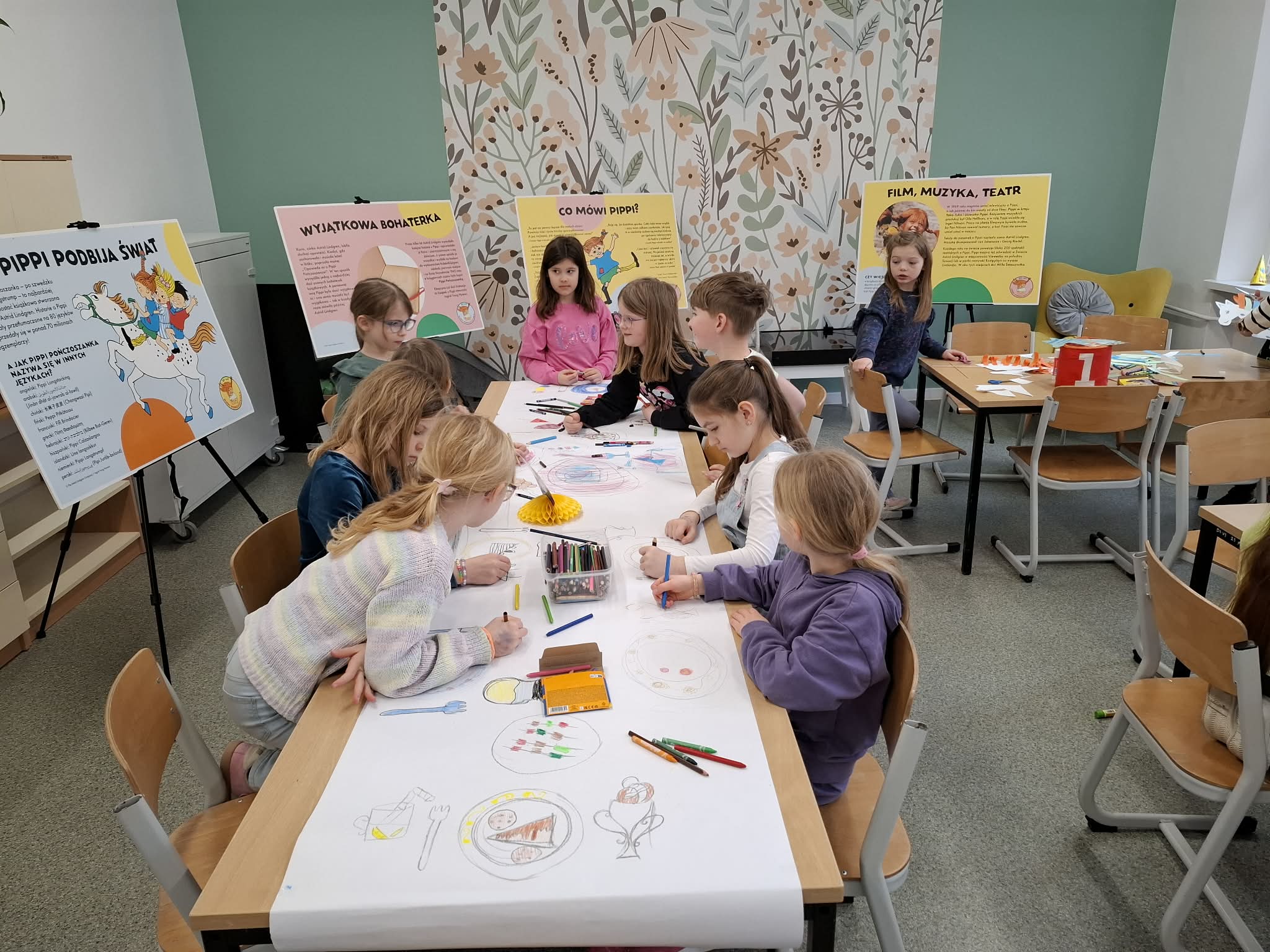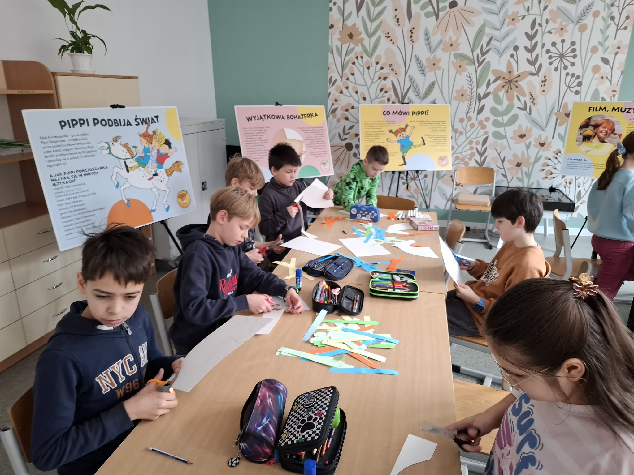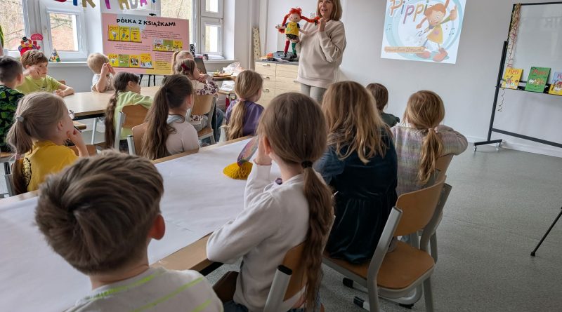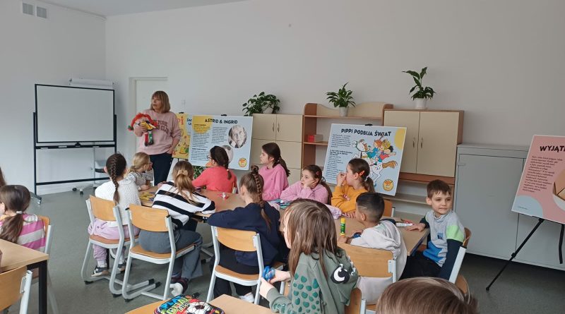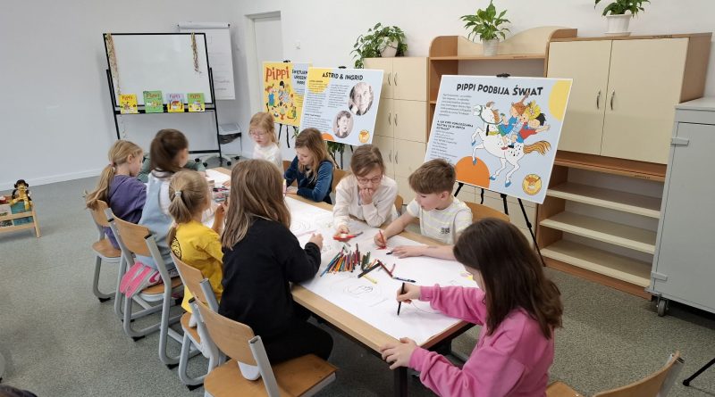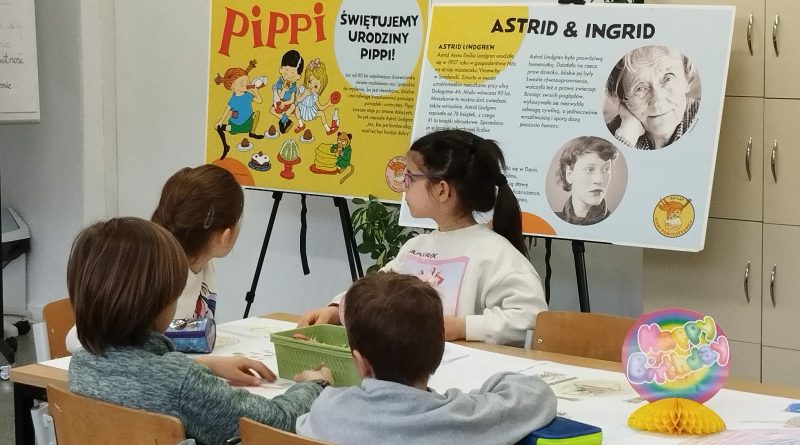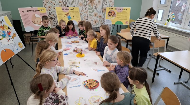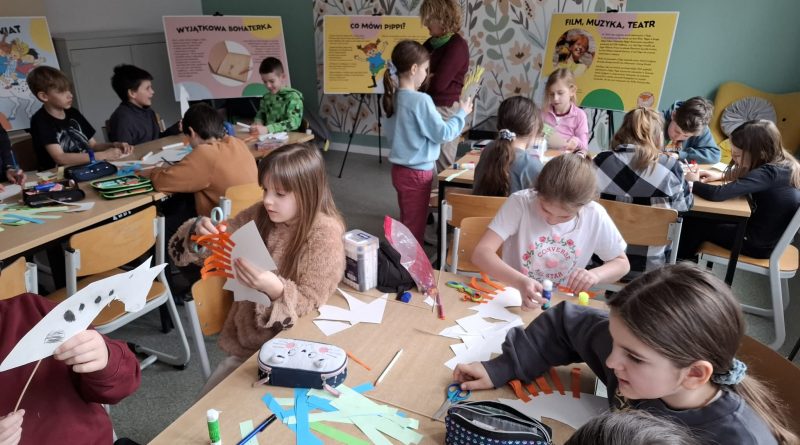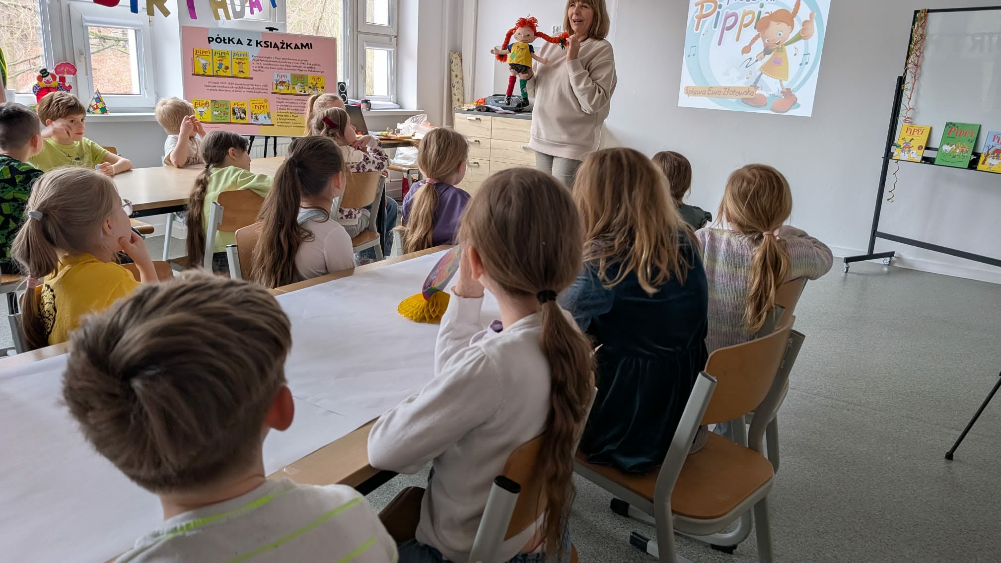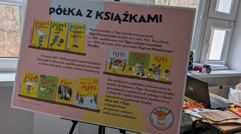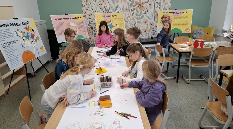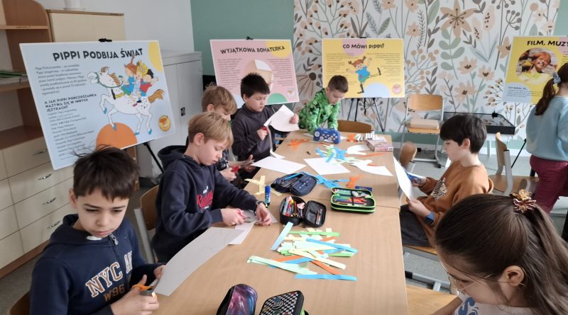 Ostatnio uczniowie klas młodszych wzięli udział w wyjątkowych warsztatach czytelniczo‑plastycznych, zorganizowanych przez szkolną bibliotekę. Zajęcia odbyły się w otoczeniu wielkoformatowej wystawy „80-te urodziny Pippi”, wypożyczonej z wydawnictwa Zakamarki, która przyciągała uwagę barwnymi ilustracjami i ciekawymi cytatami.