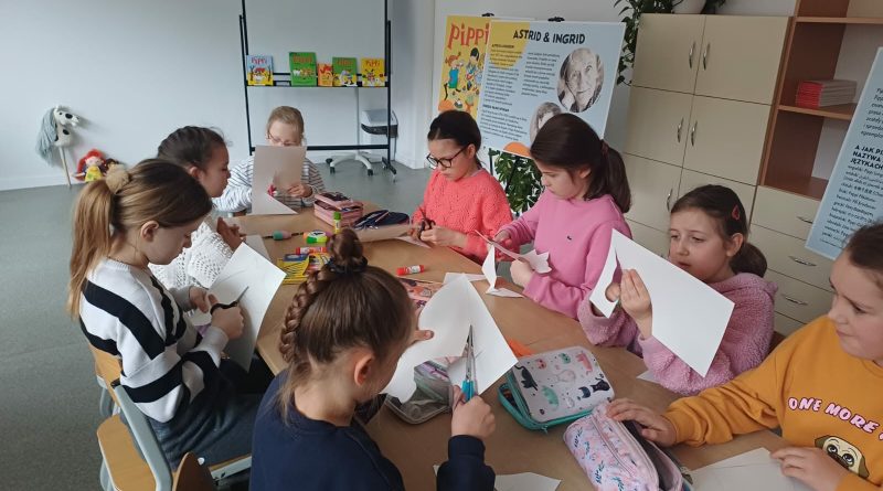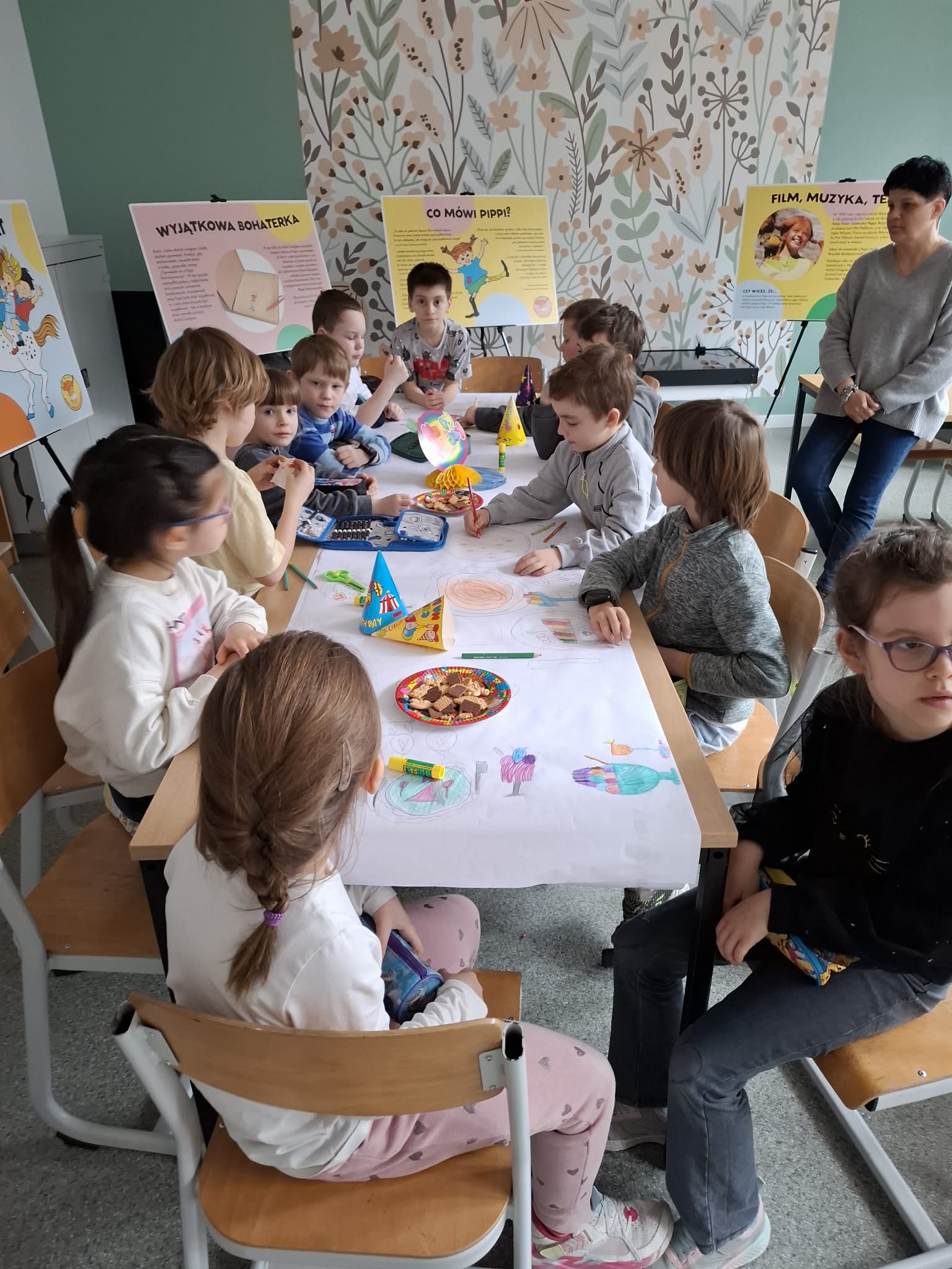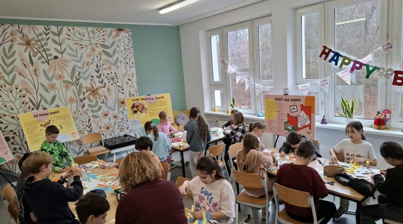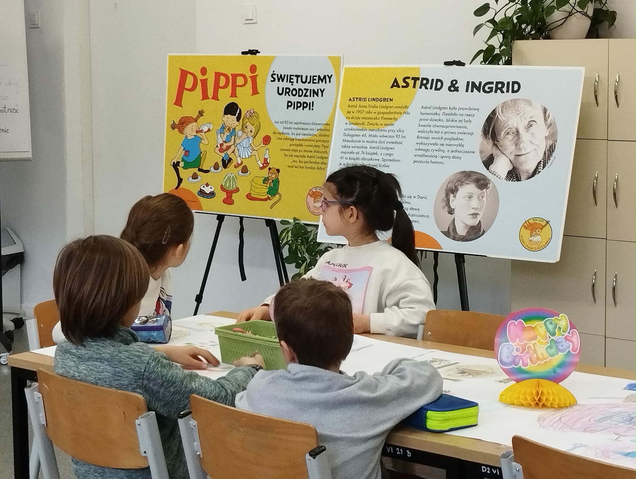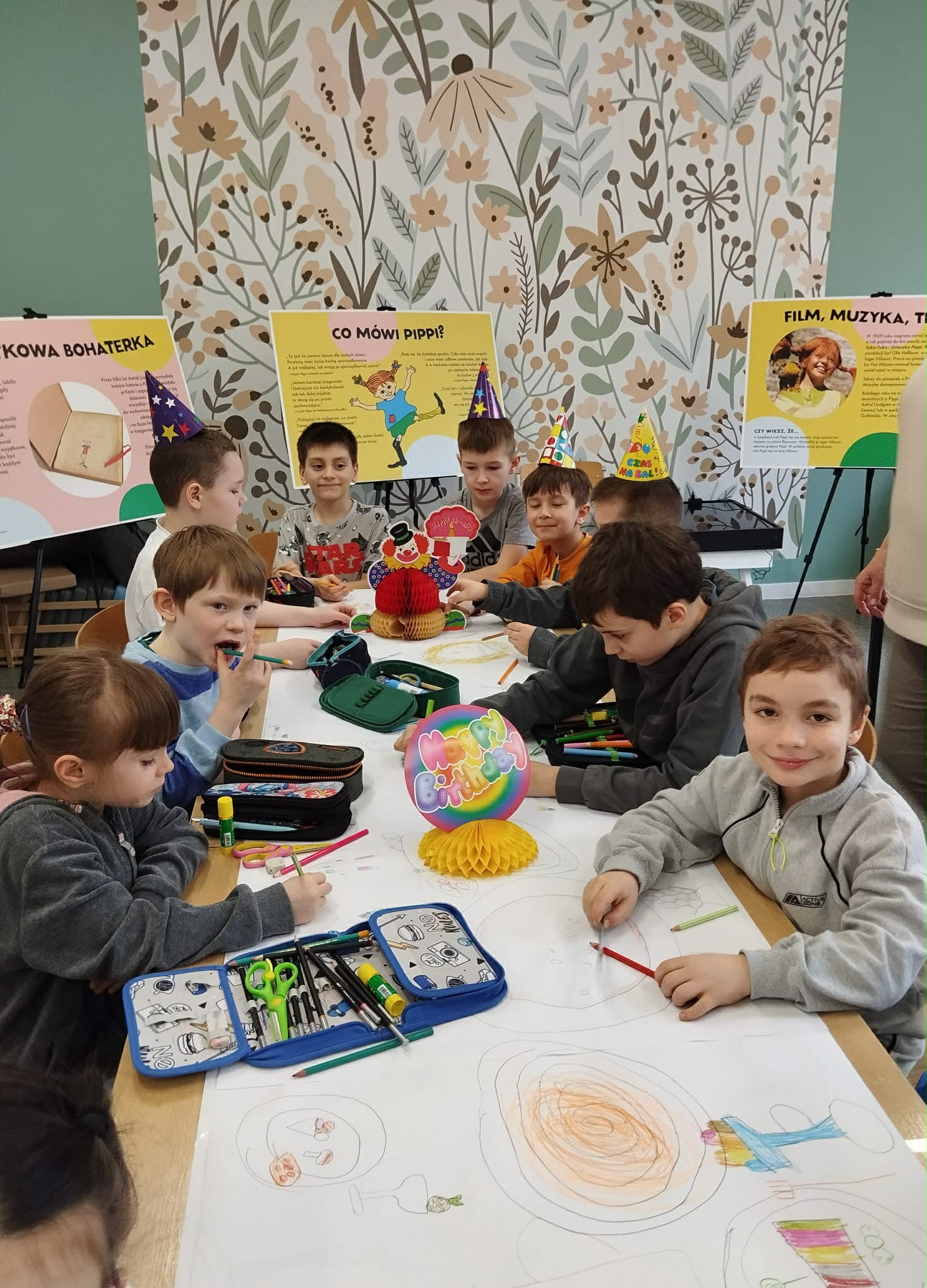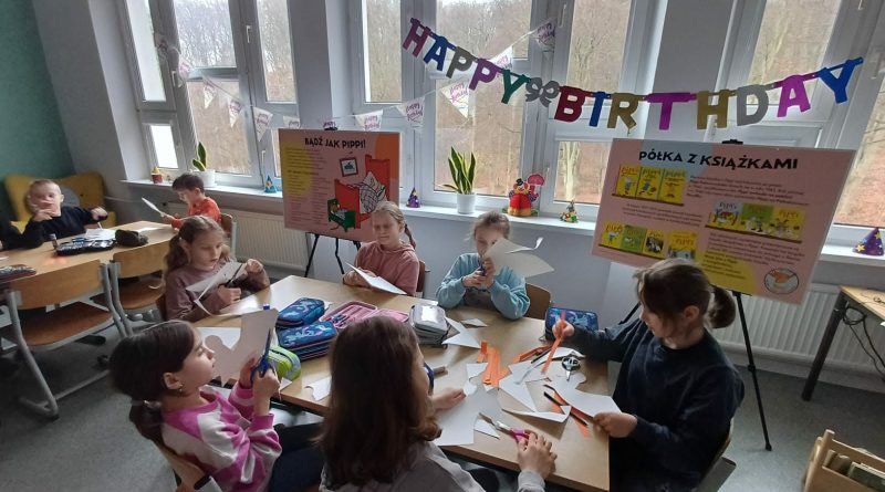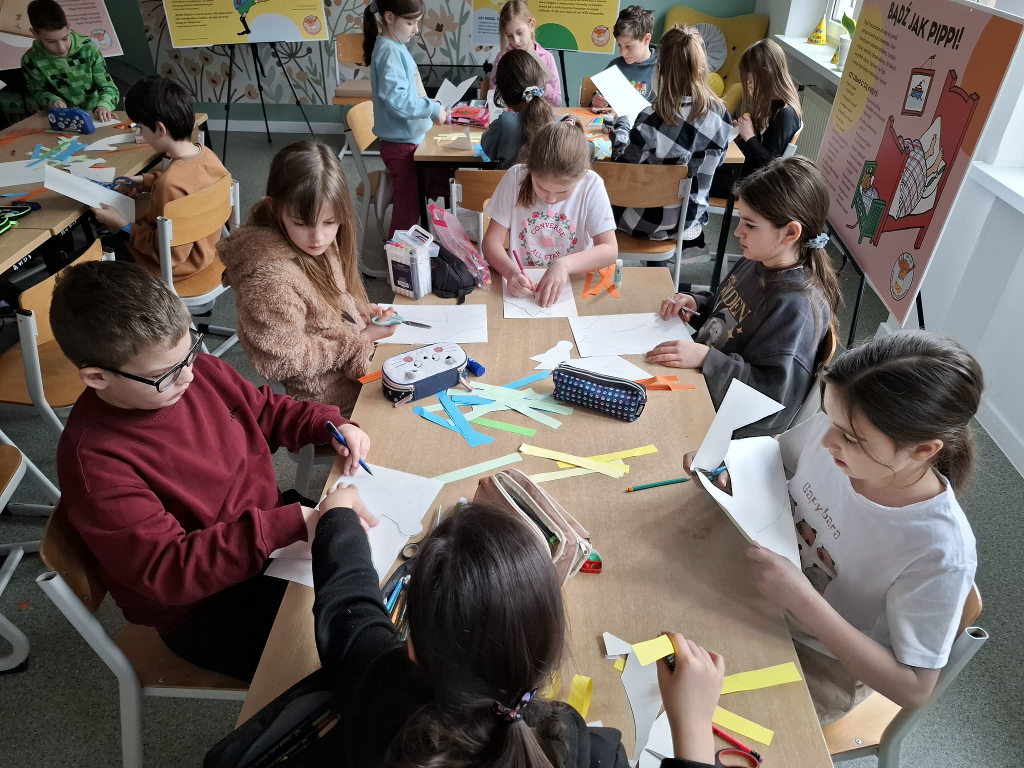 Ostatnio uczniowie klas młodszych wzięli udział w wyjątkowych warsztatach czytelniczo‑plastycznych, zorganizowanych przez szkolną bibliotekę. Zajęcia odbyły się w otoczeniu wielkoformatowej wystawy „80-te urodziny Pippi”, wypożyczonej z wydawnictwa Zakamarki, która przyciągała uwagę barwnymi ilustracjami i ciekawymi cytatami.
