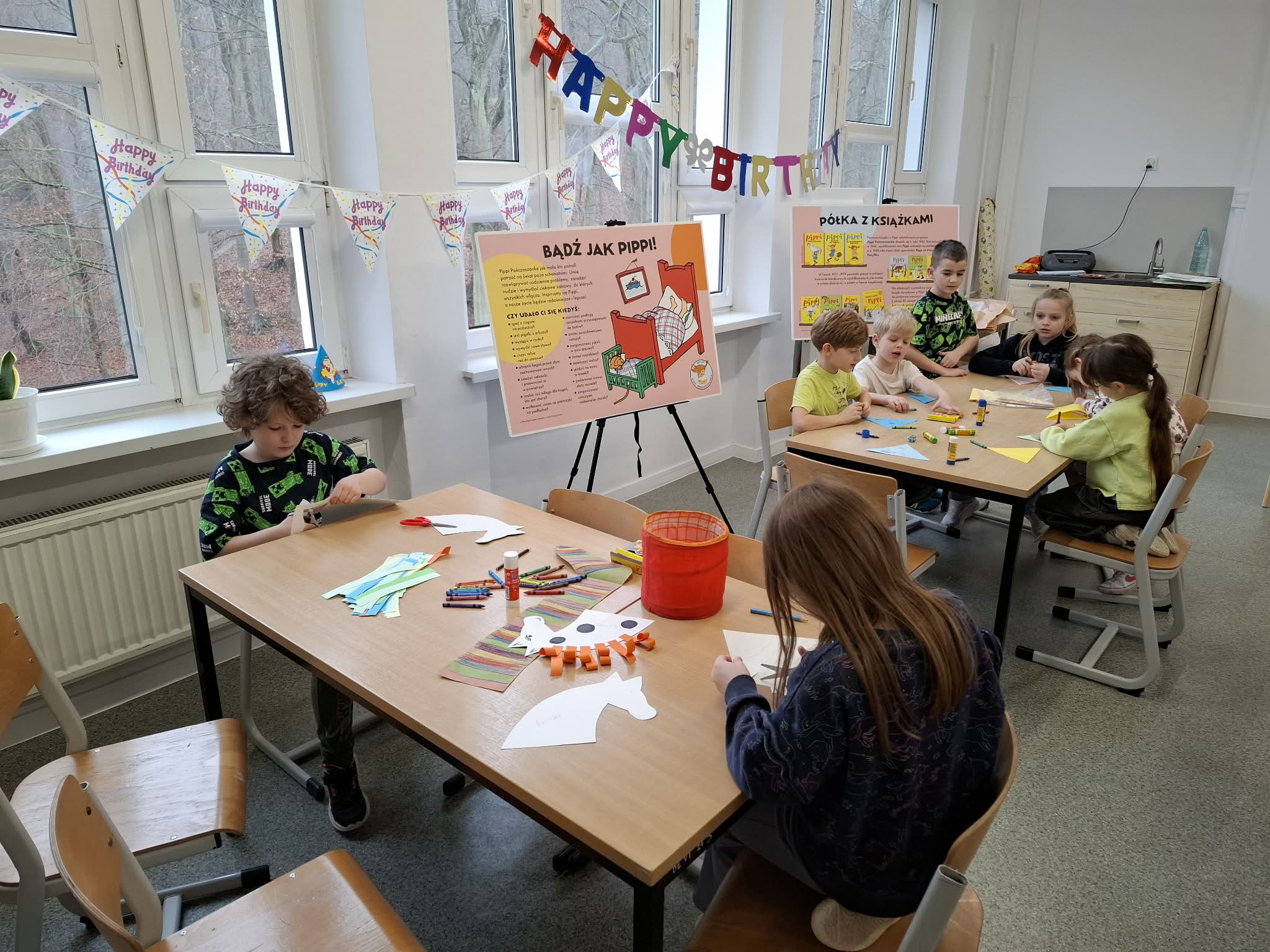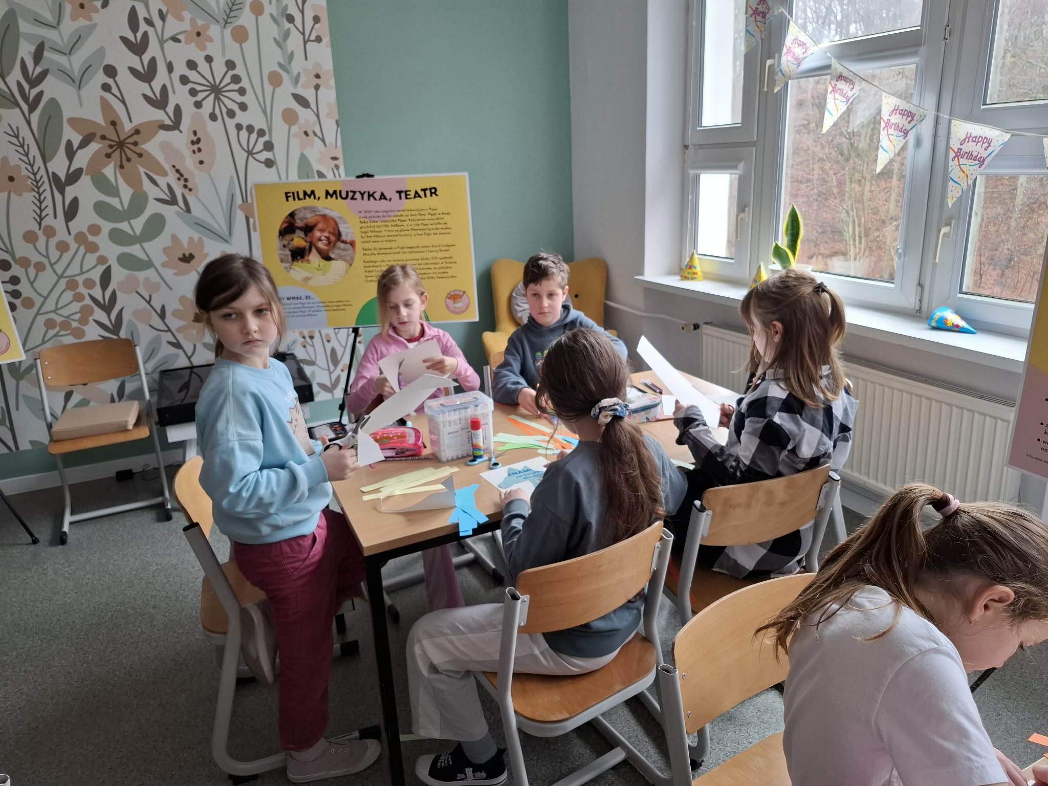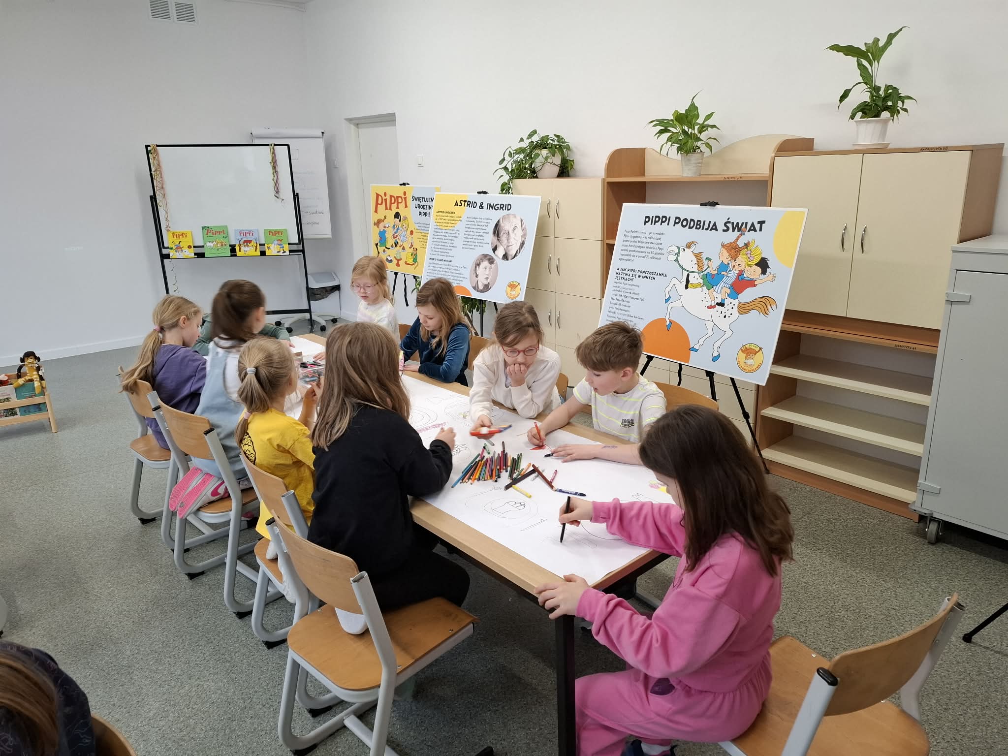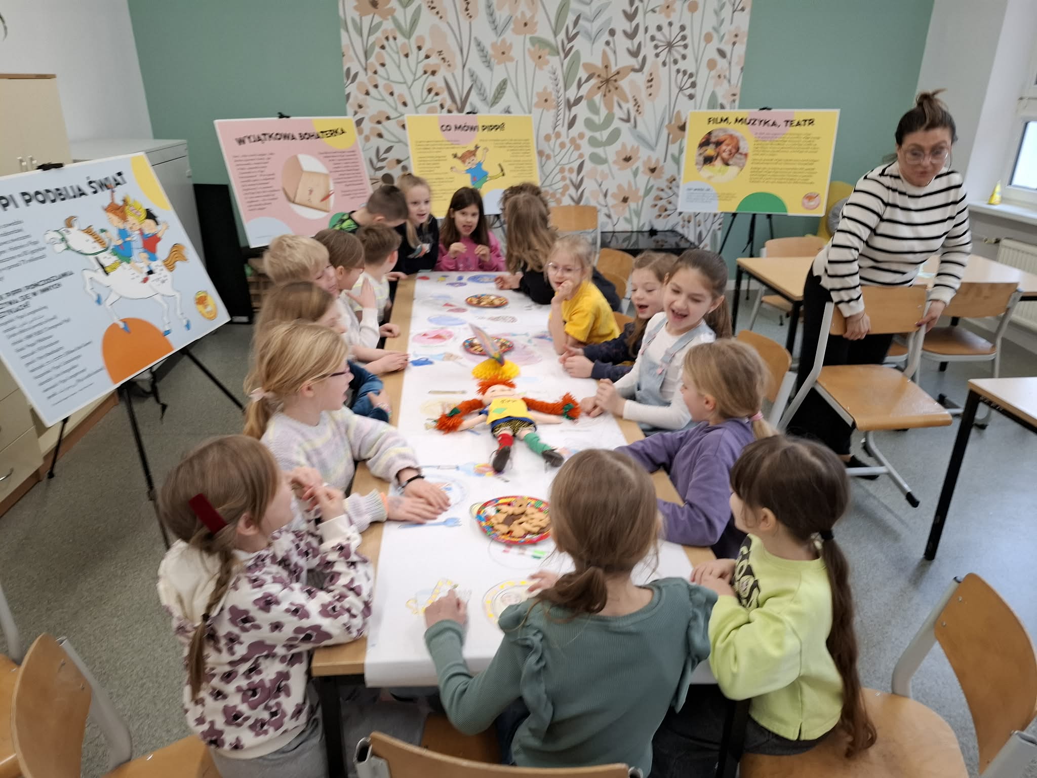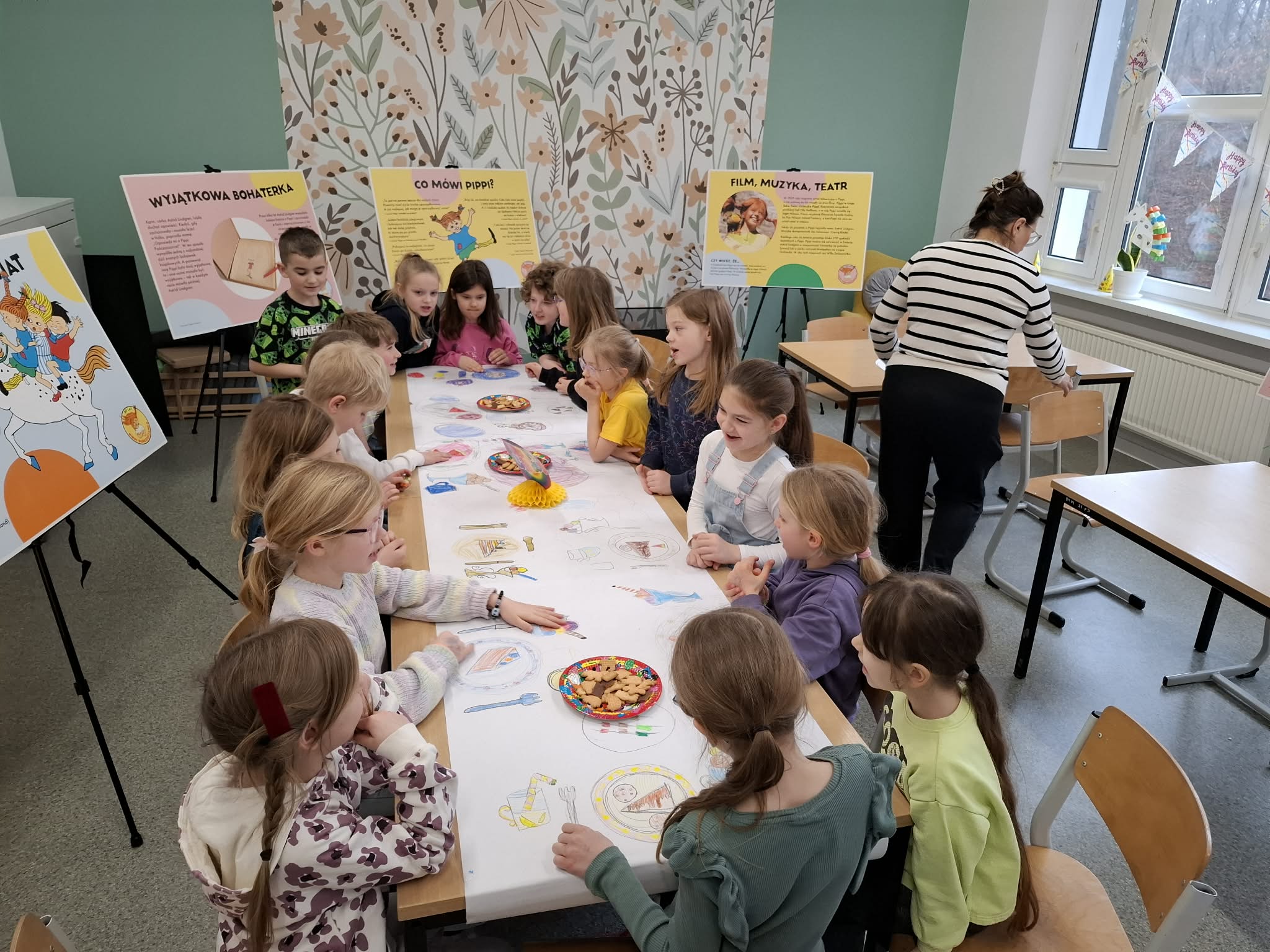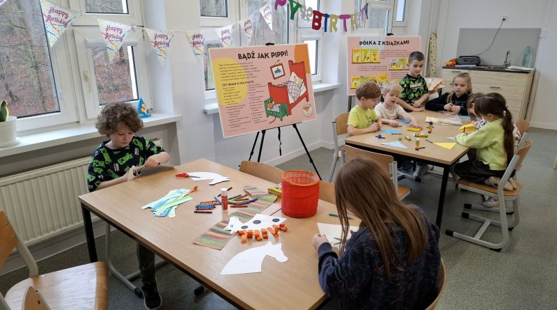 Ostatnio uczniowie klas młodszych wzięli udział w wyjątkowych warsztatach czytelniczo‑plastycznych, zorganizowanych przez szkolną bibliotekę. Zajęcia odbyły się w otoczeniu wielkoformatowej wystawy „80-te urodziny Pippi”, wypożyczonej z wydawnictwa Zakamarki, która przyciągała uwagę barwnymi ilustracjami i ciekawymi cytatami.