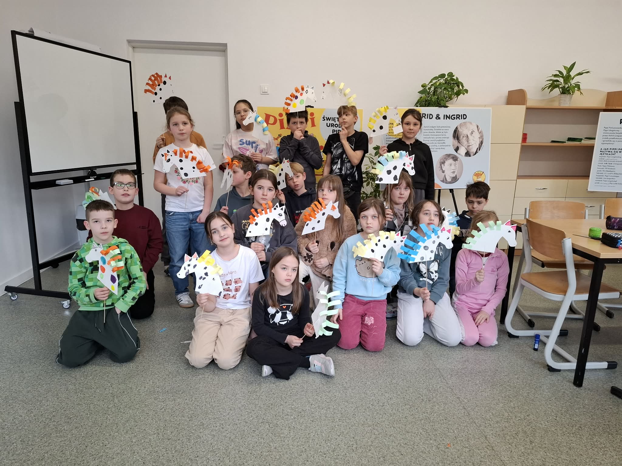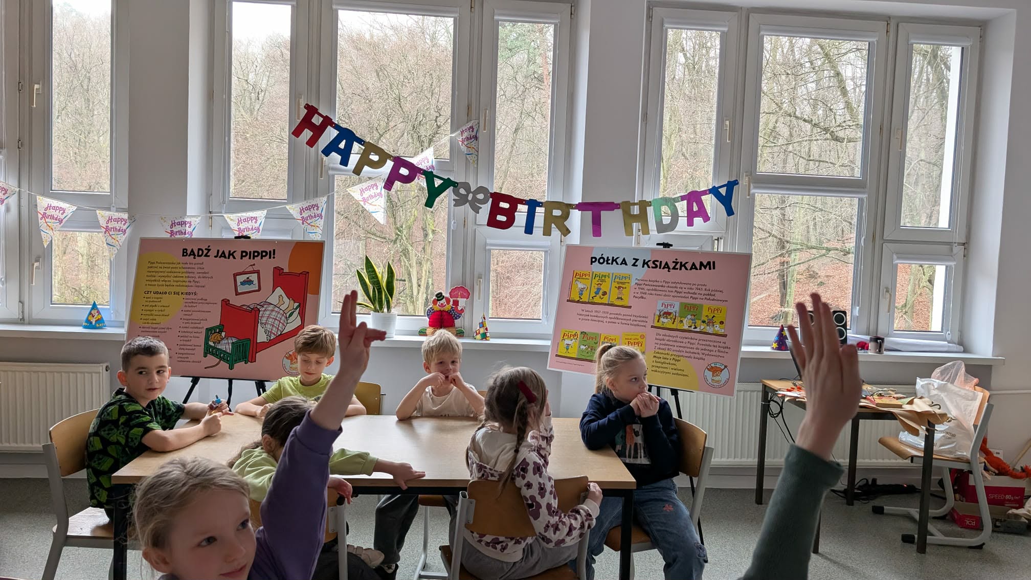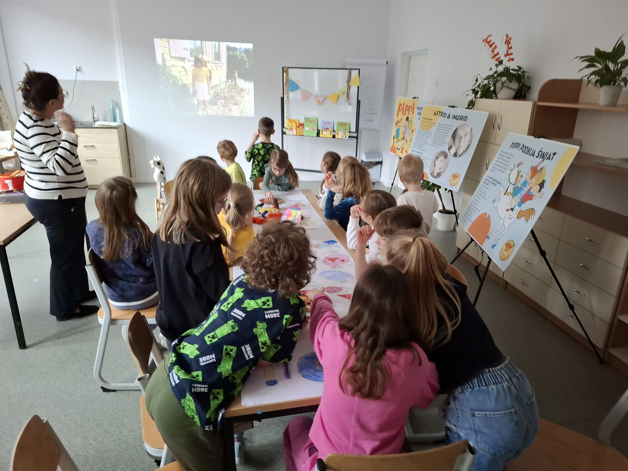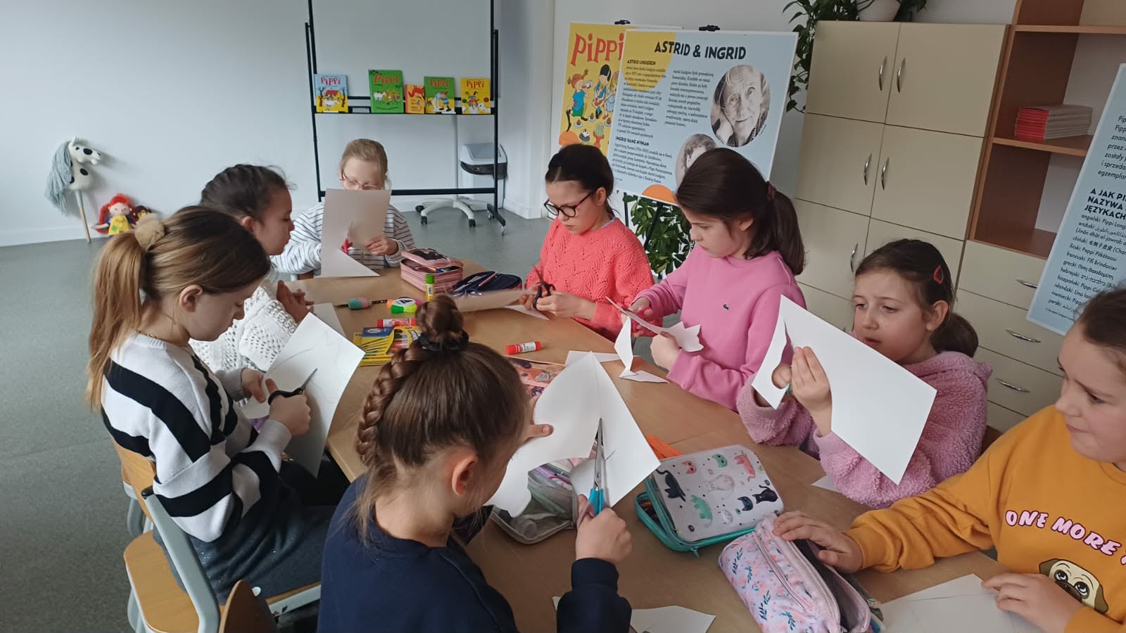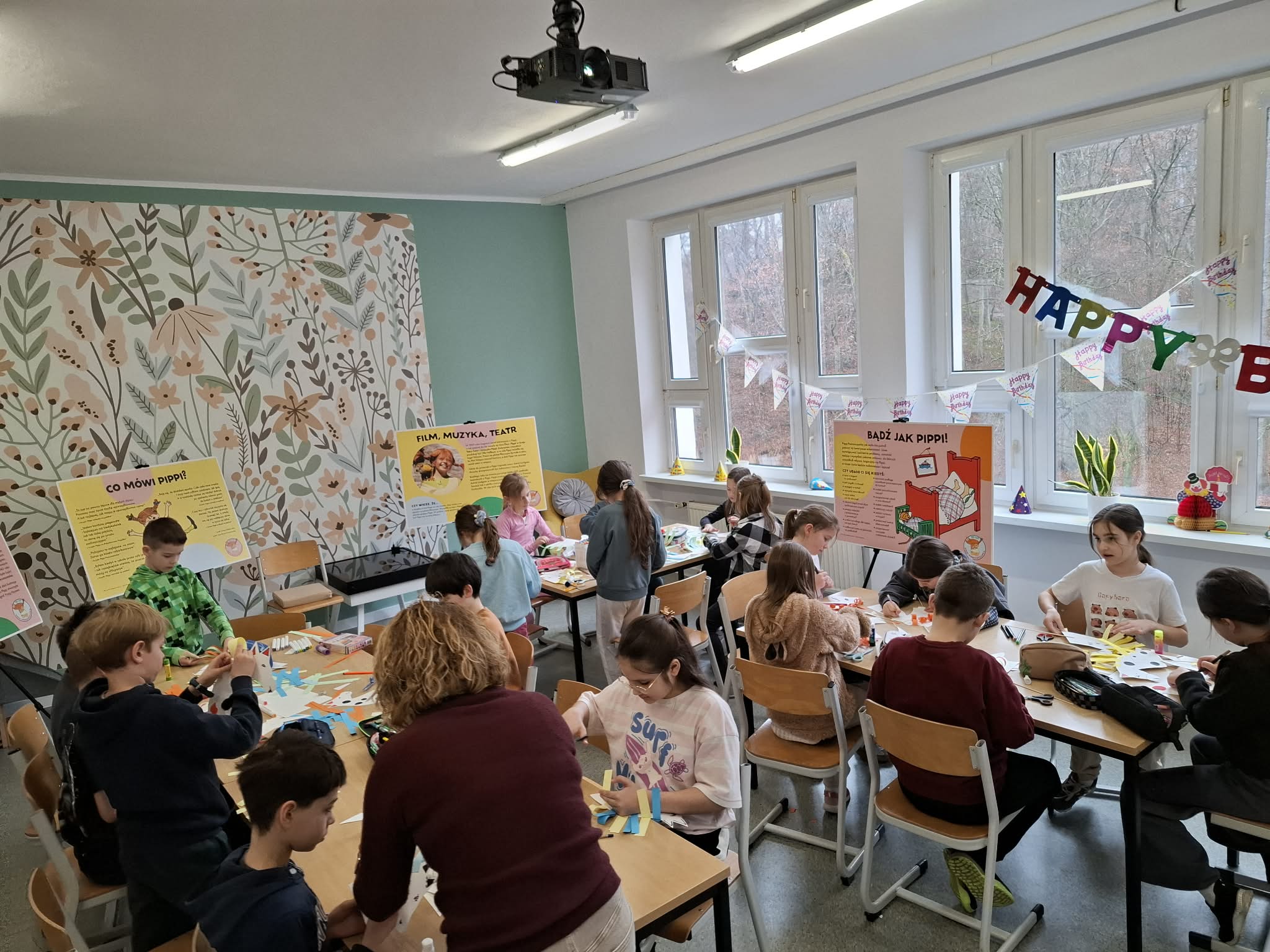 Ostatnio uczniowie klas młodszych wzięli udział w wyjątkowych warsztatach czytelniczo‑plastycznych, zorganizowanych przez szkolną bibliotekę. Zajęcia odbyły się w otoczeniu wielkoformatowej wystawy „80-te urodziny Pippi”, wypożyczonej z wydawnictwa Zakamarki, która przyciągała uwagę barwnymi ilustracjami i ciekawymi cytatami.