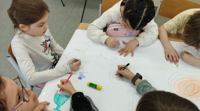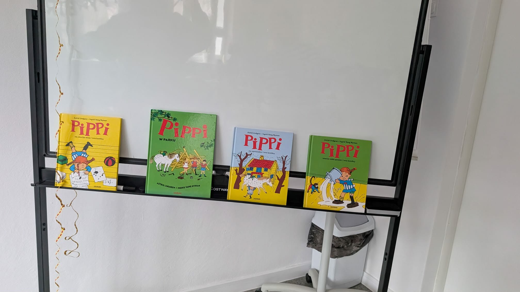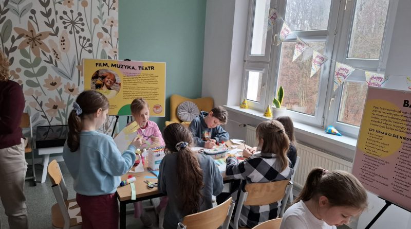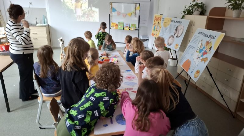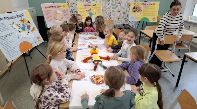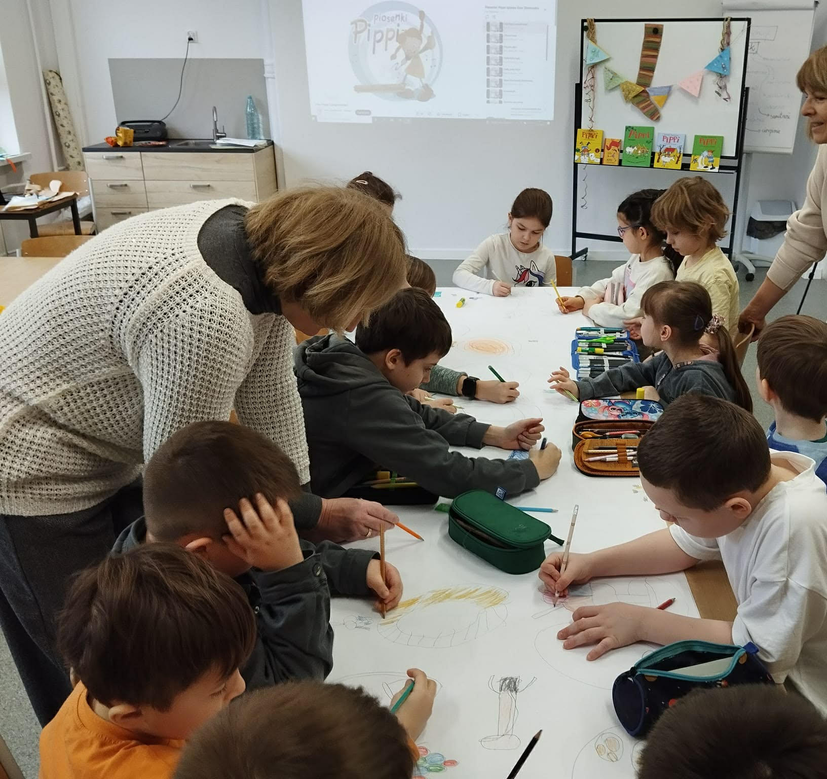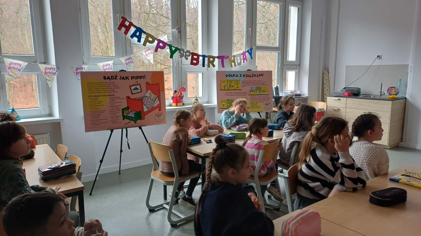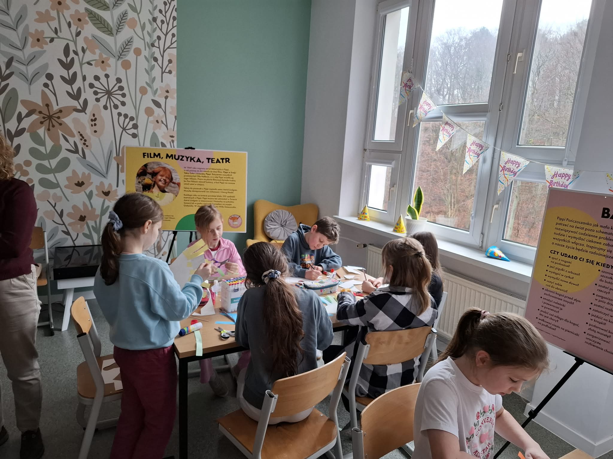 Ostatnio uczniowie klas młodszych wzięli udział w wyjątkowych warsztatach czytelniczo‑plastycznych, zorganizowanych przez szkolną bibliotekę. Zajęcia odbyły się w otoczeniu wielkoformatowej wystawy „80-te urodziny Pippi”, wypożyczonej z wydawnictwa Zakamarki, która przyciągała uwagę barwnymi ilustracjami i ciekawymi cytatami.