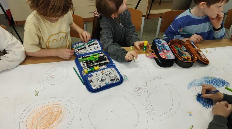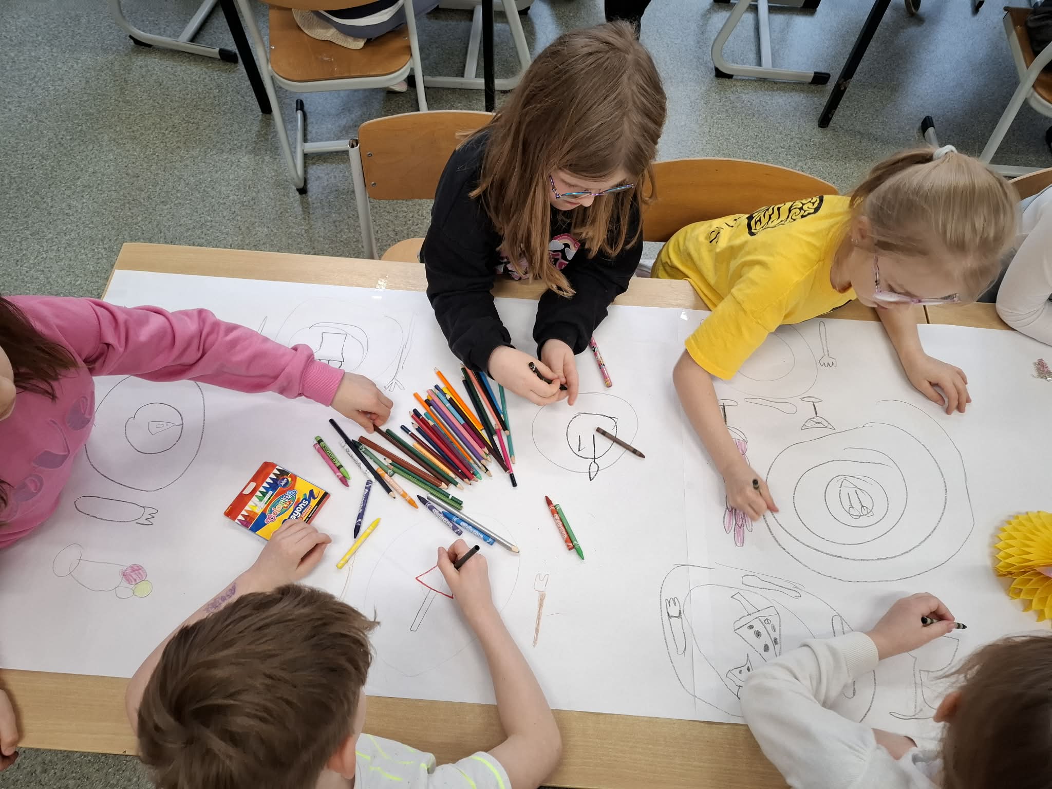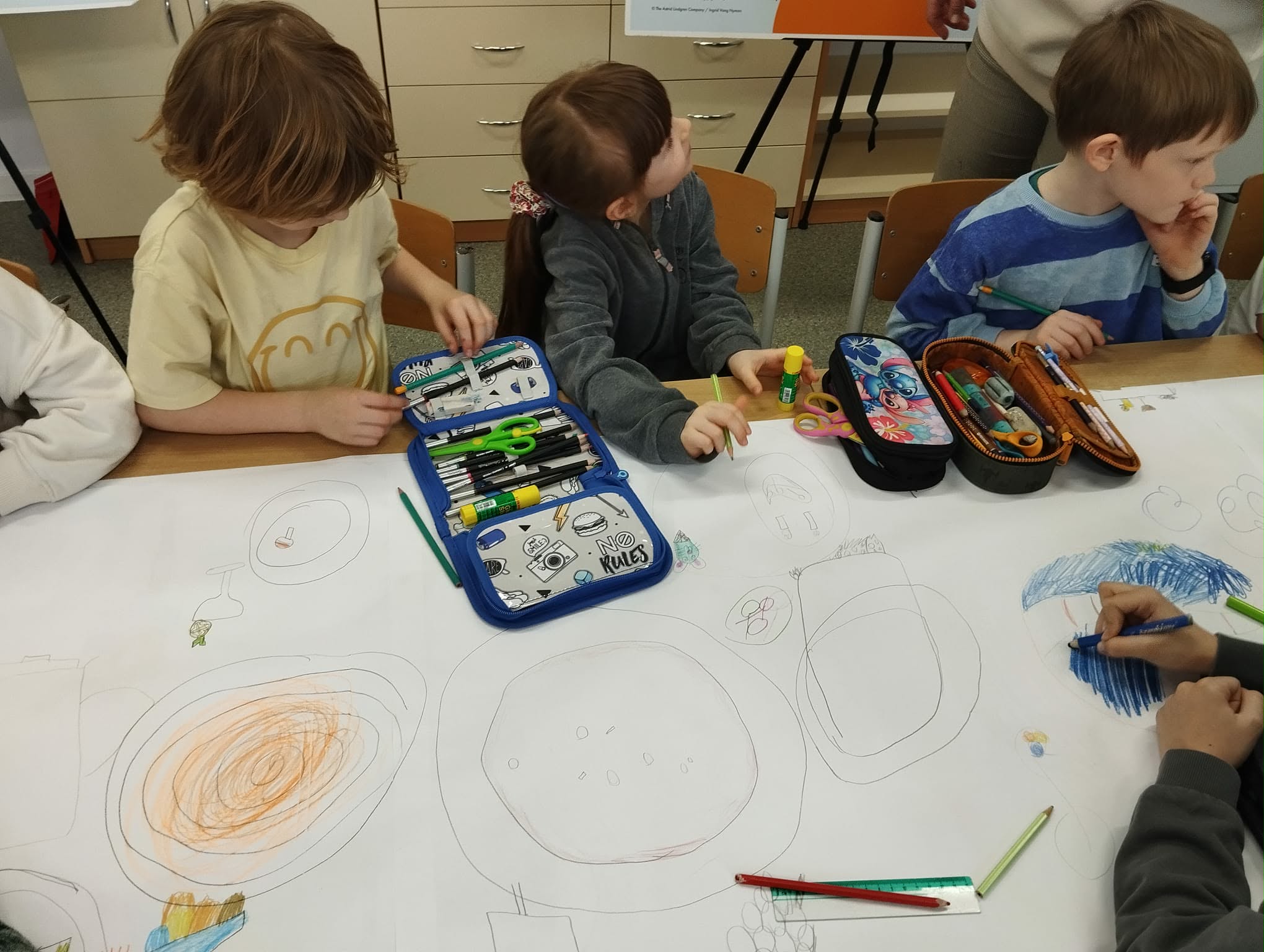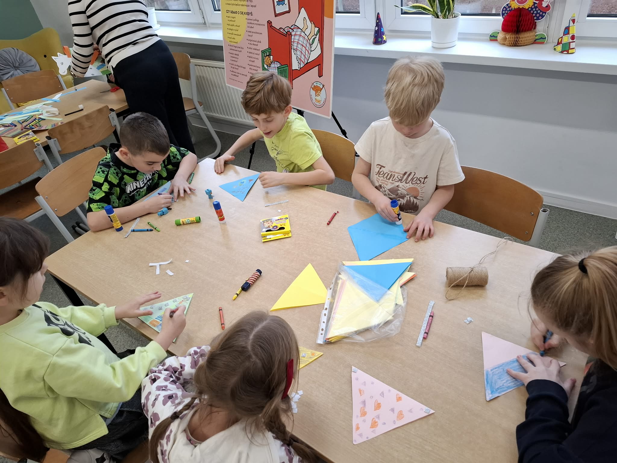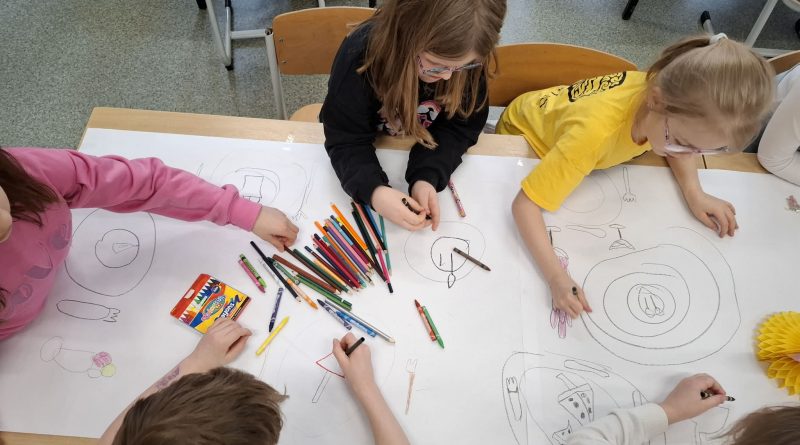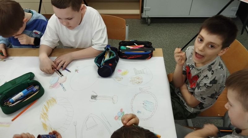 - Młodsi koledzy przygotowywali kolorowe, urodzinowe girlandy, a niektórzy tworzyli własne projekty urodzinowego obrusu oraz słodkiego przyjęcia dla Pippi.