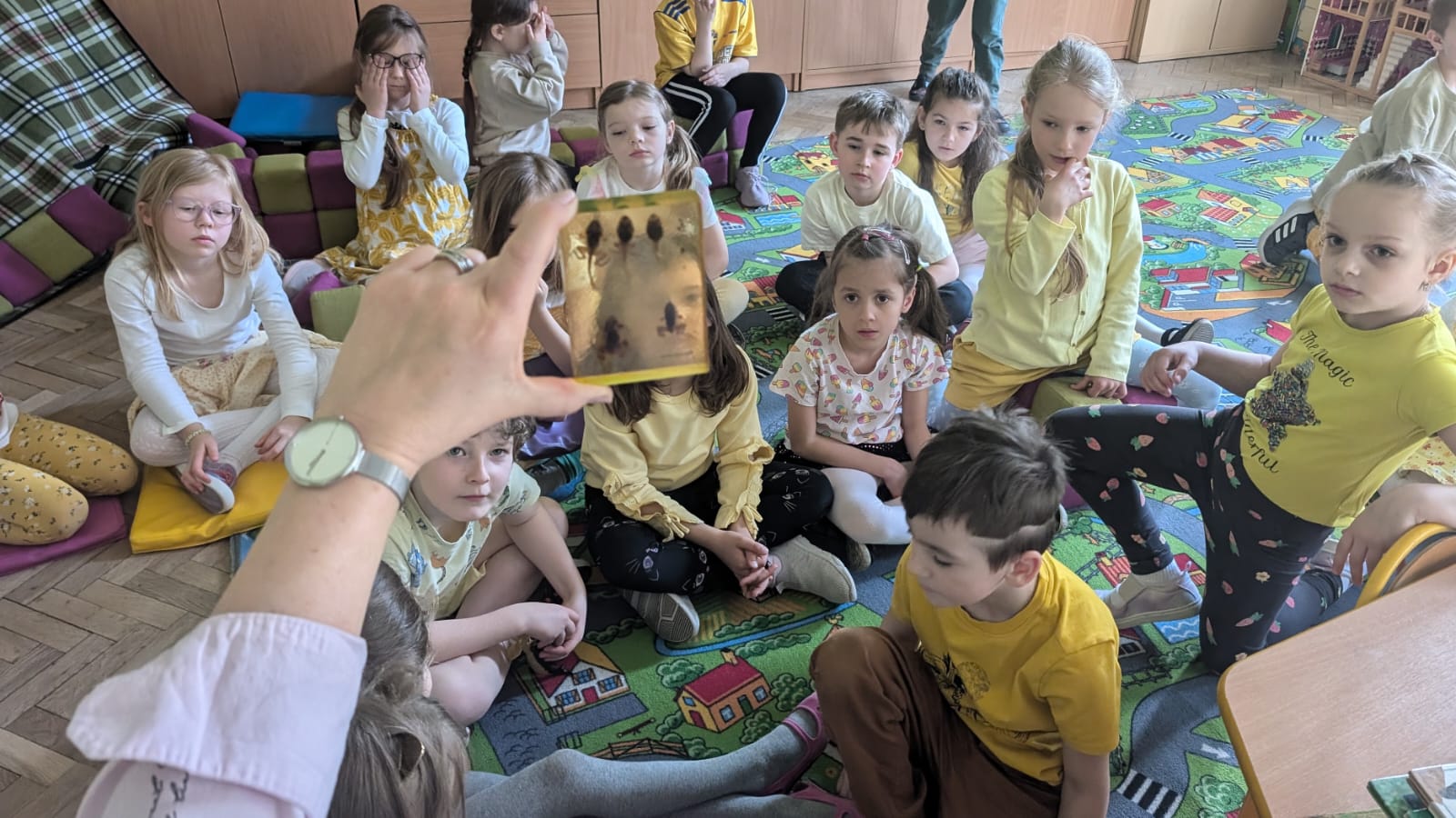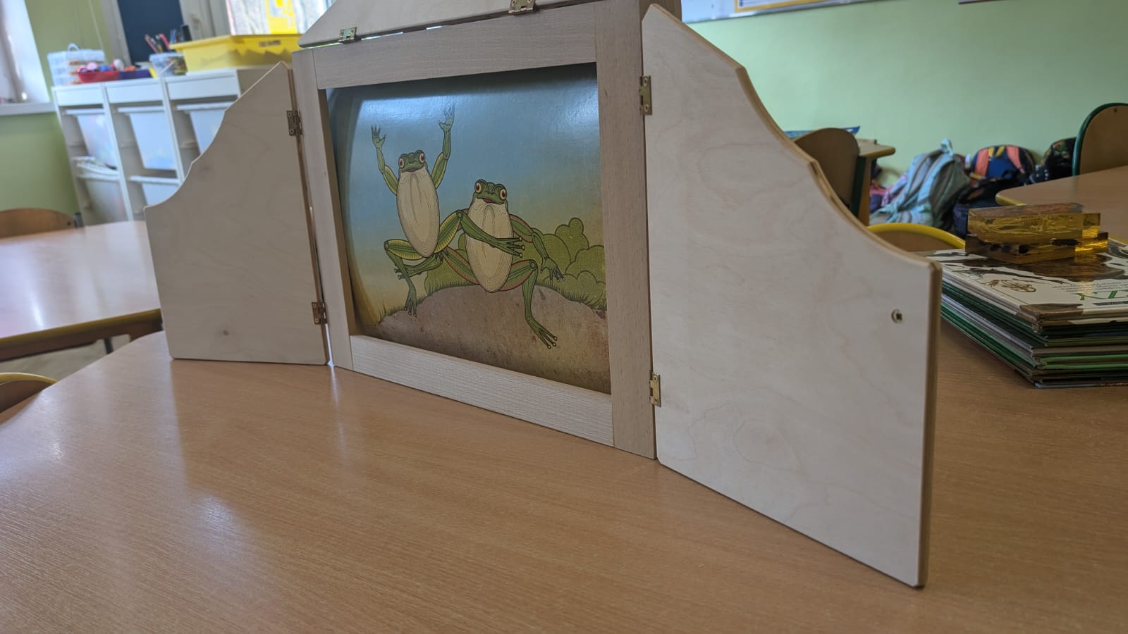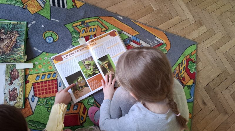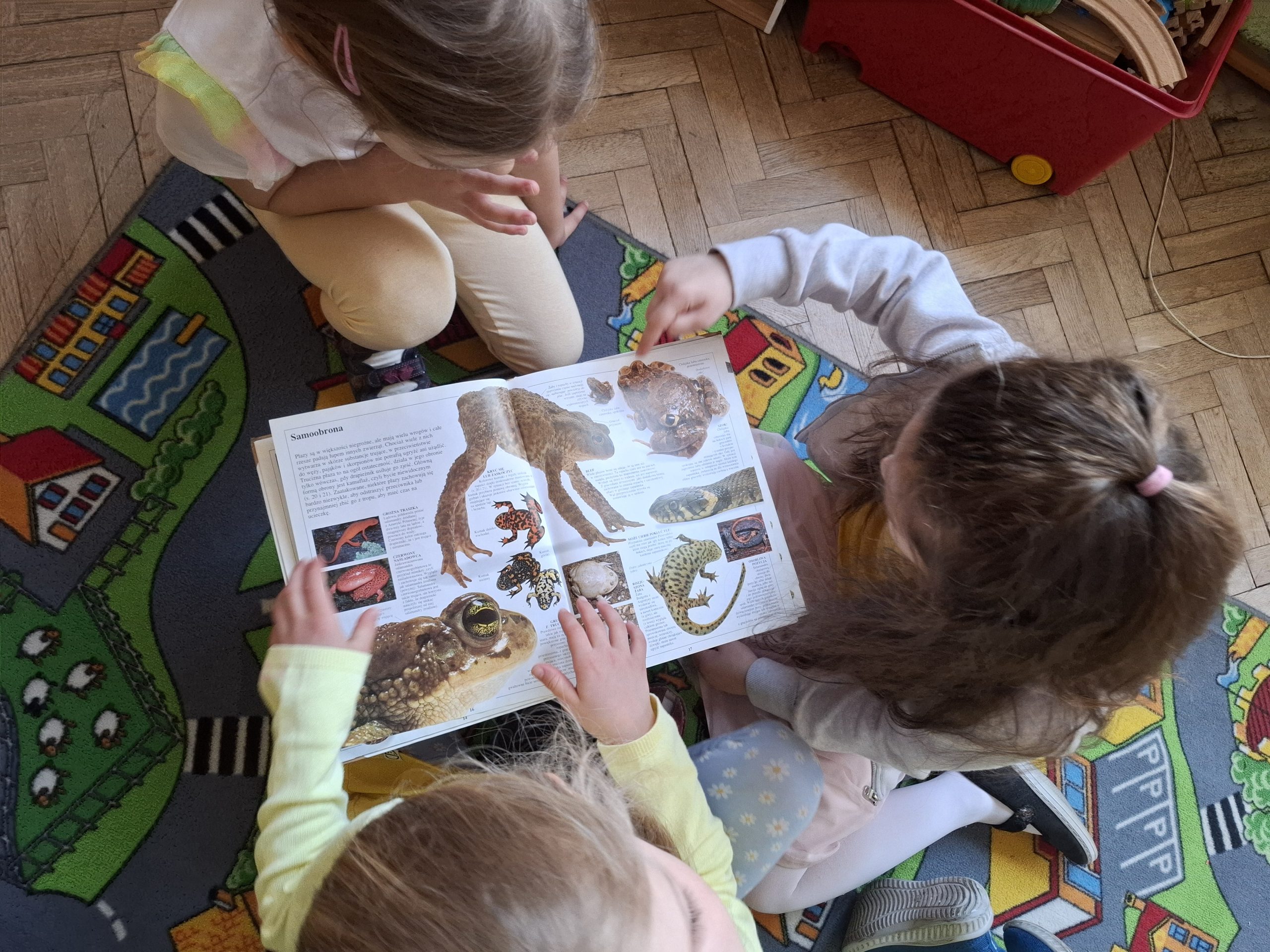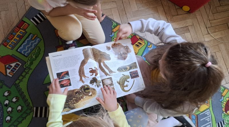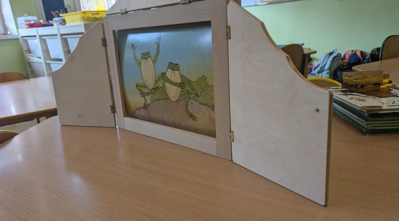 Z okazji ukończenia bloku tematycznego o łące, do klasy zerowej przybył biblioteczny teatrzyk kamishibai z japońską bajką filozoficzną o żabach. To klasyczna przypowieść, dzięki której można przekonać się, jak poglądy podlegają uwarunkowaniom, a jedno wydarzenie może wpłynąć na nasz sposób myślenia i sposób myślenia wielu osób wokół nas. Przed bajką dzieci miały okazję zapoznać się z wieloma bibliotecznymi książkami o płazach, obejrzeć prezentację z ciekawostkami o żabach oraz zapoznać się z ich budową oraz cyklem rozwojowym. Podczas zajęć nie zabrakło też „żabiej” piosenki, a wspólnie spędzony czas zakończył się wykonaniem wspaniałych papierowych żabek.