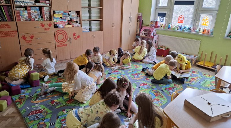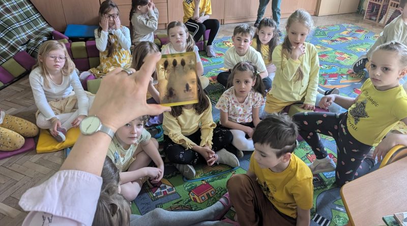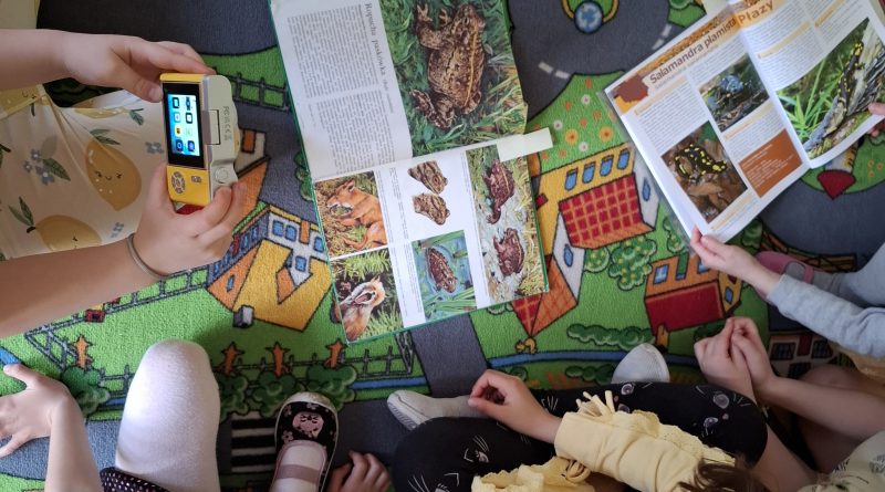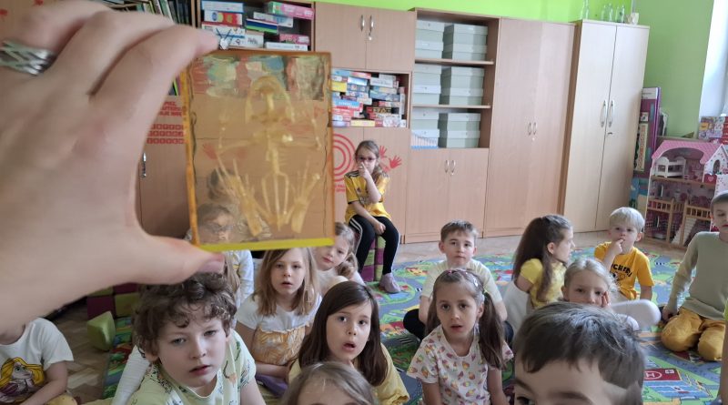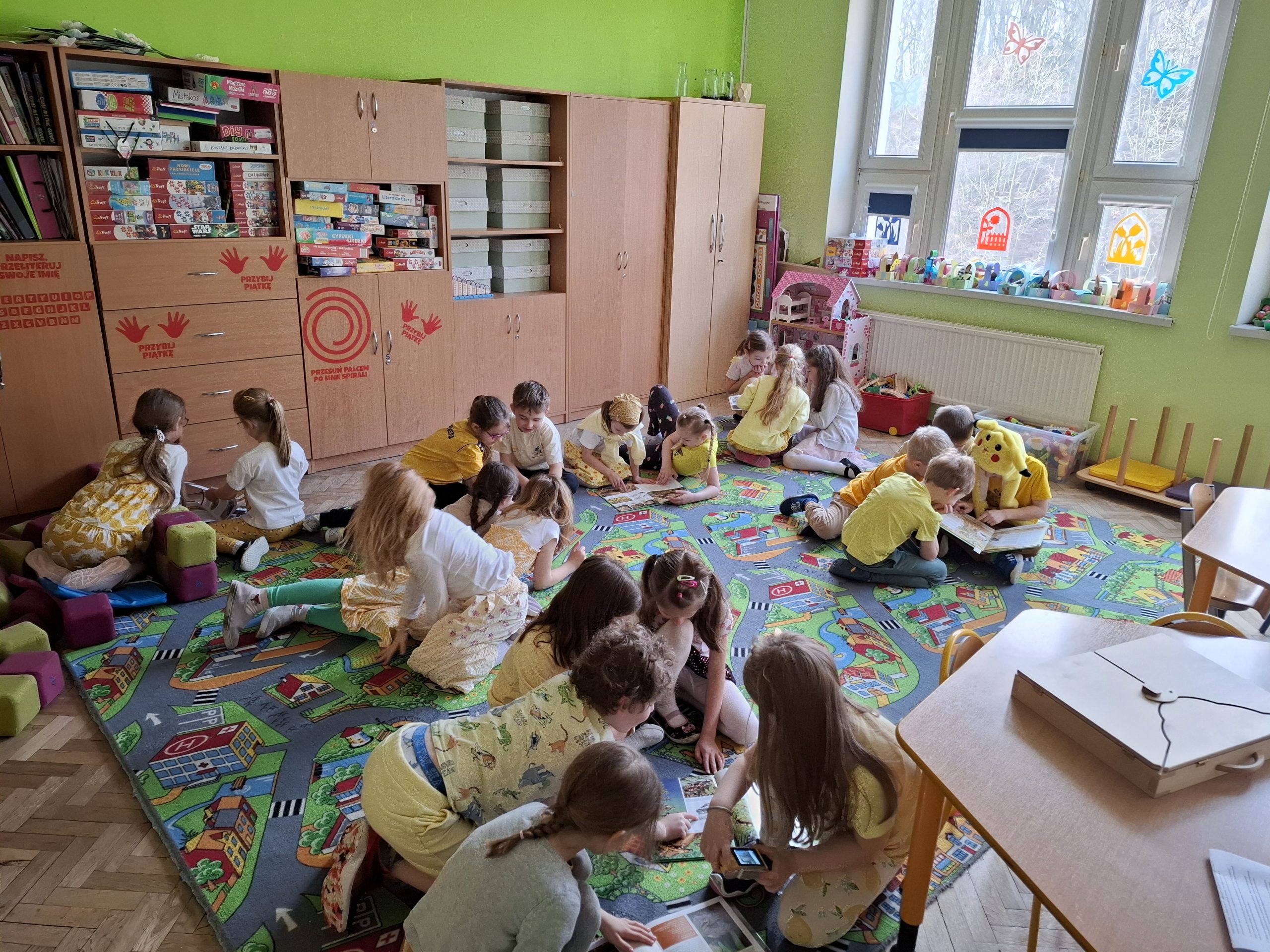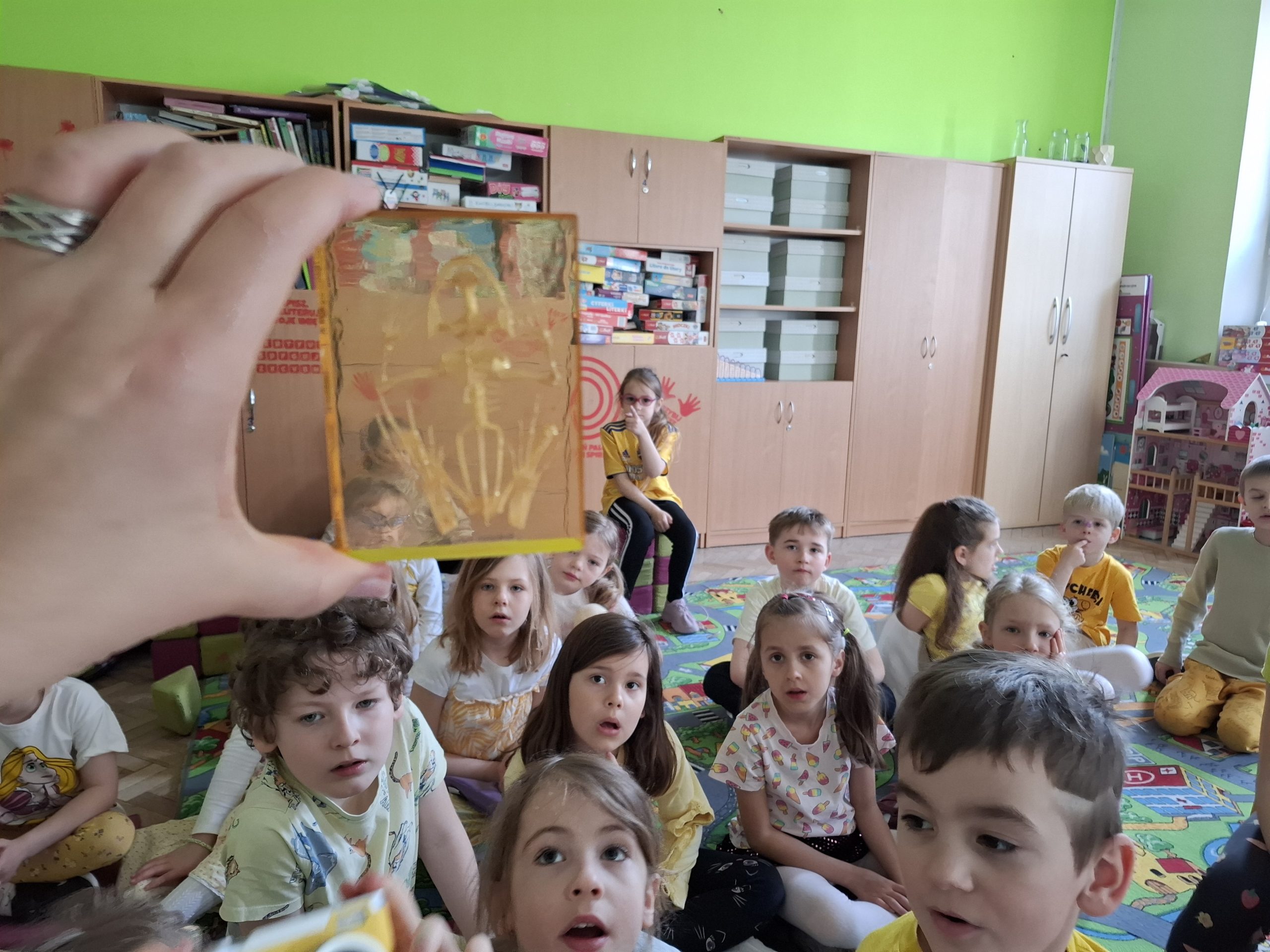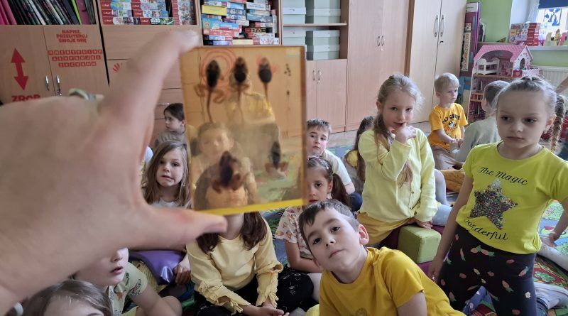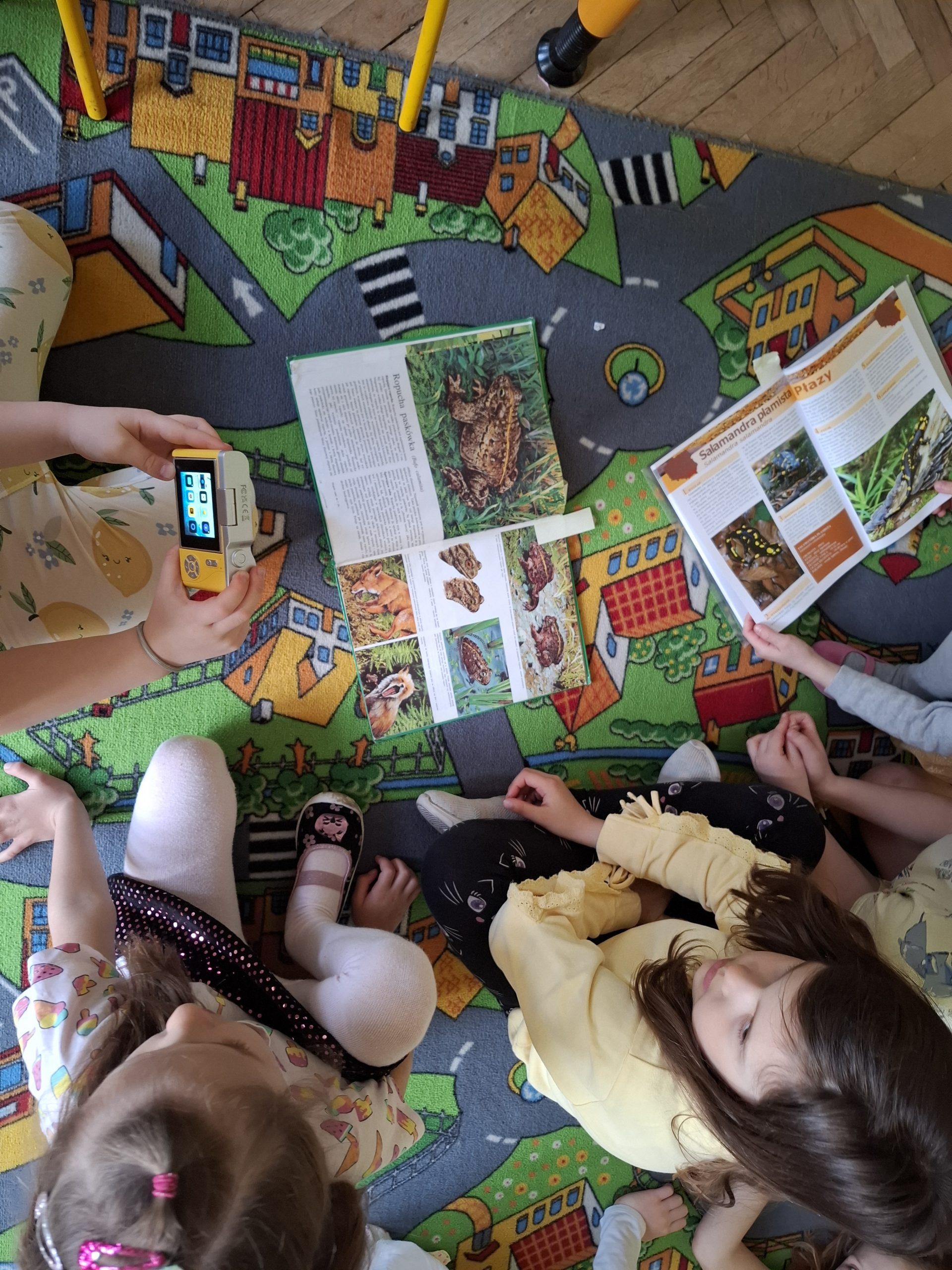 Z okazji ukończenia bloku tematycznego o łące, do klasy zerowej przybył biblioteczny teatrzyk kamishibai z japońską bajką filozoficzną o żabach. To klasyczna przypowieść, dzięki której można przekonać się, jak poglądy podlegają uwarunkowaniom, a jedno wydarzenie może wpłynąć na nasz sposób myślenia i sposób myślenia wielu osób wokół nas. Przed bajką dzieci miały okazję zapoznać się z wieloma bibliotecznymi książkami o płazach, obejrzeć prezentację z ciekawostkami o żabach oraz zapoznać się z ich budową oraz cyklem rozwojowym. Podczas zajęć nie zabrakło też „żabiej” piosenki, a wspólnie spędzony czas zakończył się wykonaniem wspaniałych papierowych żabek.